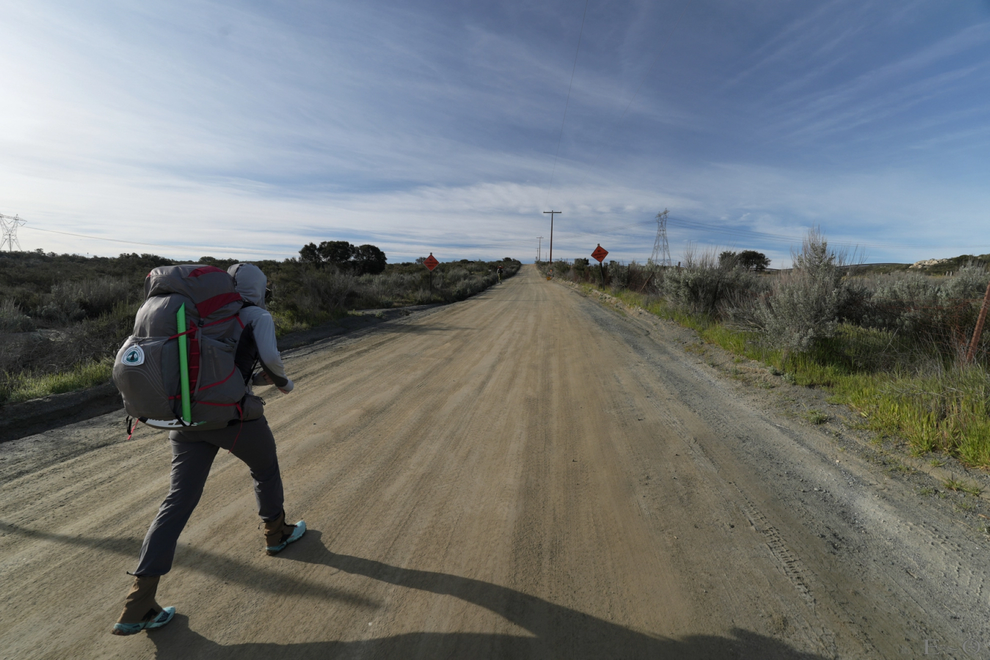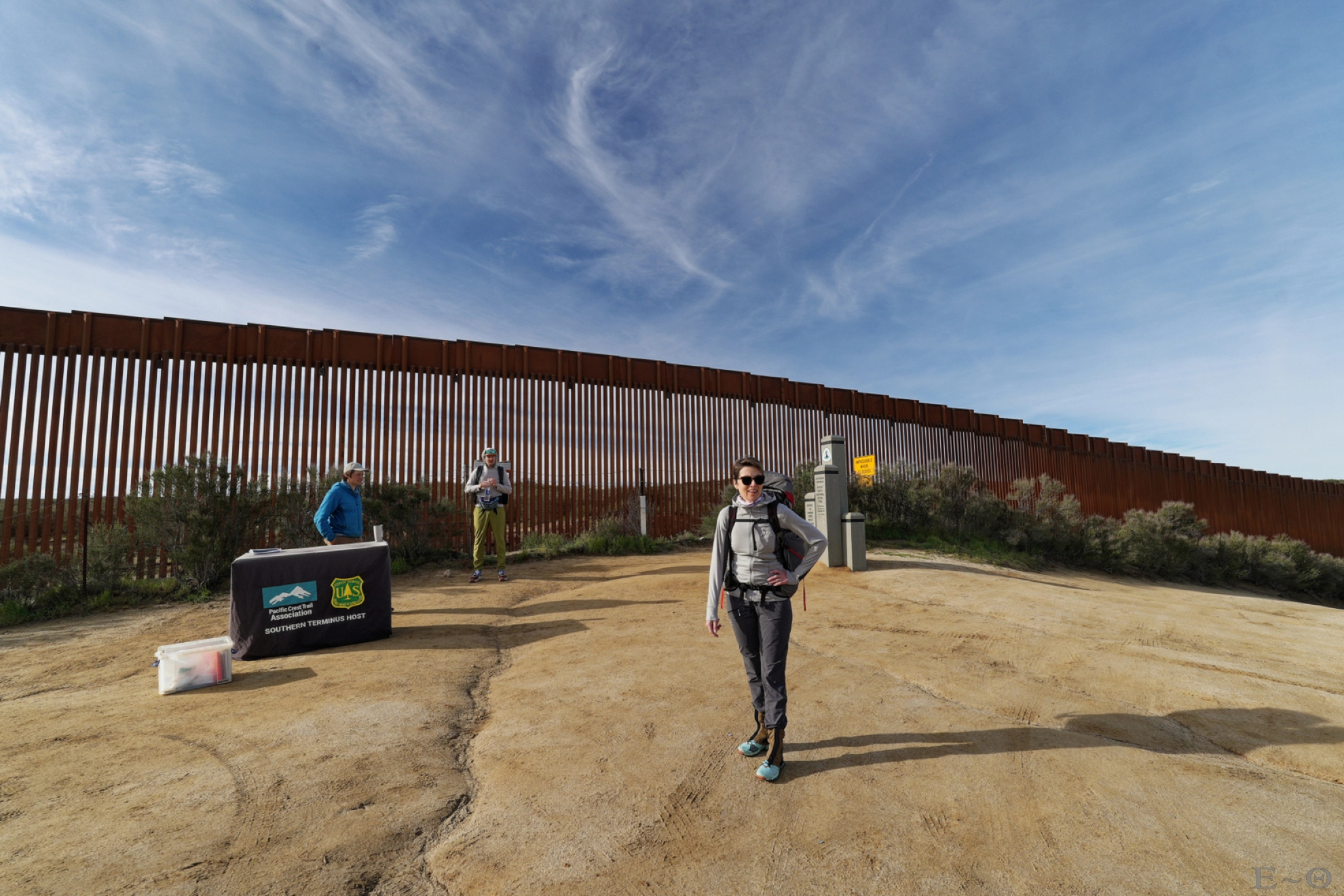 Nous voilà devant et au pied du Mur, frontière entre le Mexique et les États-Unis. Le monument du PCT, si caractéristique est là, isolé au milieu d’une zone de terre aride. Une demi-heure plus tôt, nous avons quitté CLEEF, où nous avons dormi la veille, marché vers le sud, à rebours et en montée sur le PCT, pour être au départ officiel.