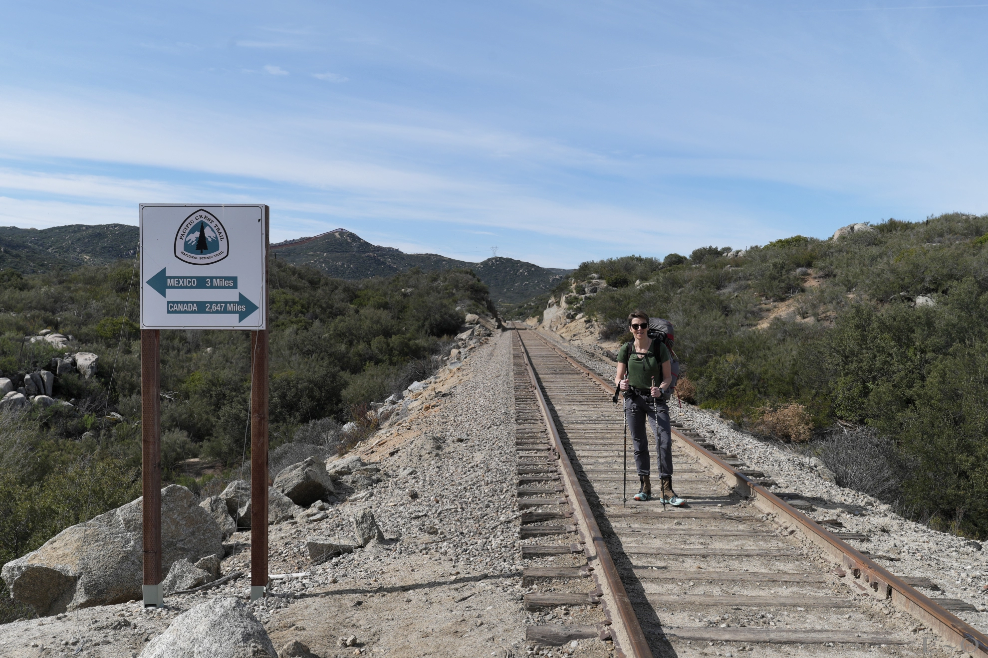 Après un démarrage comprenant photos de départ, et dernier regard vers le sud, nous sommes d’emblée dans l’ambiance. Les cactus sont omniprésents, et nous croisons un serpent inoffensif dès le miles 3. Au miles 4, nous franchissons « l’impossible raillroad », The San Diego and Arizona Eastern Railway, voie ferrée abandonnée depuis 2008.