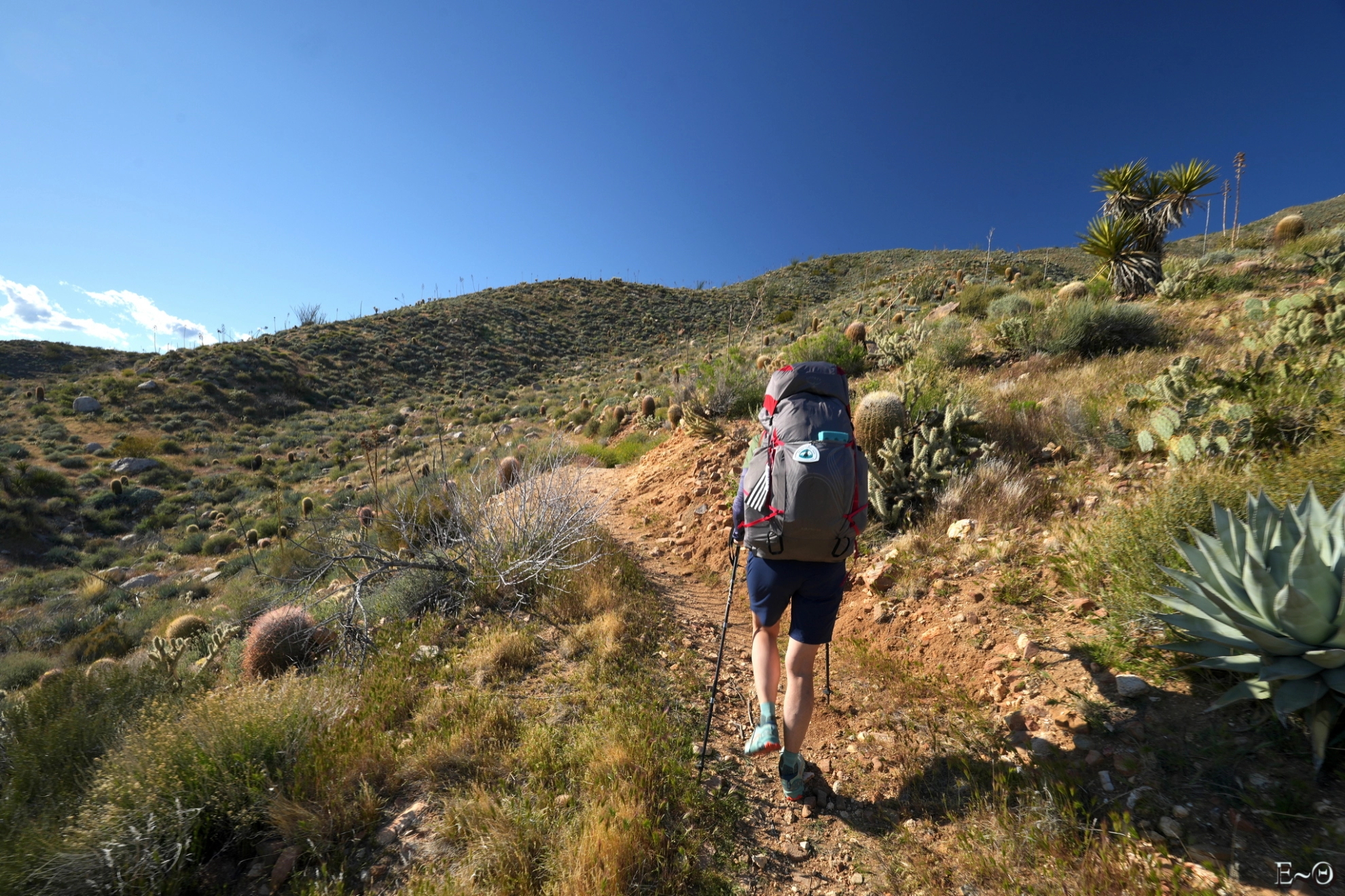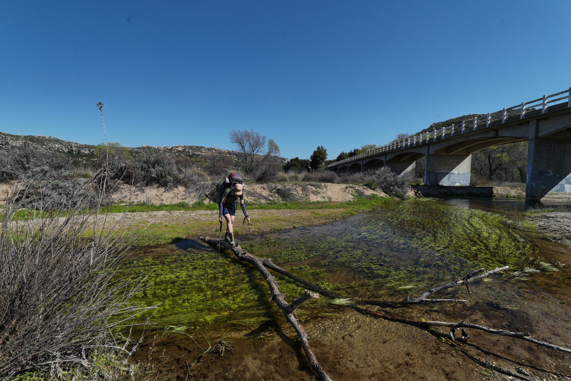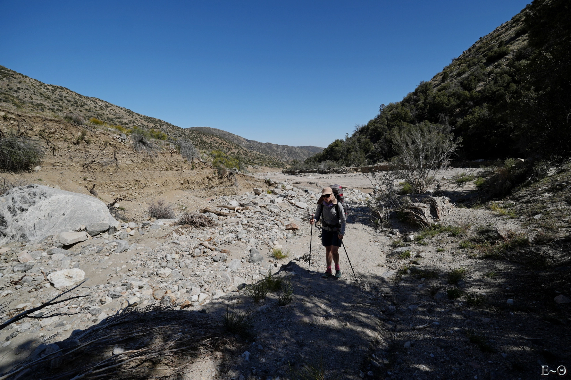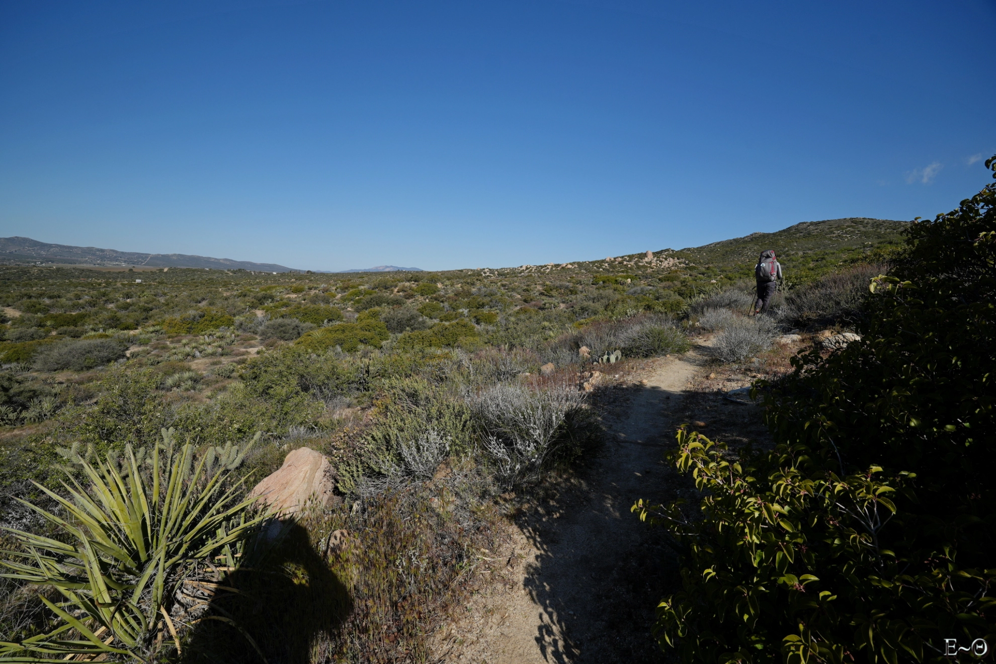 Sur cette première partie du PCT, il n’existe pas de difficulté majeure de ravitaillement et cela contribue à limiter la charge portée. C’est plutôt une aubaine car c’est ici que commence un portage qui va durer… des mois. Ceci explique pourquoi la préparation logistique est essentielle. Ceci explique aussi pourquoi la majorité des randonneurs n’emporte comme appareil photo qu’un smartphone. Quelques amateurs emportent au choix un appareil expert compact ou plus rarement un hybride plein format. La fréquence des zones sableuses, voire des zones brulées avec cendres sur cette partie du PCT constitue une menace pour la santé du matériel, et il est très difficile d’échapper aux poussières sur les capteurs.