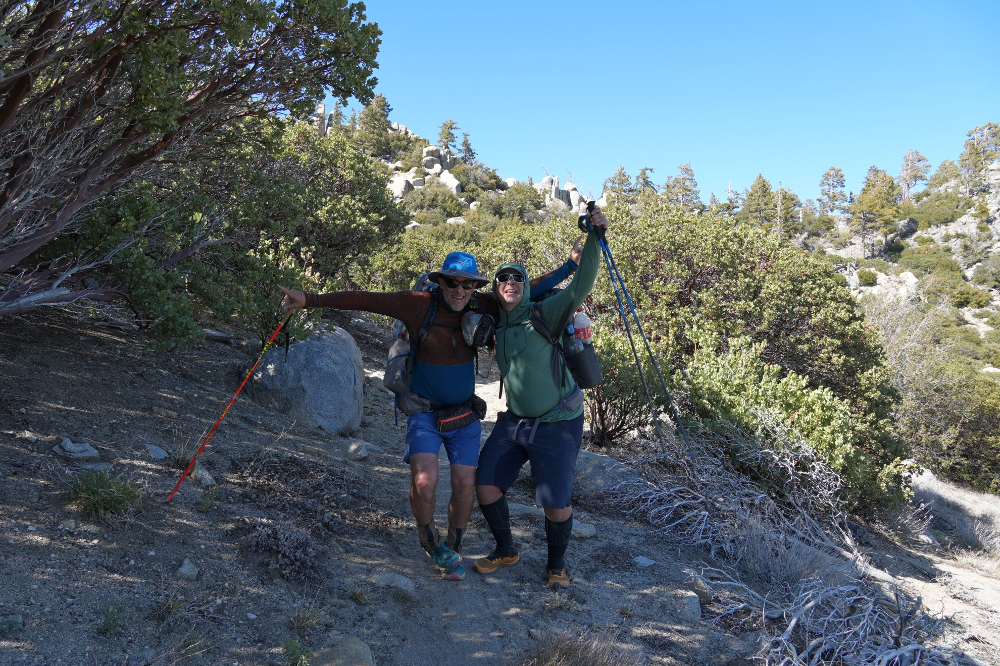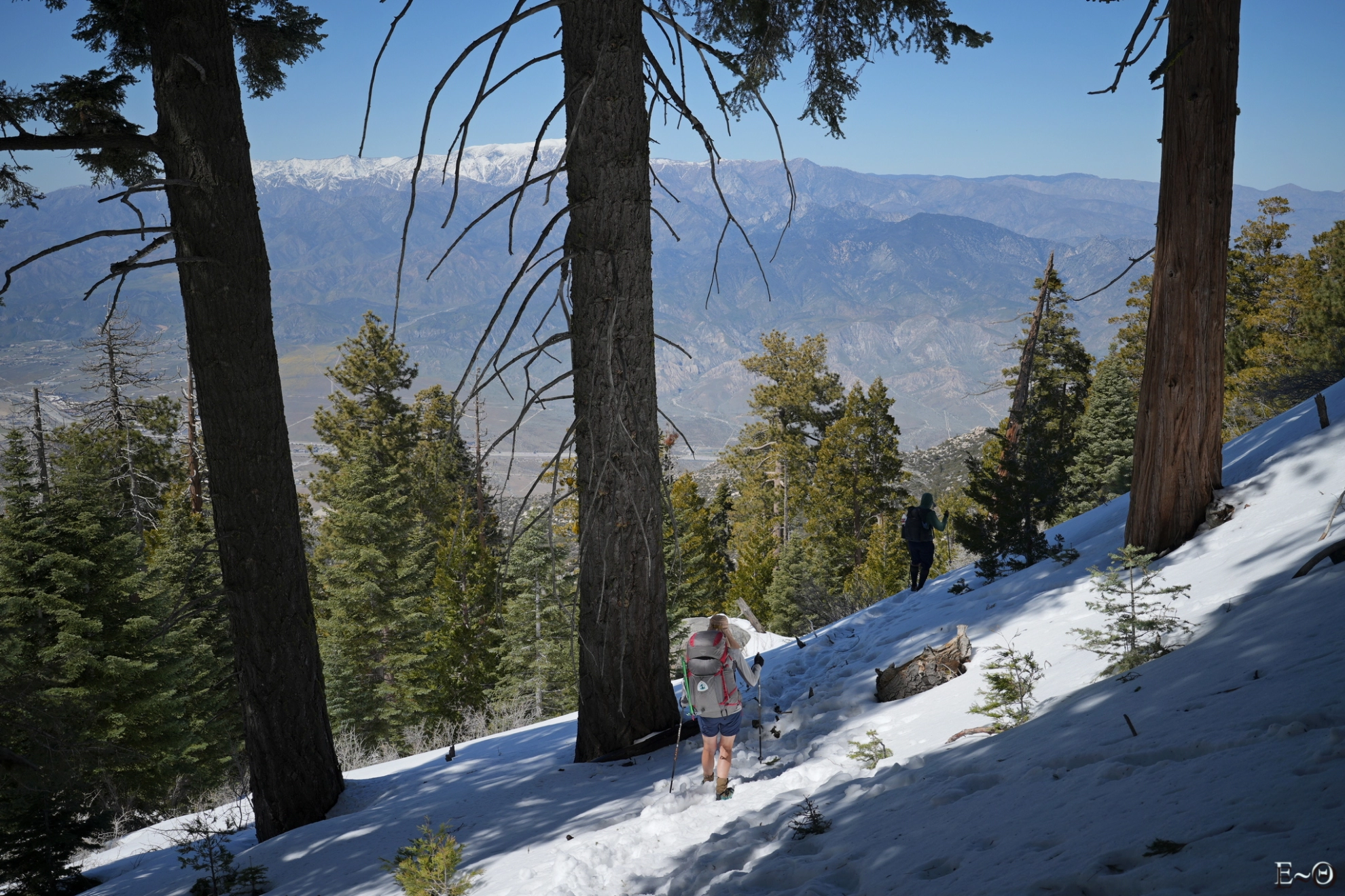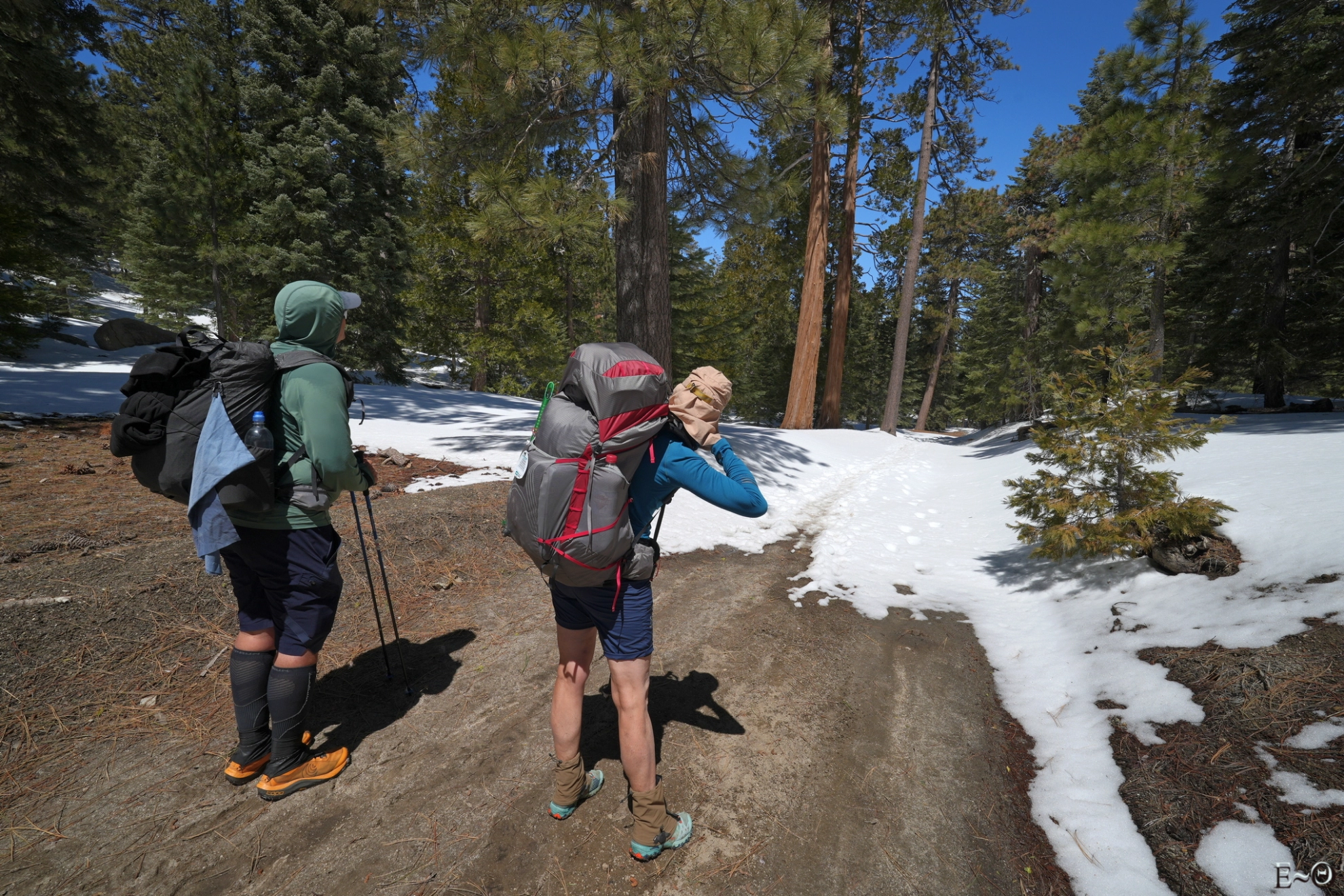 La date de départ est déterminante. A partir des mois de mai et juin les températures peuvent atteindre 35-40°C dans certains passages et la plupart des points d’eau sont à sec. La présence et l’aide de « trail angels » ne suffit pas à gommer les difficultés résultantes. Un départ en avril ou début mai est donc vivement conseillé. Dans notre cas, le départ au 28 mars nous a permis d’être à l’abri des fortes températures et de l’absence de points d’eau. Par contre, c’est la présence de neige en altitude qui nous a posé problème. En masquant la trace, elle a contraint à une navigation compliquée, impliquant l’usage de crampons et de piolets sur les sections gelées en haute altitude (Mont San Jacinto, Big Bear, Baden-Powell…), et ralentit considérablement la marche lorsque la fonte, avec « postholing », ou enfoncement brutal au travers de la croute superficielle jusqu’aux cuisses ou la taille.