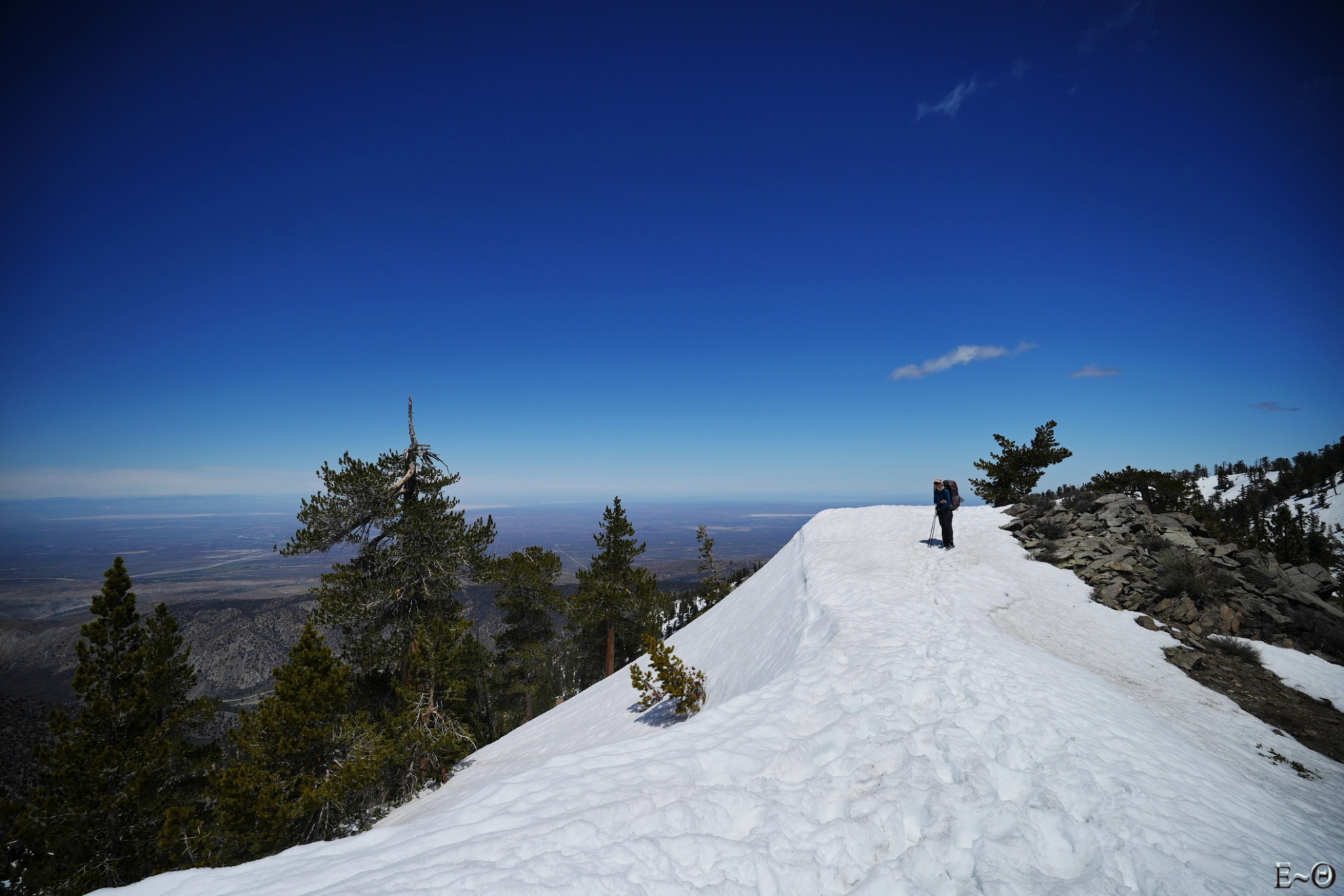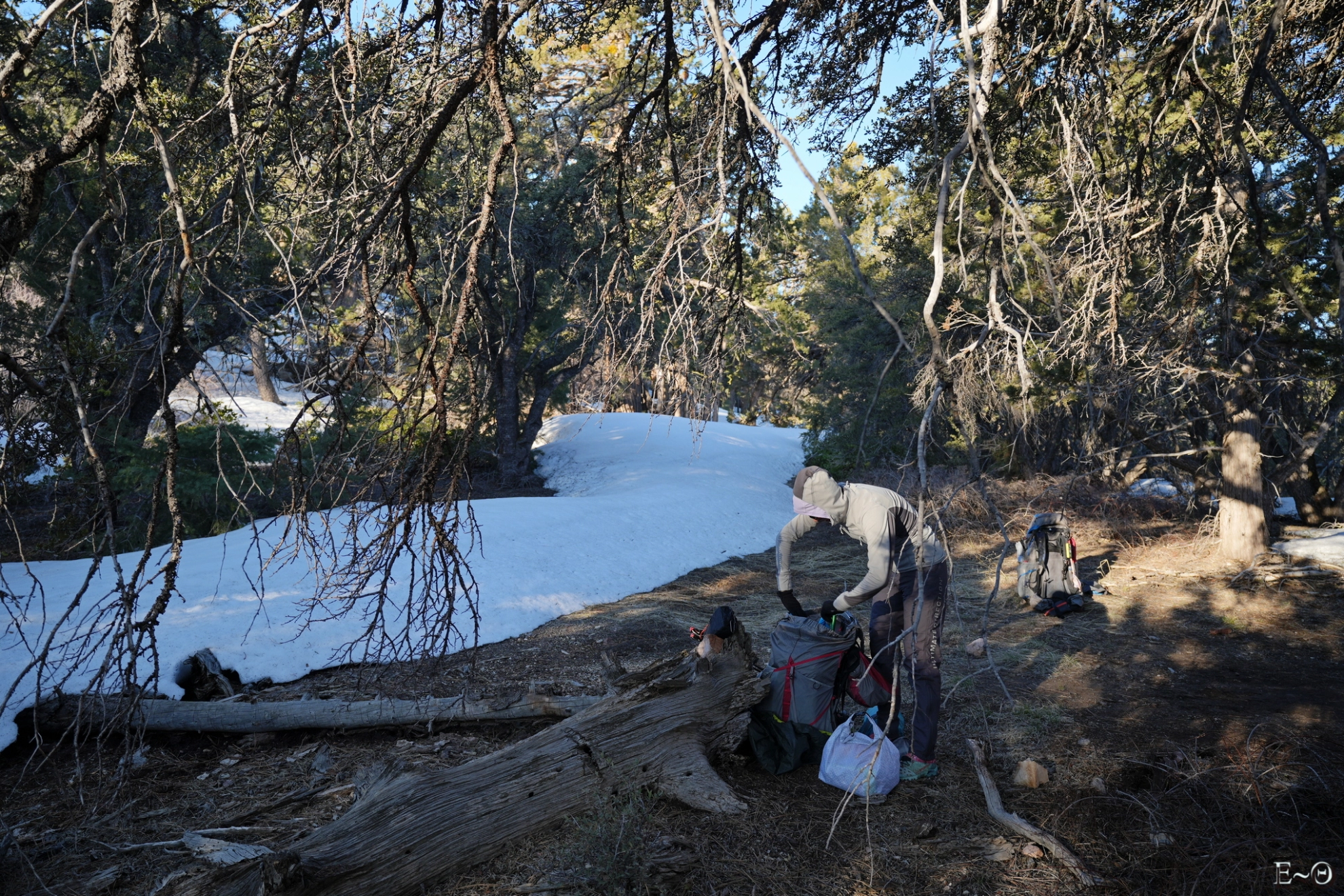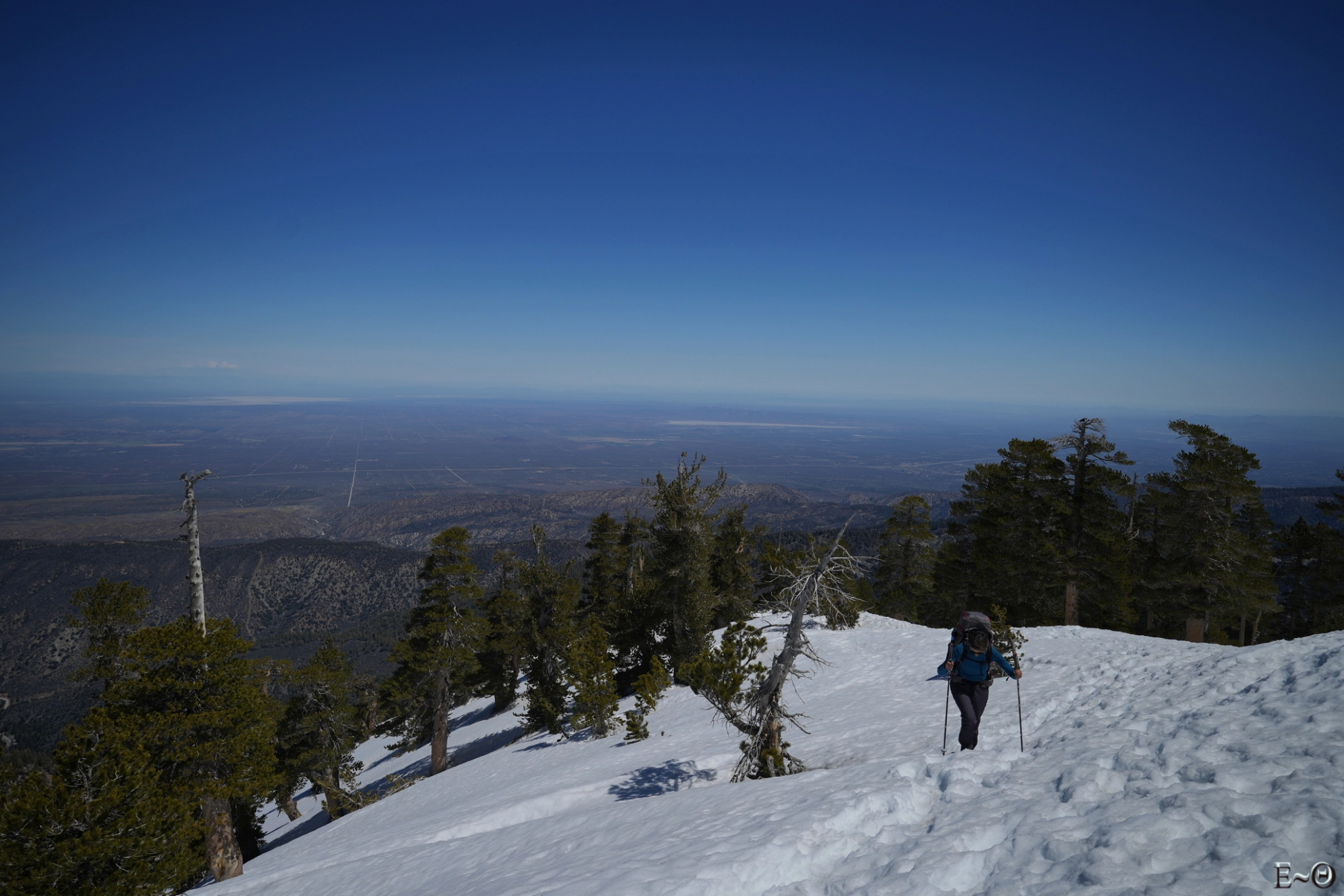 La date de départ est déterminante. A partir des mois de mai et juin les températures peuvent atteindre 35-40°C dans certains passages et la plupart des points d’eau sont à sec. La présence et l’aide de « trail angels » ne suffit pas à gommer les difficultés résultantes. Un départ en avril ou début mai est donc vivement conseillé. Dans notre cas, le départ au 28 mars nous a permis d’être à l’abri des fortes températures et de l’absence de points d’eau. Par contre, c’est la présence de neige en altitude qui nous a posé problème. En masquant la trace, elle a contraint à une navigation compliquée, impliquant l’usage de crampons et de piolets sur les sections gelées en haute altitude (Mont San Jacinto, Big Bear, Baden-Powell…), et ralentit considérablement la marche lorsque la fonte, avec « postholing », ou enfoncement brutal au travers de la croute superficielle jusqu’aux cuisses ou la taille.
