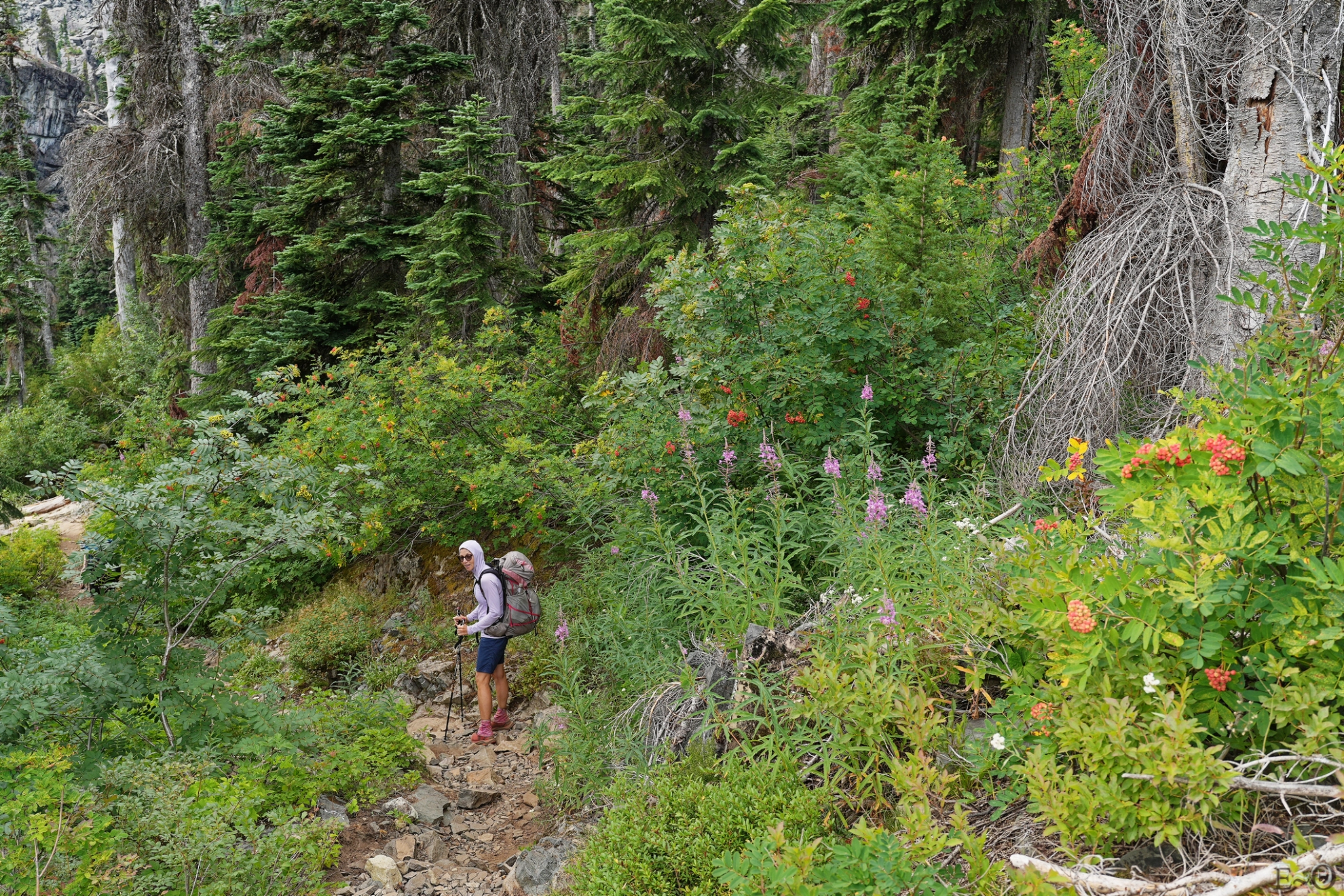 Cette dernière partie du PCT pourrait laisser à penser que c’est « presque terminé ». En un sens, c’est vrai, si l’on se fie à l’arithmétique. N’a-t-on pas passé récemment la borne 2 300 miles ? En pratique, il faut nuancer. D’abord parce qu’il reste quand même 269 miles, soit un « détail » de 432 km. Et ensuite parce que cette fin de parcours présente des difficultés spécifiques. La pluie et l’humidité en particulier, si la météo se dégrade au passage de randonneurs qui en ont perdu l’habitude. Il faut aussi tenir compte du fait que la piste comporte de longues ascensions exigeantes qui font baisser la vitesse autour de 3 km/h.
