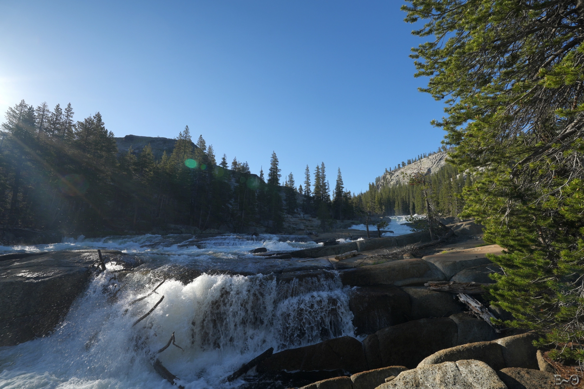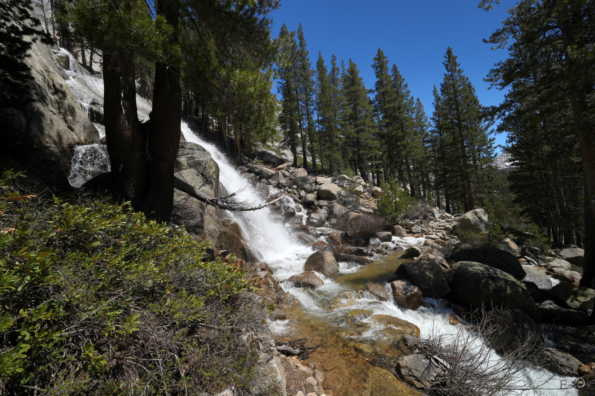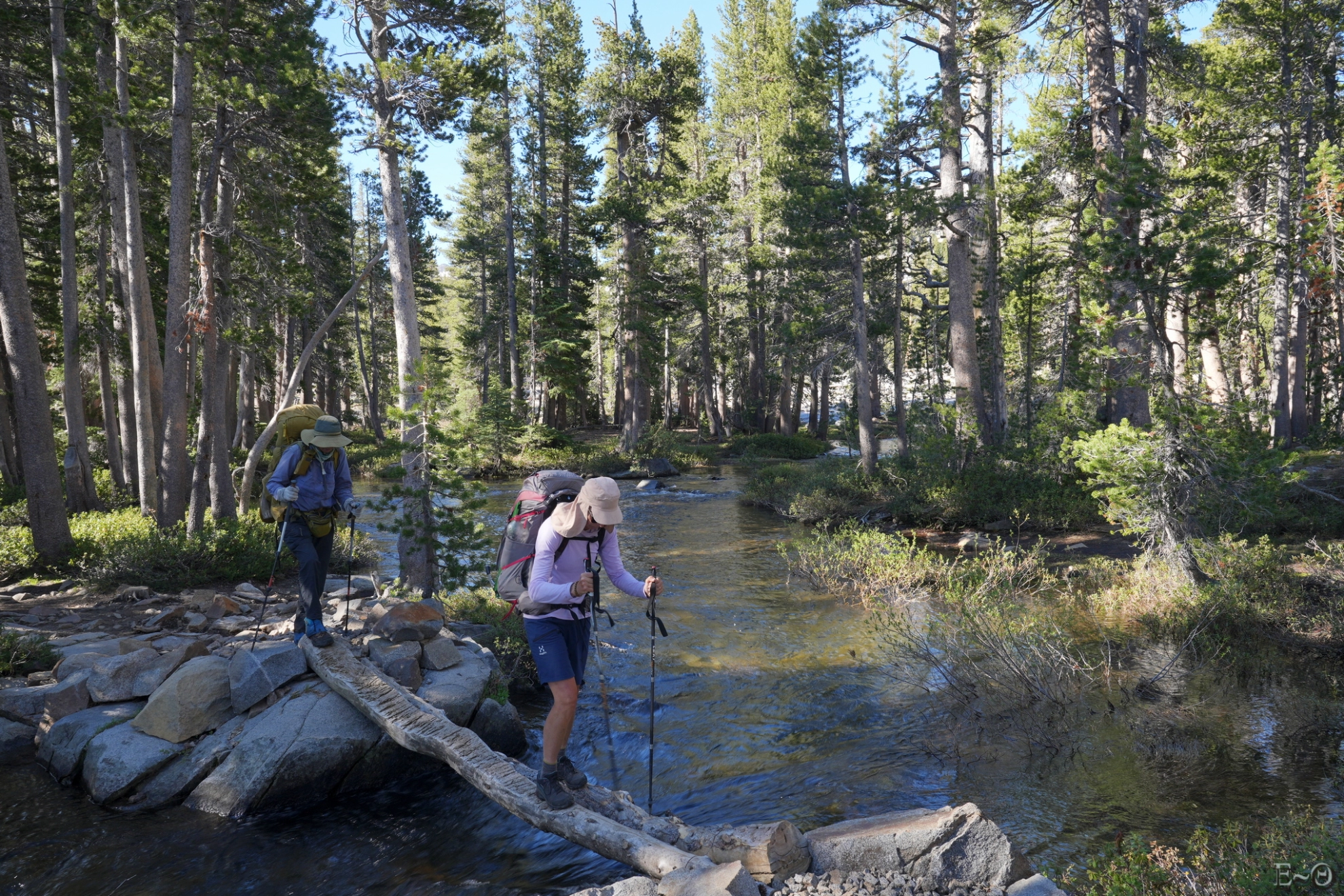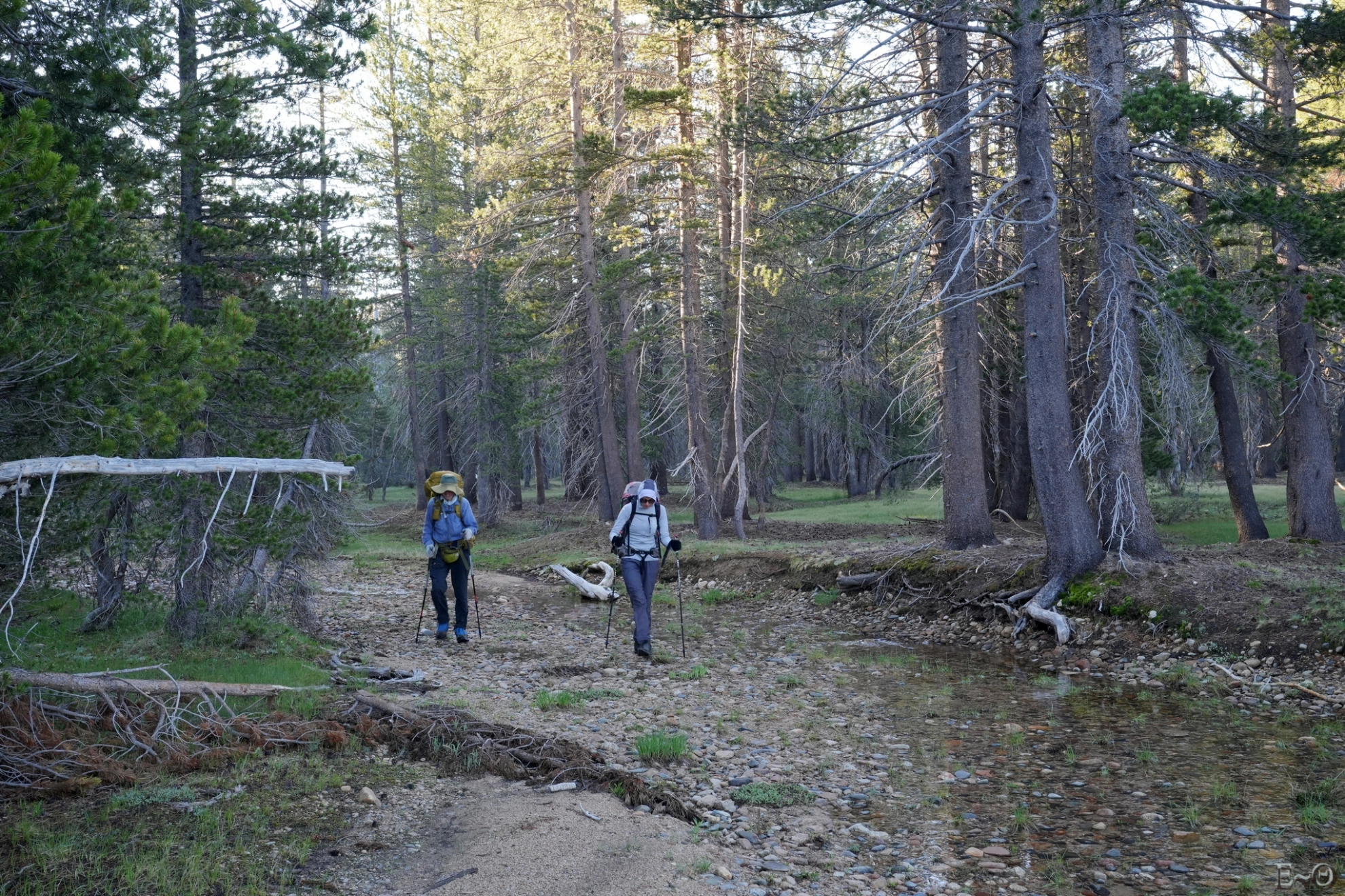 En outre, les franchissements de certains torrents sont réputés difficiles, selon l’état de la fonte des neiges. Sont mentionnés comme pouvant être critiques, les passages d’Evolution Creek, de San Joaquim Creek un peu en aval, puis plus loin celui de Bear Creek (Creek = torrent). Comme on le verra dans la séquence des jours détaillant la progression, au moment de franchir l’étape d’Evolution et de San Joaquim Creek, les rangers ont interdit momentanément les passages, contraignant à faire un long détour. Le franchissement des torrents varie de très facile, lorsque subsistent des ponts de neige praticables (à condition que ceux-ci ne s’effondrent pas pendant le passage), à facile lorsque les débits et les courants sont faibles. Mais ils peuvent aussi être modérément difficiles, voire très difficiles et dangereux en certaines circonstances. Des précautions sont alors à prévoir (technique des 3 points d’appui, de passage groupé afin de limiter la traînée…).
