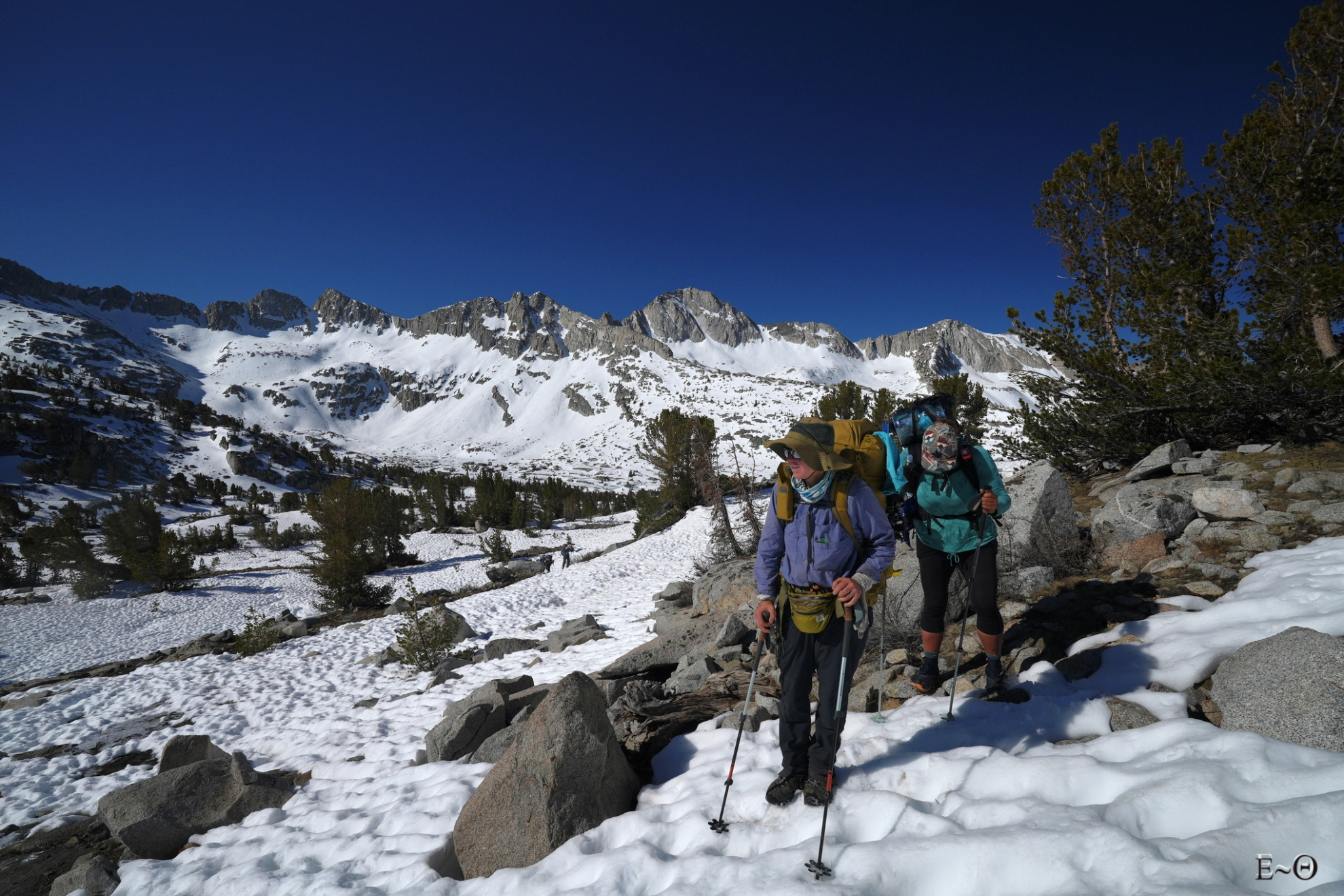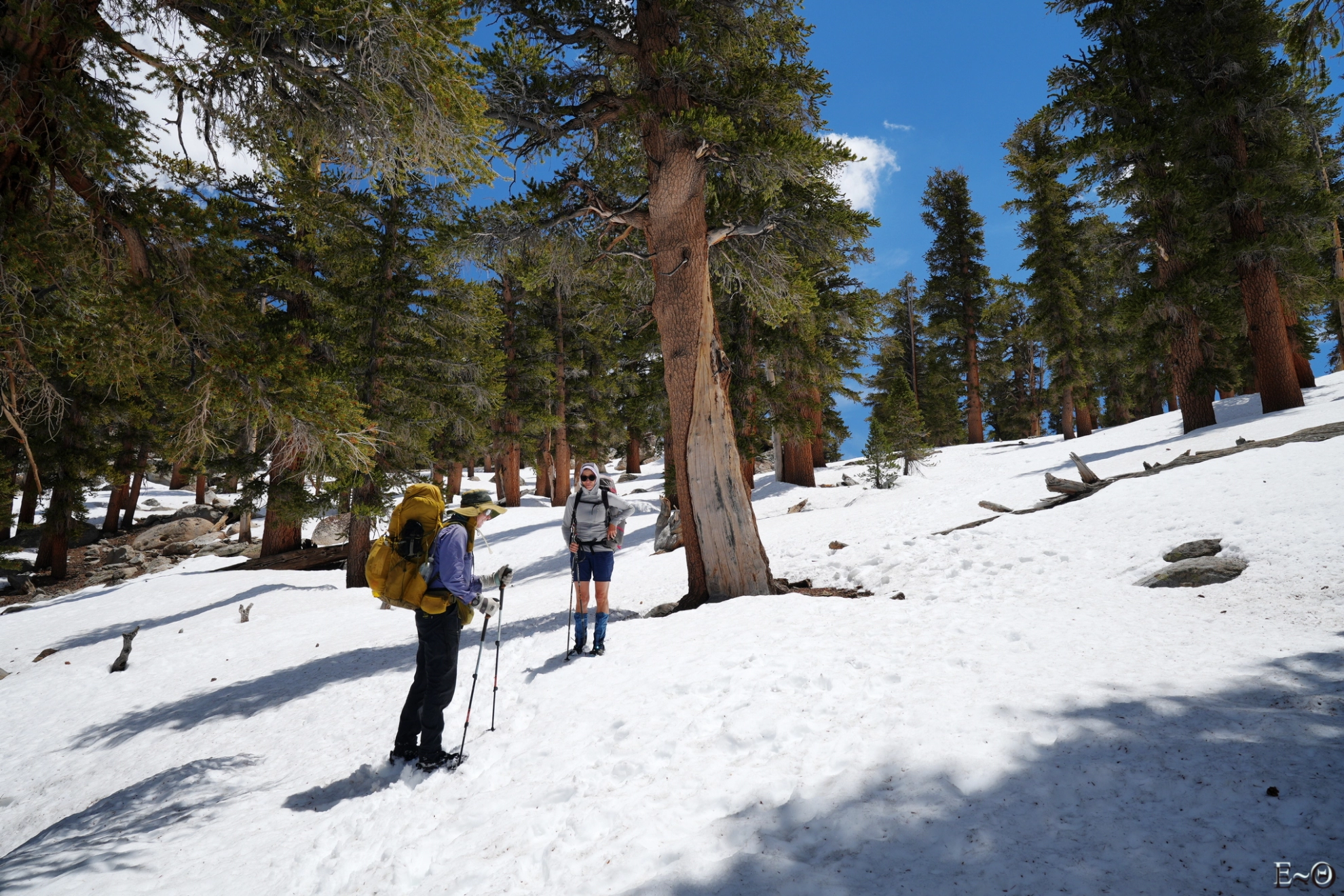 En option sur cette section, figure l’ascension du Mont Whitney. Par beau temps et neige fondue, l’ascension ne présente pas de difficulté particulière. À la période où nous arrivons au pied du Mont Whitney, la question de son ascension par le groupe ne se posera pas très longtemps. Les conditions sur les voies d’accès sont médiocres et une pratique de la marche « glaciaire » est recommandée (même s’il n’y a pas de glacier) pour progresser sur le manteau neigeux. Ce qui n’est pas le cas général des membres du groupe à l’exception d’Emgan.