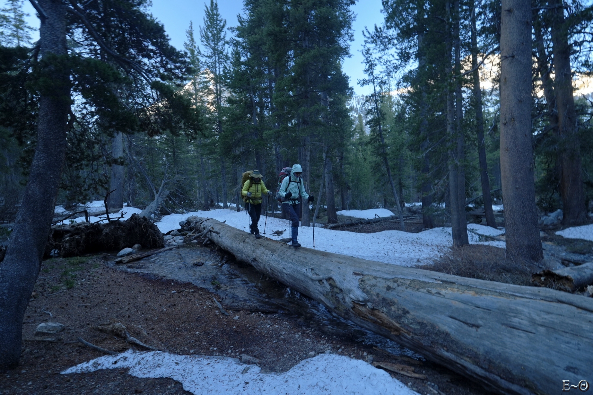 En outre, les franchissements de certains torrents sont réputés difficiles, selon l’état de la fonte des neiges. Sont mentionnés comme pouvant être critiques, les passages d’Evolution Creek, de San Joaquim Creek un peu en aval, puis plus loin celui de Bear Creek (Creek = torrent). Comme on le verra dans la séquence des jours détaillant la progression, au moment de franchir l’étape d’Evolution et de San Joaquim Creek, les rangers ont interdit momentanément les passages, contraignant à faire un long détour. Le franchissement des torrents varie de très facile, lorsque subsistent des ponts de neige praticables (à condition que ceux-ci ne s’effondrent pas pendant le passage), à facile lorsque les débits et les courants sont faibles. Mais ils peuvent aussi être modérément difficiles, voire très difficiles et dangereux en certaines circonstances. Des précautions sont alors à prévoir (technique des 3 points d’appui, de passage groupé afin de limiter la traînée…).
