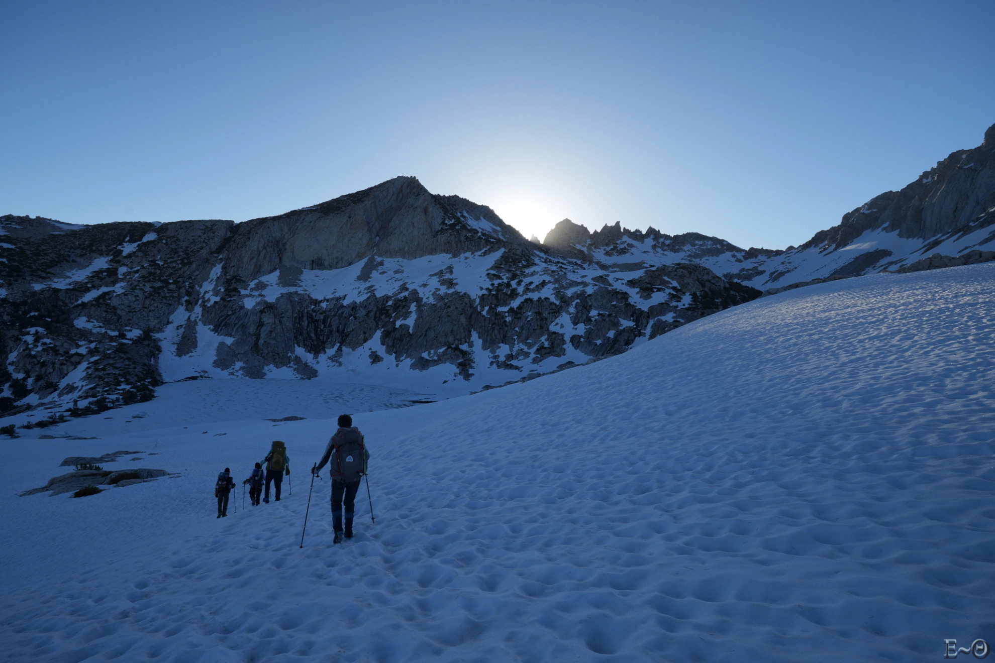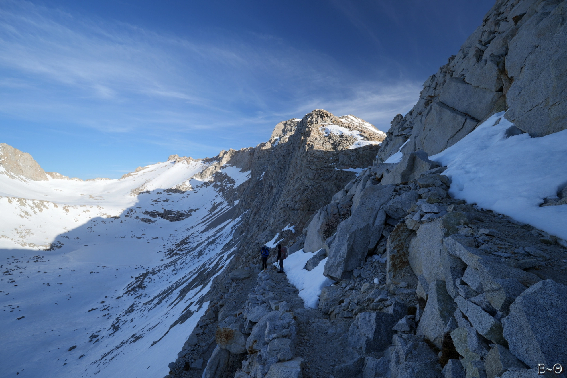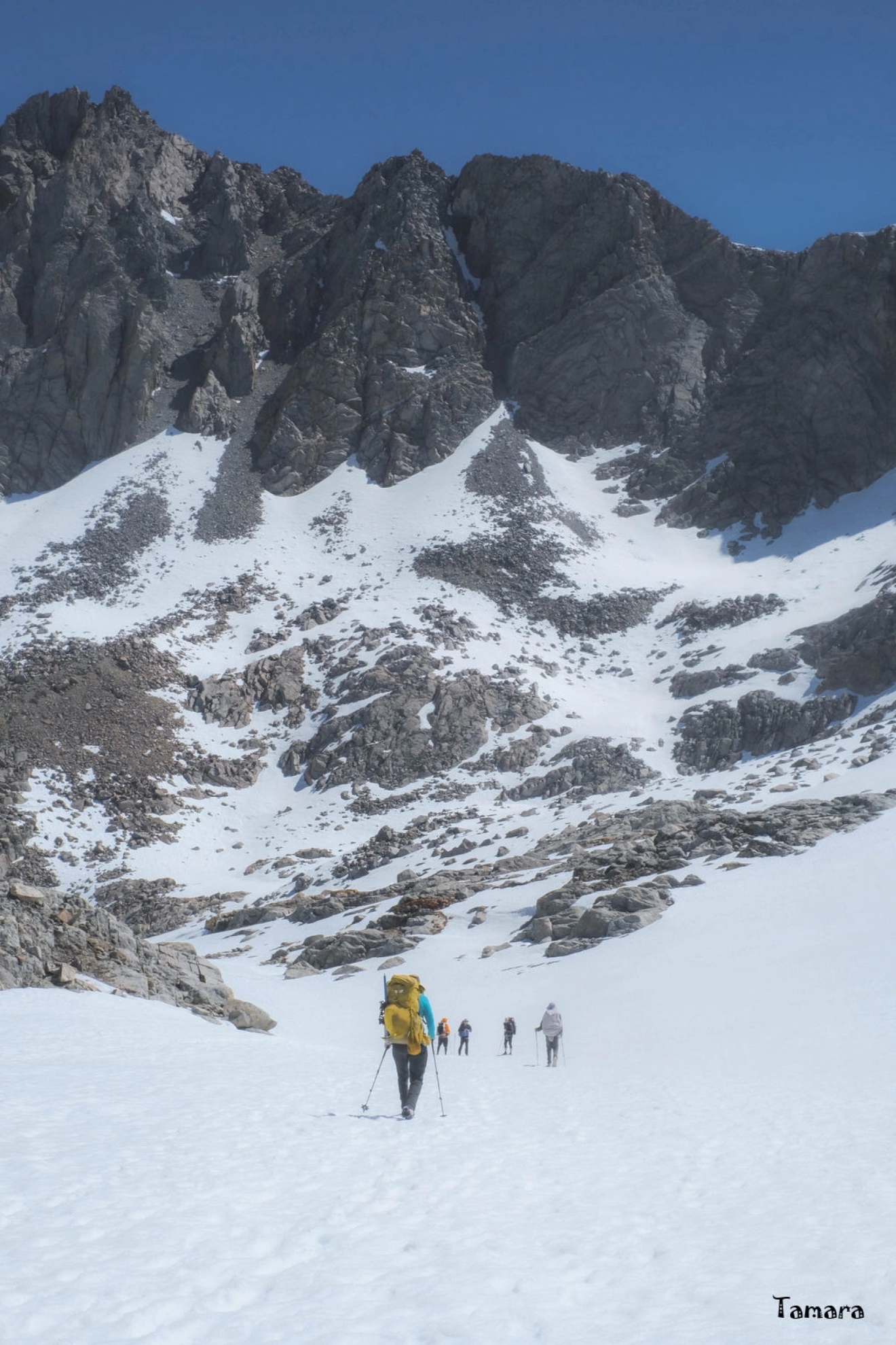 En option sur cette section, figure l’ascension du Mont Whitney.  Par beau temps et neige fondue, l’ascension ne présente pas de difficulté particulière. À la période où nous arrivons au pied du Mont Whitney, la question de son ascension par le groupe ne se posera pas très longtemps. Les conditions sur les voies d’accès sont médiocres et une pratique de la marche « glaciaire » est recommandée (même s’il n’y a pas de glacier) pour progresser sur le manteau neigeux. Ce qui n’est pas le cas général des membres du groupe à l’exception d’Emgan.
