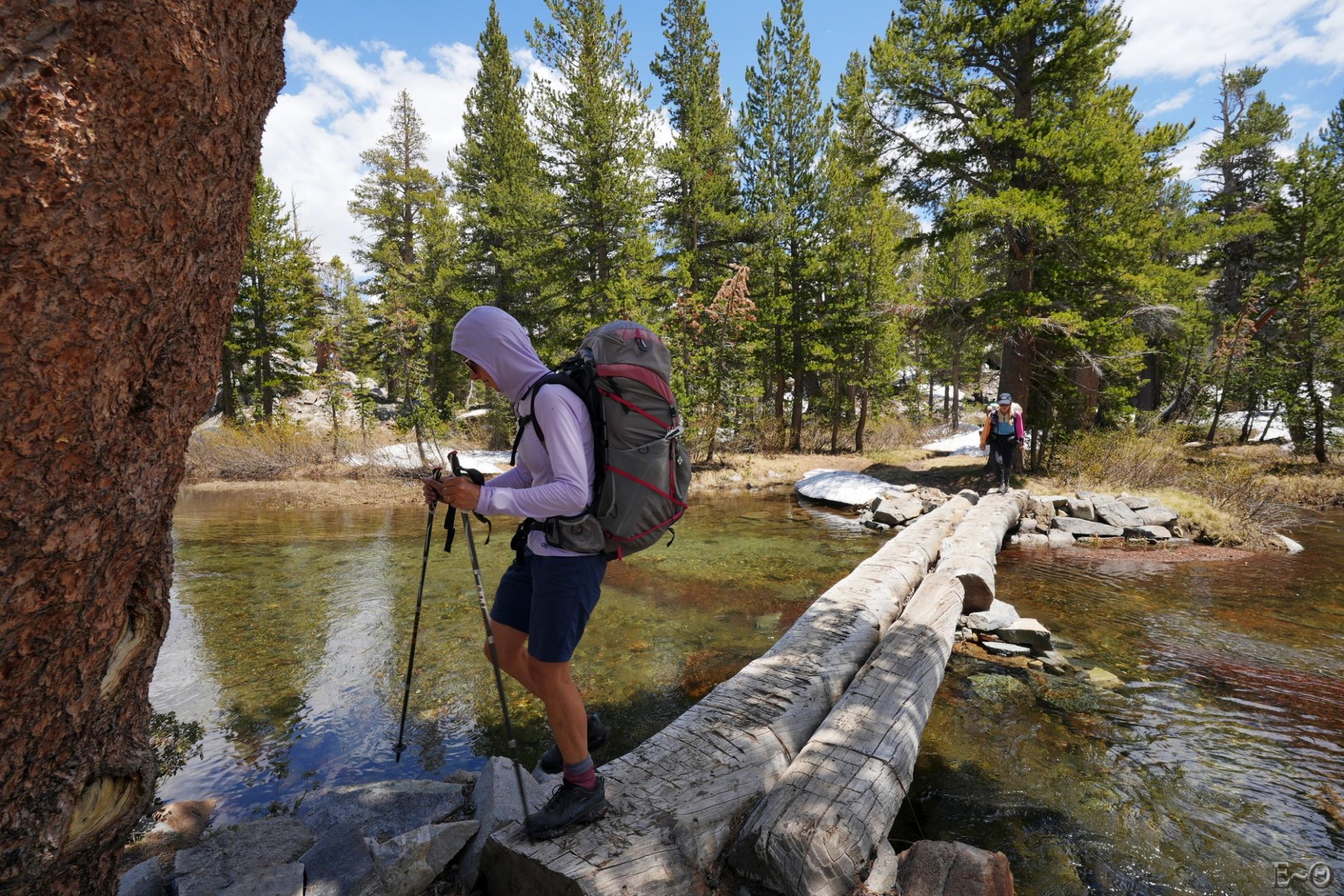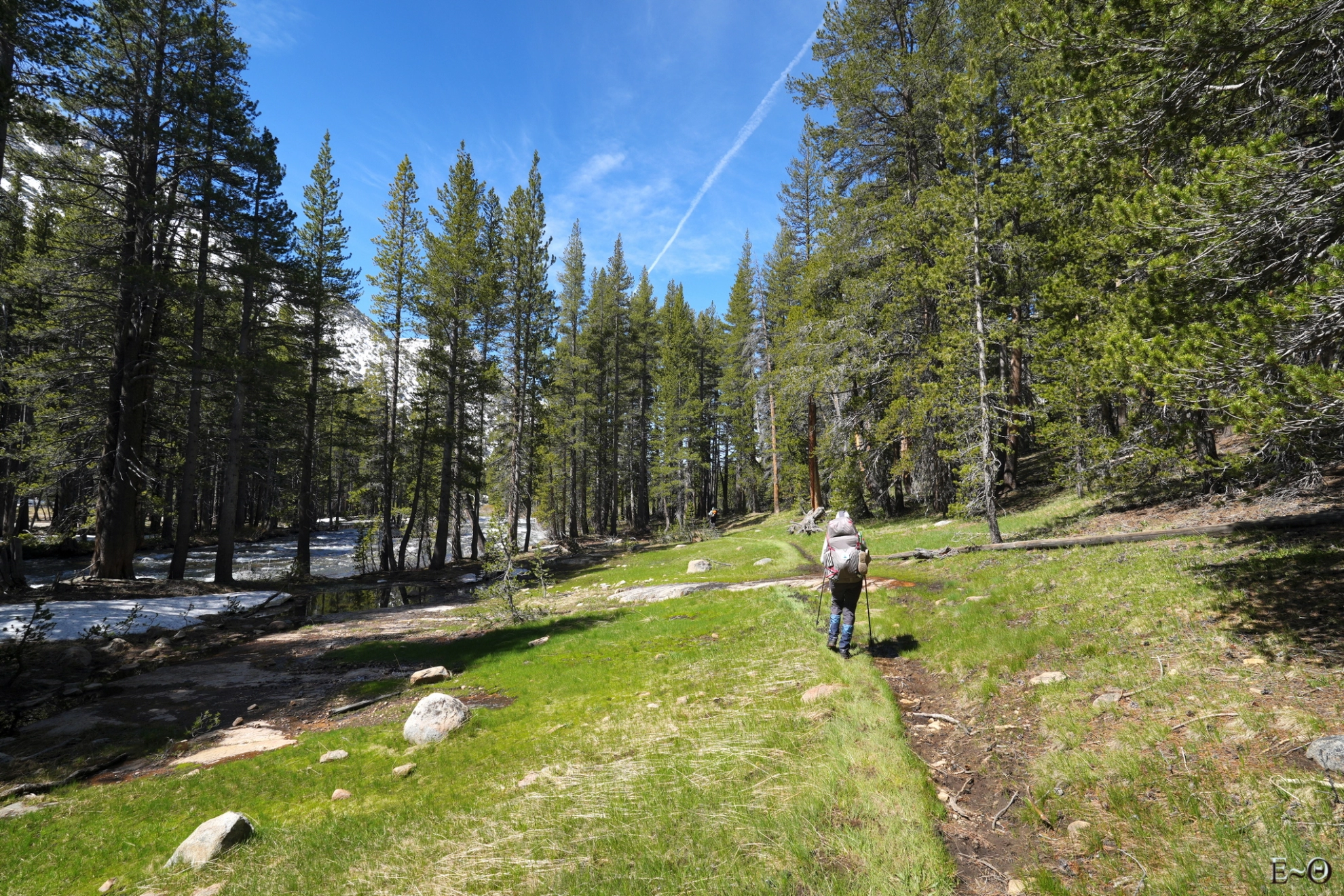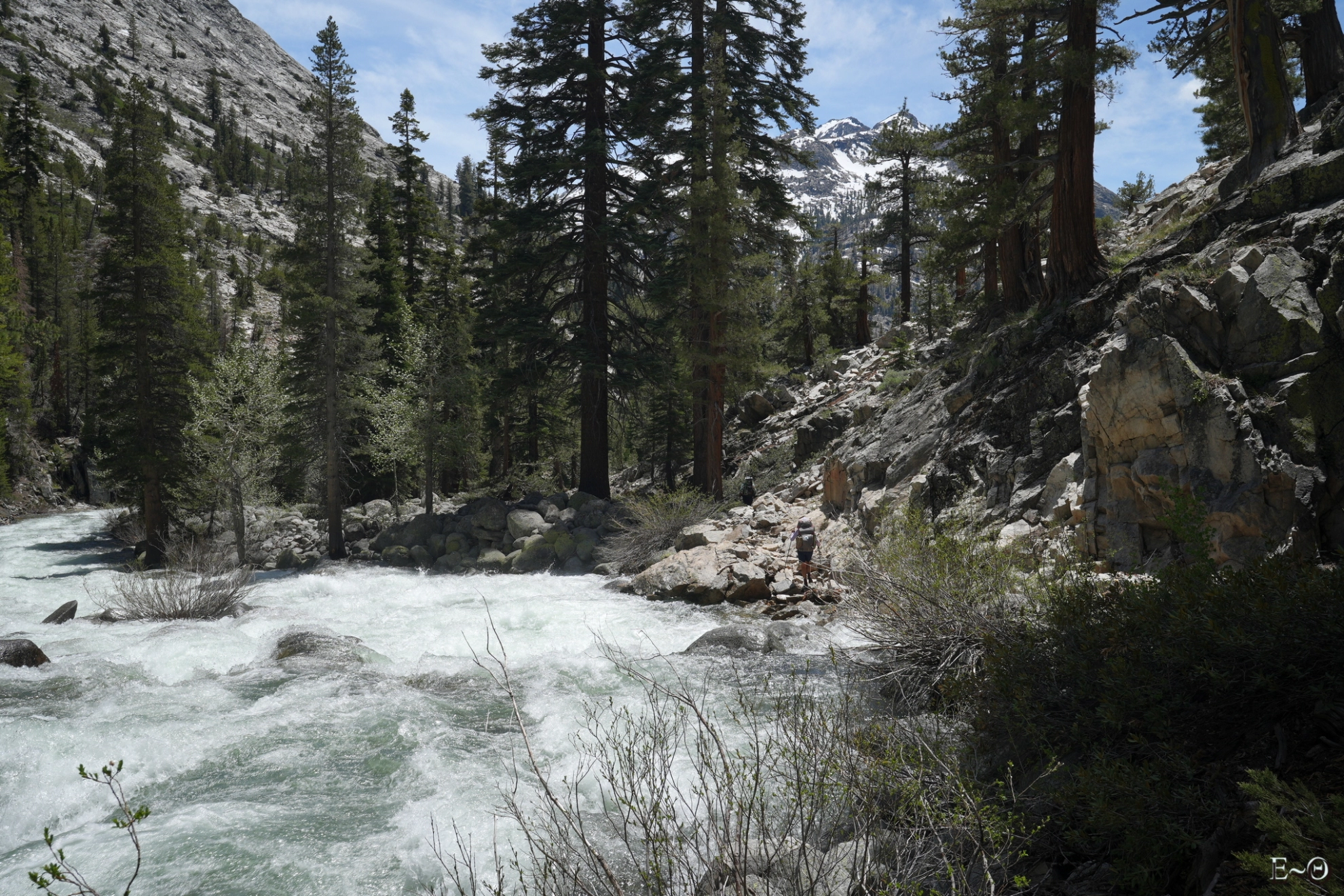 En outre, les franchissements de certains torrents sont réputés difficiles, selon l’état de la fonte des neiges. Sont mentionnés comme pouvant être critiques, les passages d’Evolution Creek, de San Joaquim Creek un peu en aval, puis plus loin celui de Bear Creek (Creek = torrent). Comme on le verra dans la séquence des jours détaillant la progression, au moment de franchir l’étape d’Evolution et de San Joaquim Creek, les rangers ont interdit momentanément les passages, contraignant à faire un long détour. Le franchissement des torrents varie de très facile, lorsque subsistent des ponts de neige praticables (à condition que ceux-ci ne s’effondrent pas pendant le passage), à facile lorsque les débits et les courants sont faibles. Mais ils peuvent aussi être modérément difficiles, voire très difficiles et dangereux en certaines circonstances. Des précautions sont alors à prévoir (technique des 3 points d’appui, de passage groupé afin de limiter la traînée…).