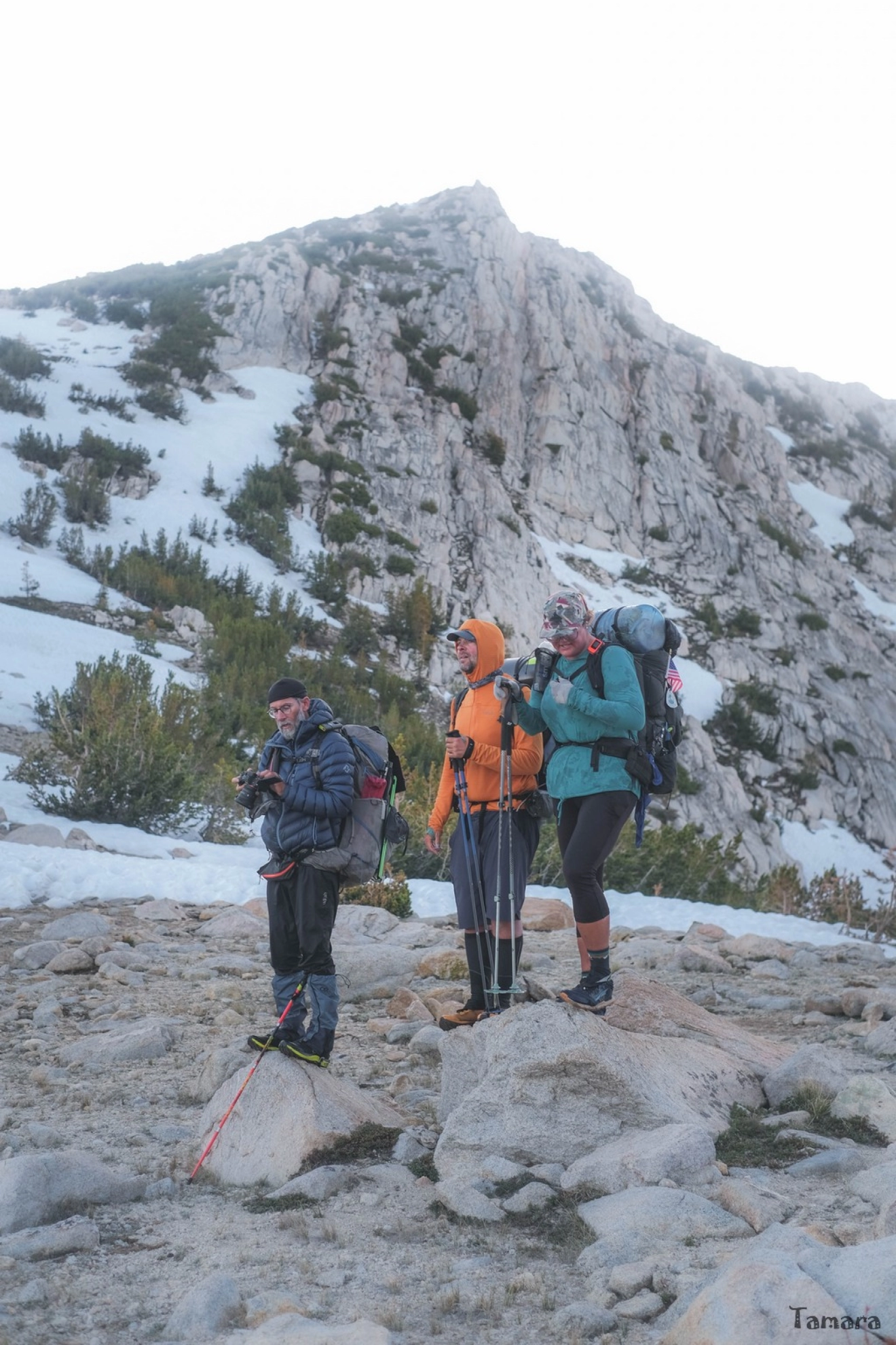 En option sur cette section, figure l’ascension du Mont Whitney. Par beau temps et neige fondue, l’ascension ne présente pas de difficulté particulière. À la période où nous arrivons au pied du Mont Whitney, la question de son ascension par le groupe ne se posera pas très longtemps. Les conditions sur les voies d’accès sont médiocres et une pratique de la marche « glaciaire » est recommandée (même s’il n’y a pas de glacier) pour progresser sur le manteau neigeux. Ce qui n’est pas le cas général des membres du groupe à l’exception d’Emgan.