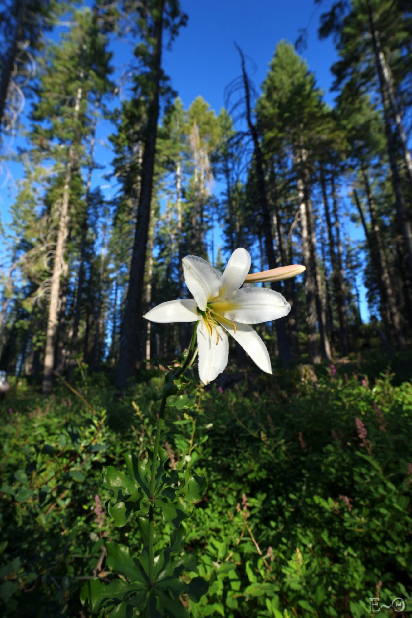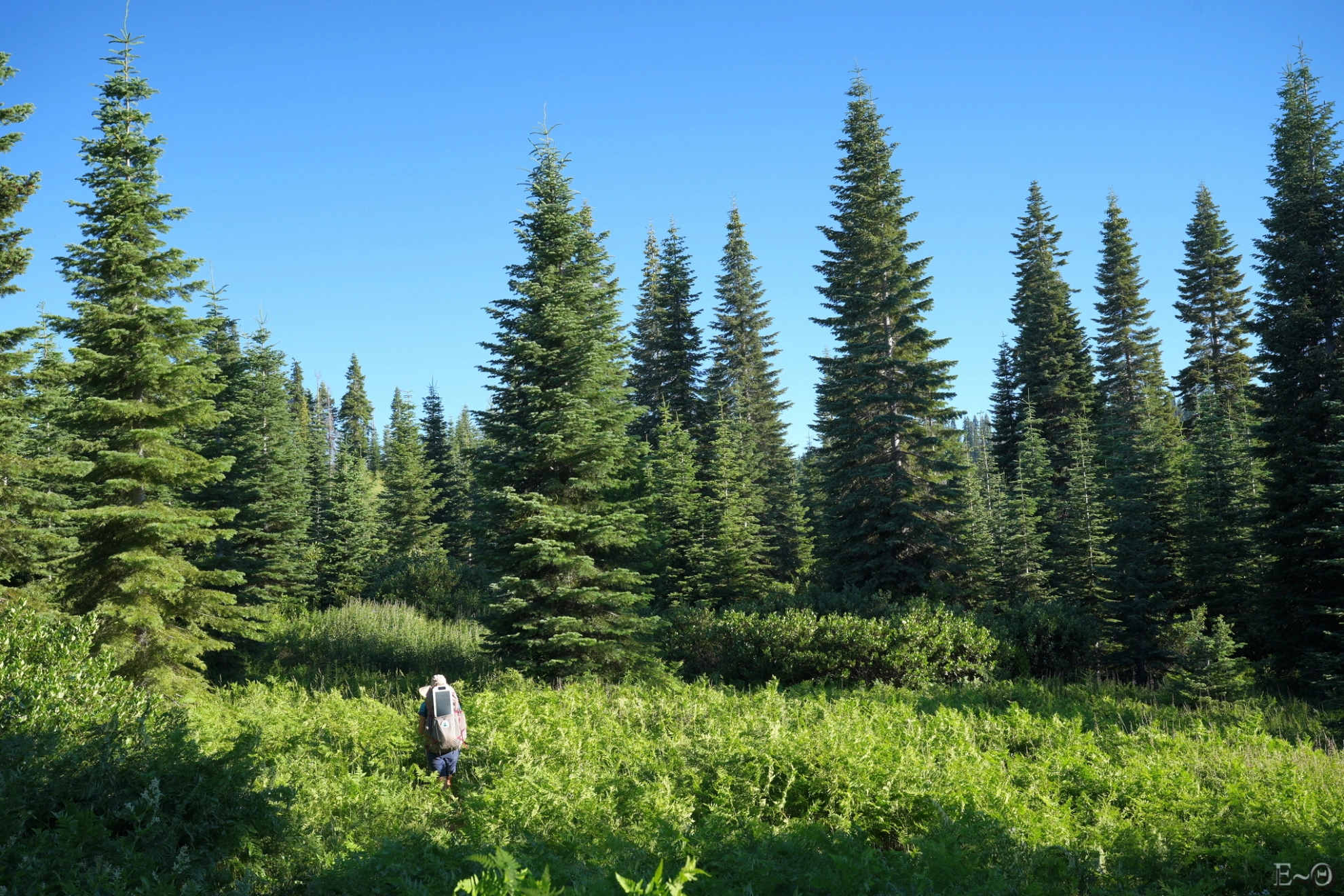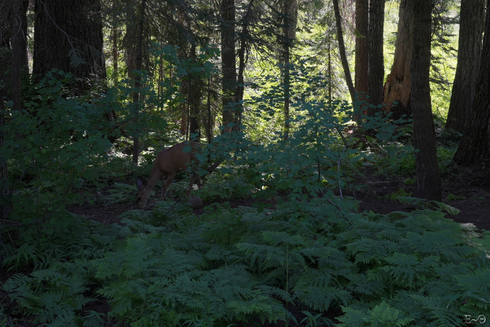 Nous arrivons après cette épreuve du feu à la rivière Deer Creek. Le campement est chaotique. Il n’y a pas de vraie zone aménagée, heureusement 50 mètres en amont sur le chemin, nous avions cru voir un espace possible. C’est le jackpot. Le lieu est parfait. Nous installons la tente et en profitons pour regarder la cime des arbres au-dessus de nous, à presque 70 mètres. Nous avons l’impression d’être dans une cathédrale immense.