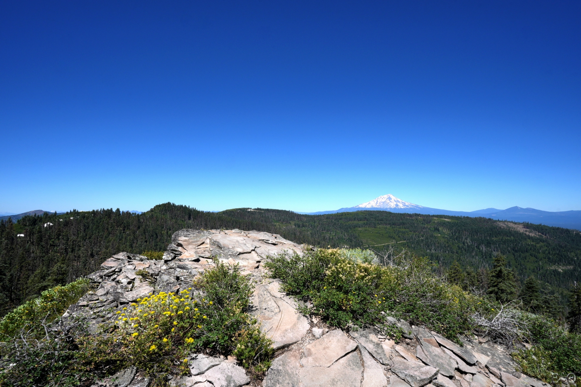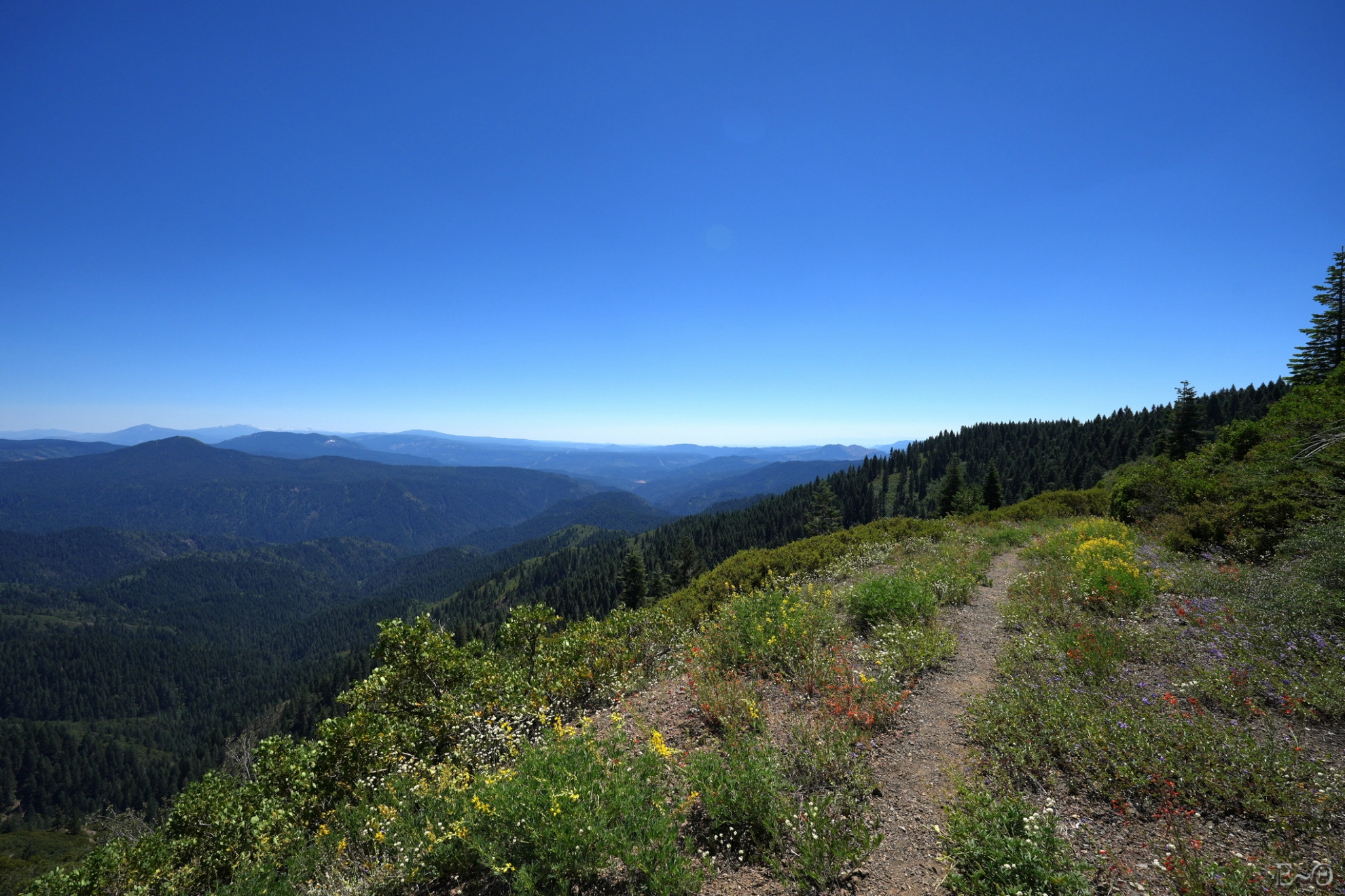 Vers midi, heureusement, et sur un malentendu, nous empruntons une piste qui longe le PCT. Nous entendons au-dessus de nous les autres randonneurs pester sur les buissons qui griffent, et fouettent les visages. Nous savourons ce moment où nous avançons rapidement sur un tapis de fleurs incroyables avec des panoramas enfin présents. Sauf qu’il fait… au moins 50°. Il ne faut pas trop traîner. Nous marchons du mieux possible sur une vague arrête, entre Mushroom Rock et Pigeon Hill.