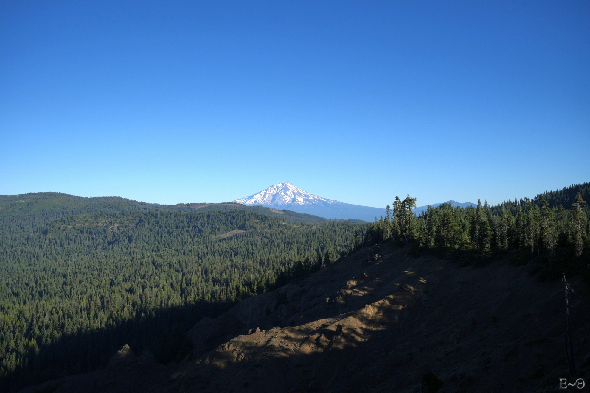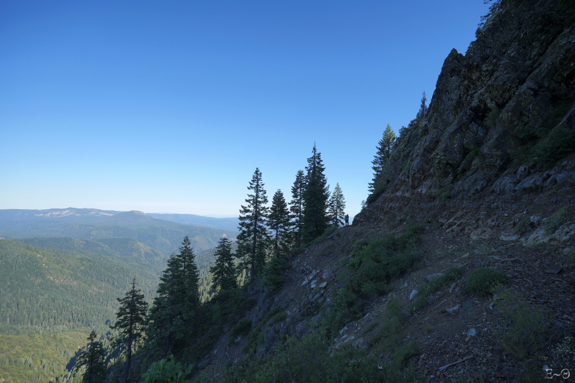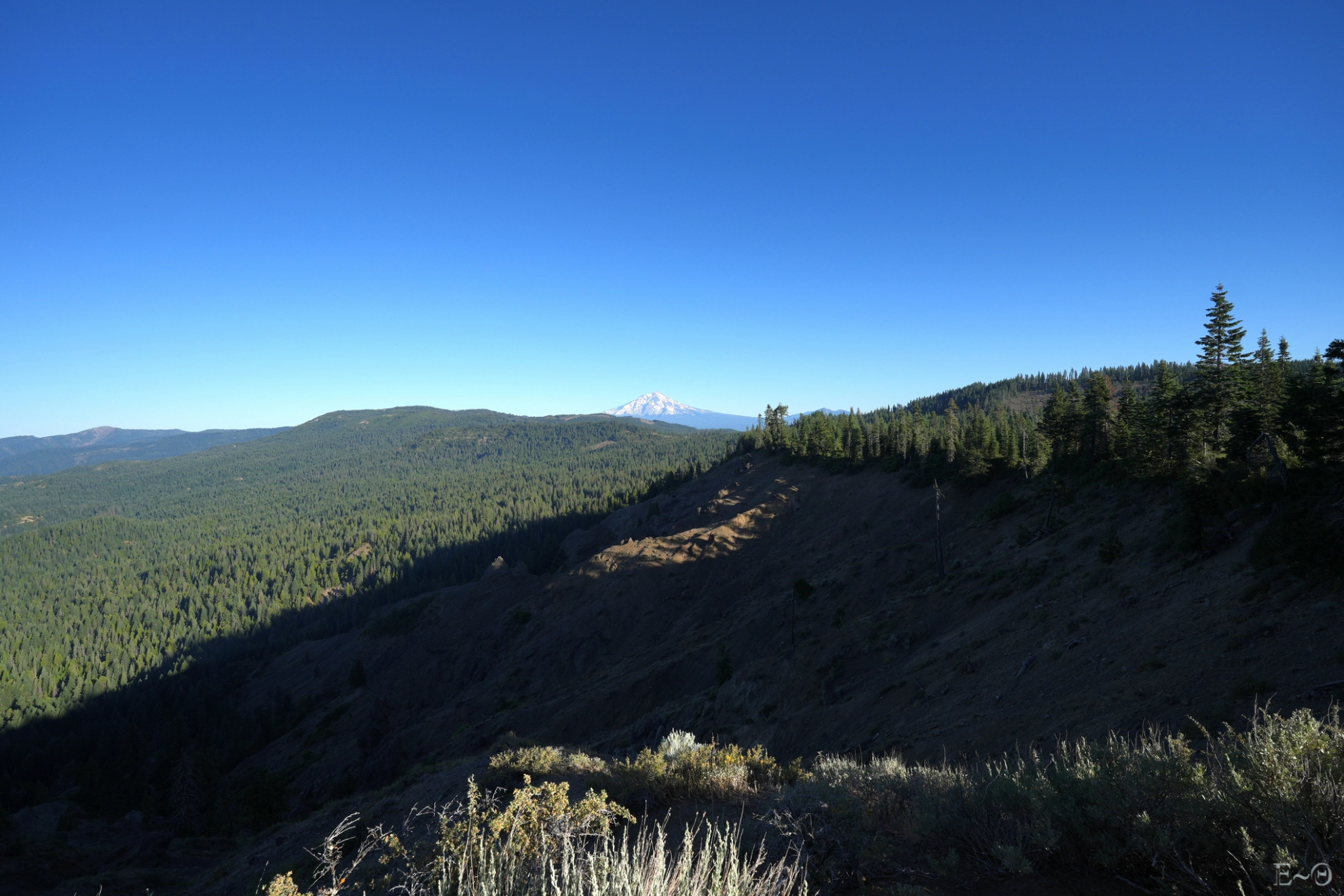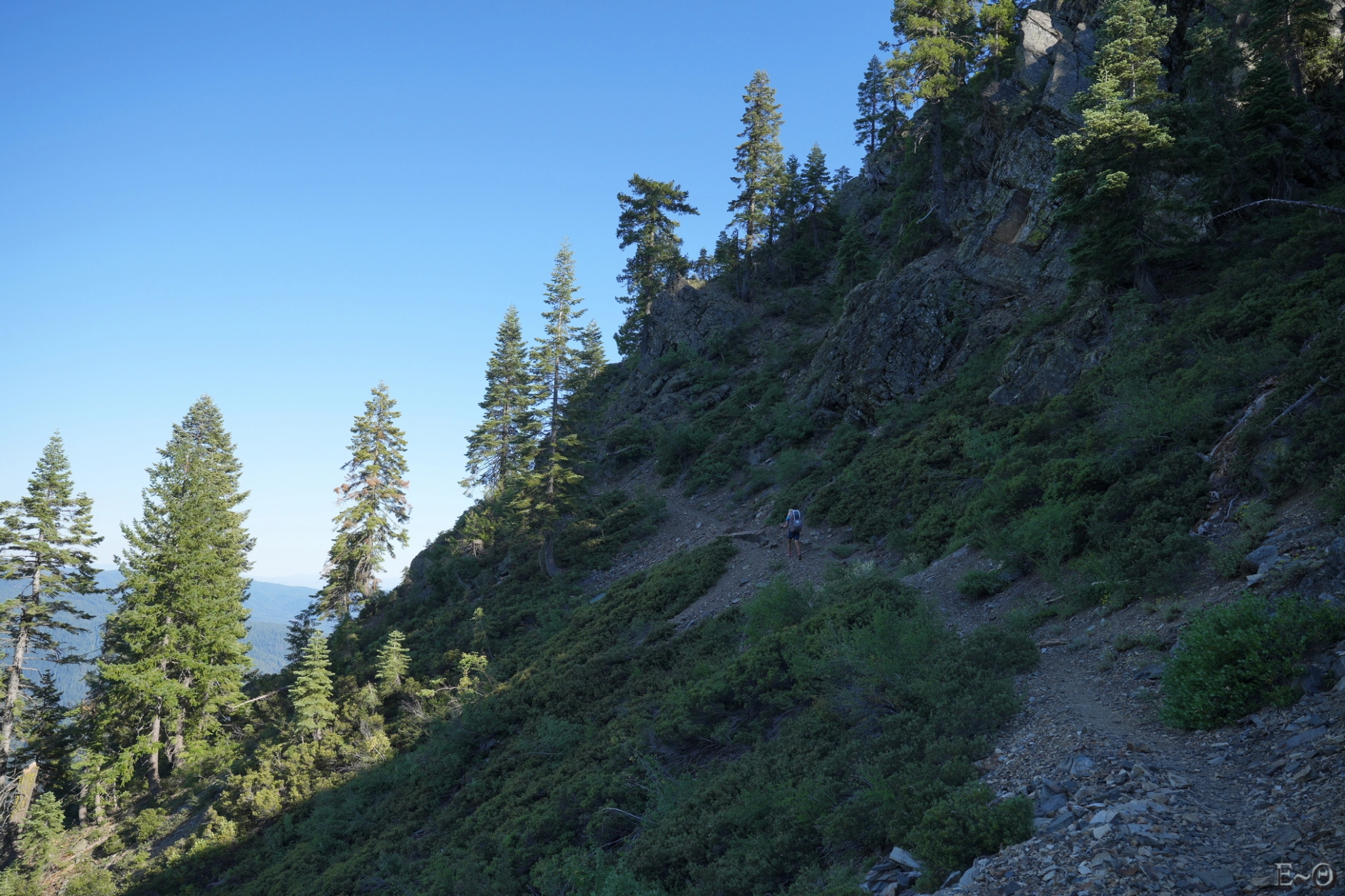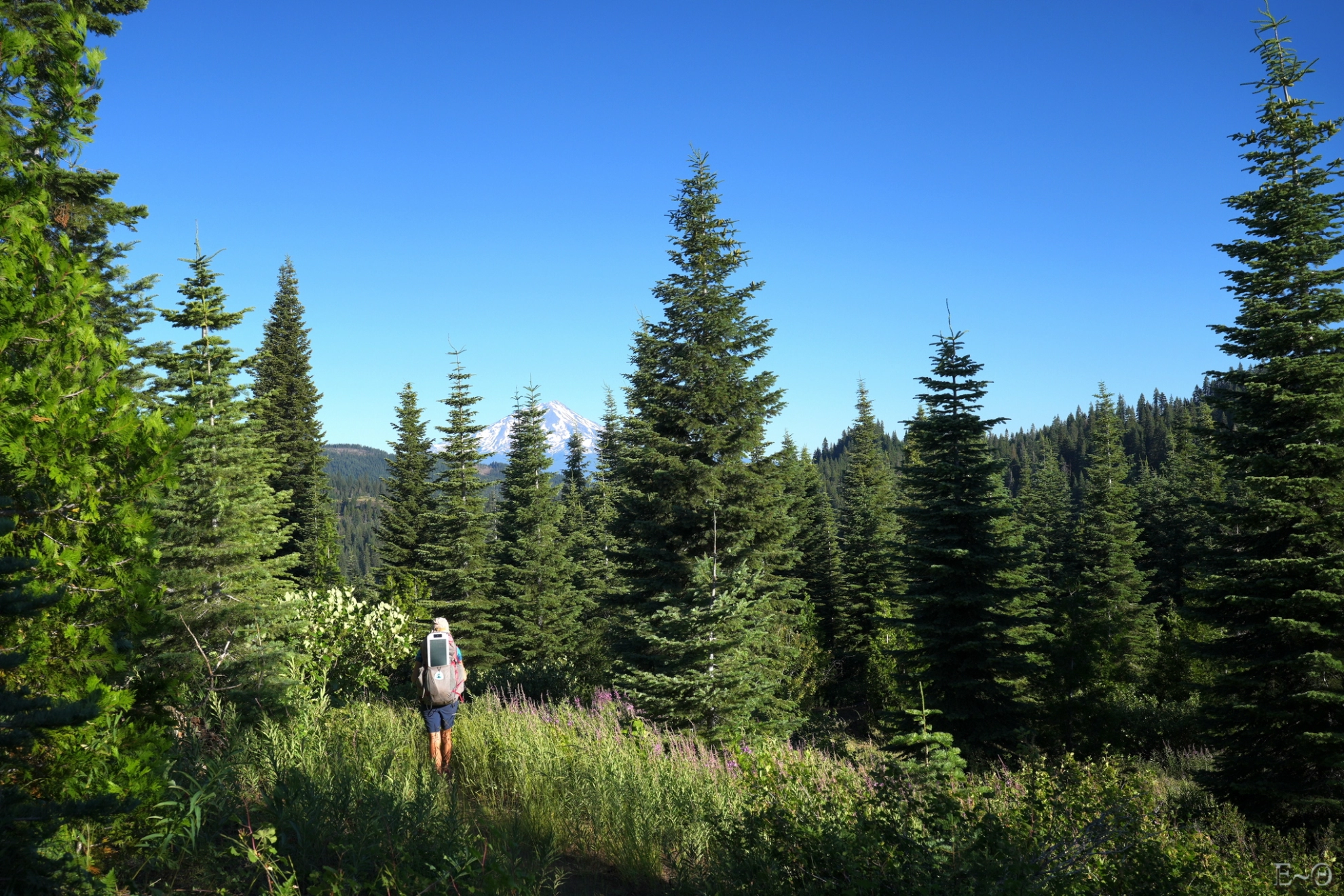 Pour être certain que cette journée sera la plus compliquée, il y a une longue portion de 17 km sans ravitaillement, que nous devrons parcourir aux heures les plus chaudes. Ce sera pénible à gérer. Les sacs sont lourds et nous allons cumuler les difficultés. Tout d’abord, une erreur de trajectoire au passage d’un névé nous oblige à faire deux kilomètres de plus. Parce que oui, sur le PCT même par 41 °C, il y a encore de la neige pour vous pourrir la vie.