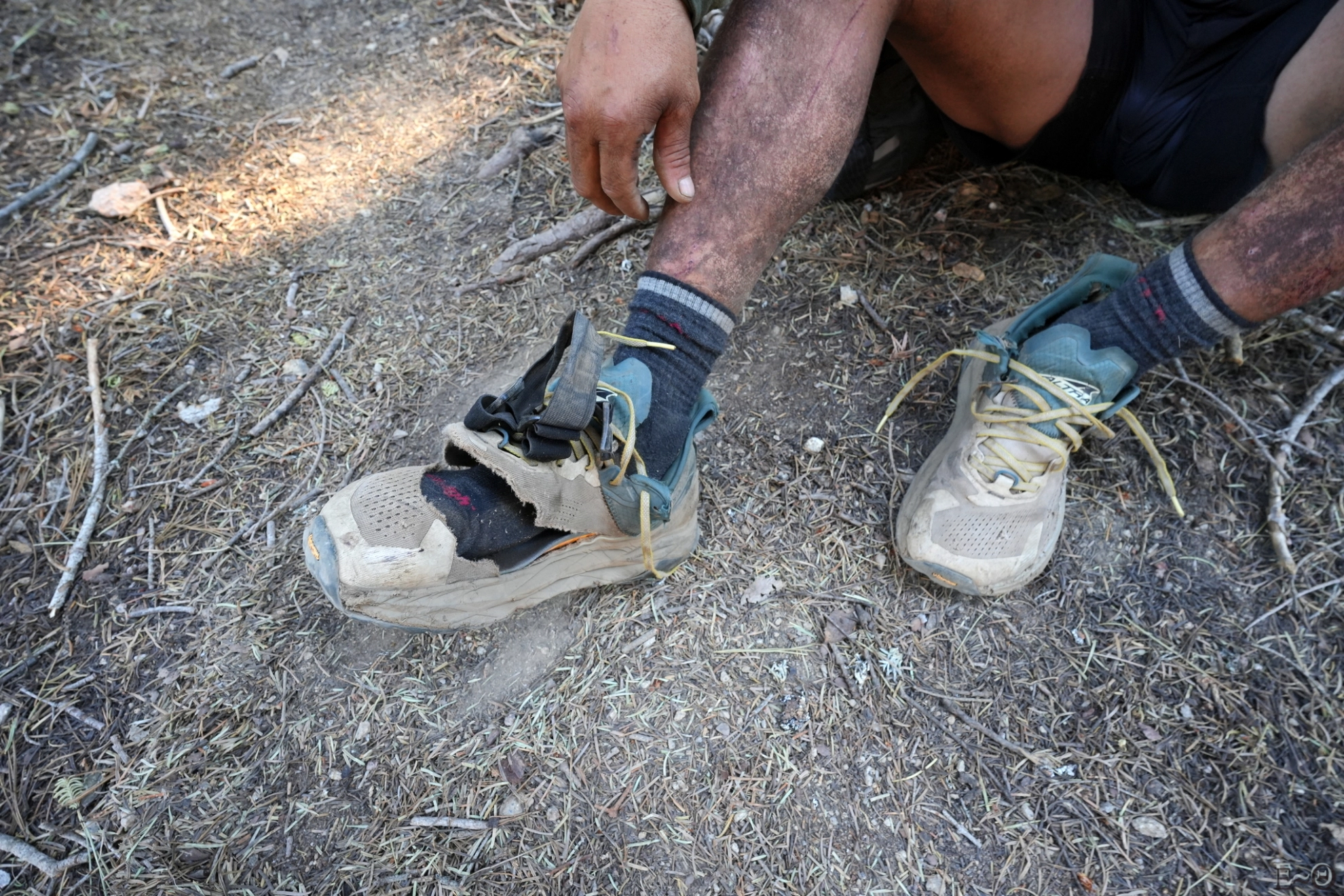 Juste après avoir dépassé celle-ci, nous prenons le temps de suivre une piste hors PCT pour aller à la rivière Gold Creek. Le lieu est salvateur, nous attendions ce moment avec impatience. De l’eau, enfin ! Nous sommes 5 hikers, assoiffés. Nous discutons tous de l’épreuve que cela a été de venir jusqu’ici. Un des randonneurs est en plus avec une chaussure éventrée depuis maintenant une trentaine de kilomètres. Il avance tant bien que mal, avec les orteils qui sortent à chaque pas, de ce que nous pouvons plus appeler un soulier.