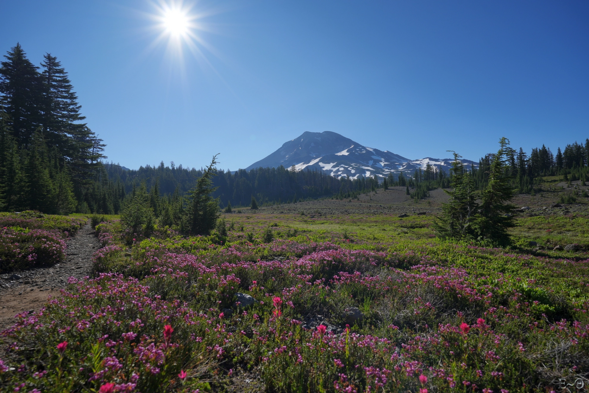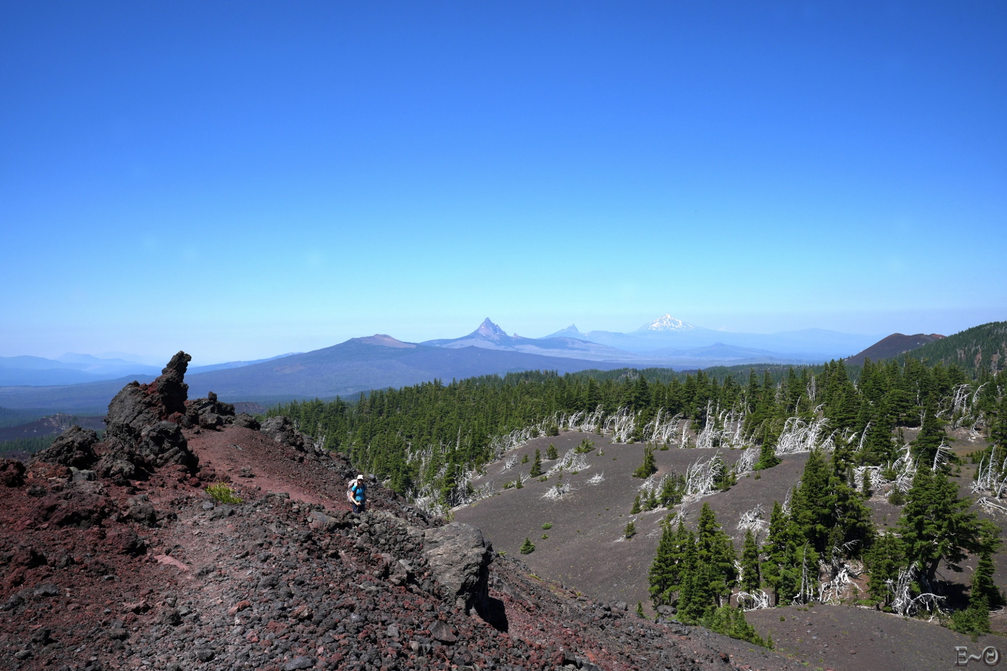 Au loin nous devinons nos prochaines destinations, le Mt Jefferson, les Three Fingers et encore plus loin, bien enneigé le Mt Hood, limite entre l’état de Washington et l’Oregon, aligné en un tableau parfait. Des arbres morts au tronc blanchi ajoutent une touche supplémentaire à ces lieux ou la vie est juste tolérée.