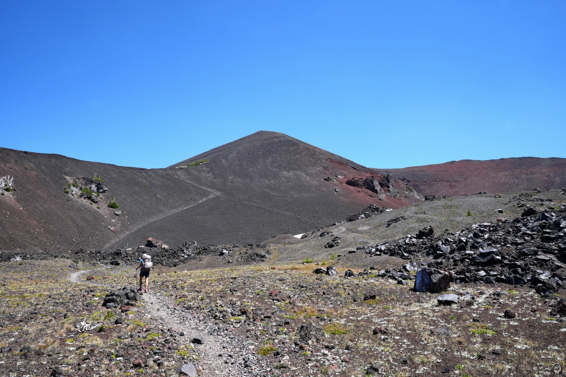 Nous continuons à avancer et entrons dans l’immense coulée de lave descendue du Collier Cone. La montée au col Opie Dildock Pass est juste indescriptible. La roche, d’un rouge vineux, est mélangée à des blocs noir plus dense. Au milieu de cet invraisemblable capharnaüm minéral, un sentier ondule, fin trait éphémère. Des millions de randonneurs ont dû, comme nous, se sentir petits et chanceux que le lieu soit accessible. Nous avons l’impression de ne pas être sur Terre. Après ce passage unique, nous basculons en descente sur les flancs nord du graphique cratère Yapoah.