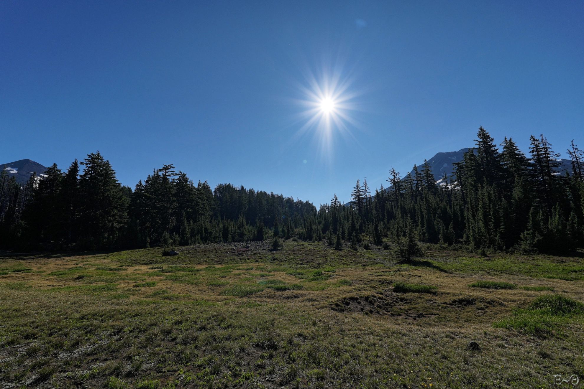 Nous montons pendant les six premiers kilomètres sur 200 mètres dans une forêt peu dense. De temps en temps, des troncs brûlées rappellent la permanence du risque de feu dans ces lieux desséchés par les températures estivales implacables de l’Ouest américain. Les prairies d’herbes rases, encore vertes sont constellées de millions de couleurs vives. En quelques kilomètres, les tapies de fleurs jaunes et roses laissent place à des pins qui ressemblent à des mélèzes, puis au détour d’un virage, nous foulons une terre ocre et aride. L’omniprésence des 3 sommets à notre droite est incroyable. C’est un parc d’une beauté assez rare. C’est avec une joie réelle que nous avançons dans cet univers aussi changeant.