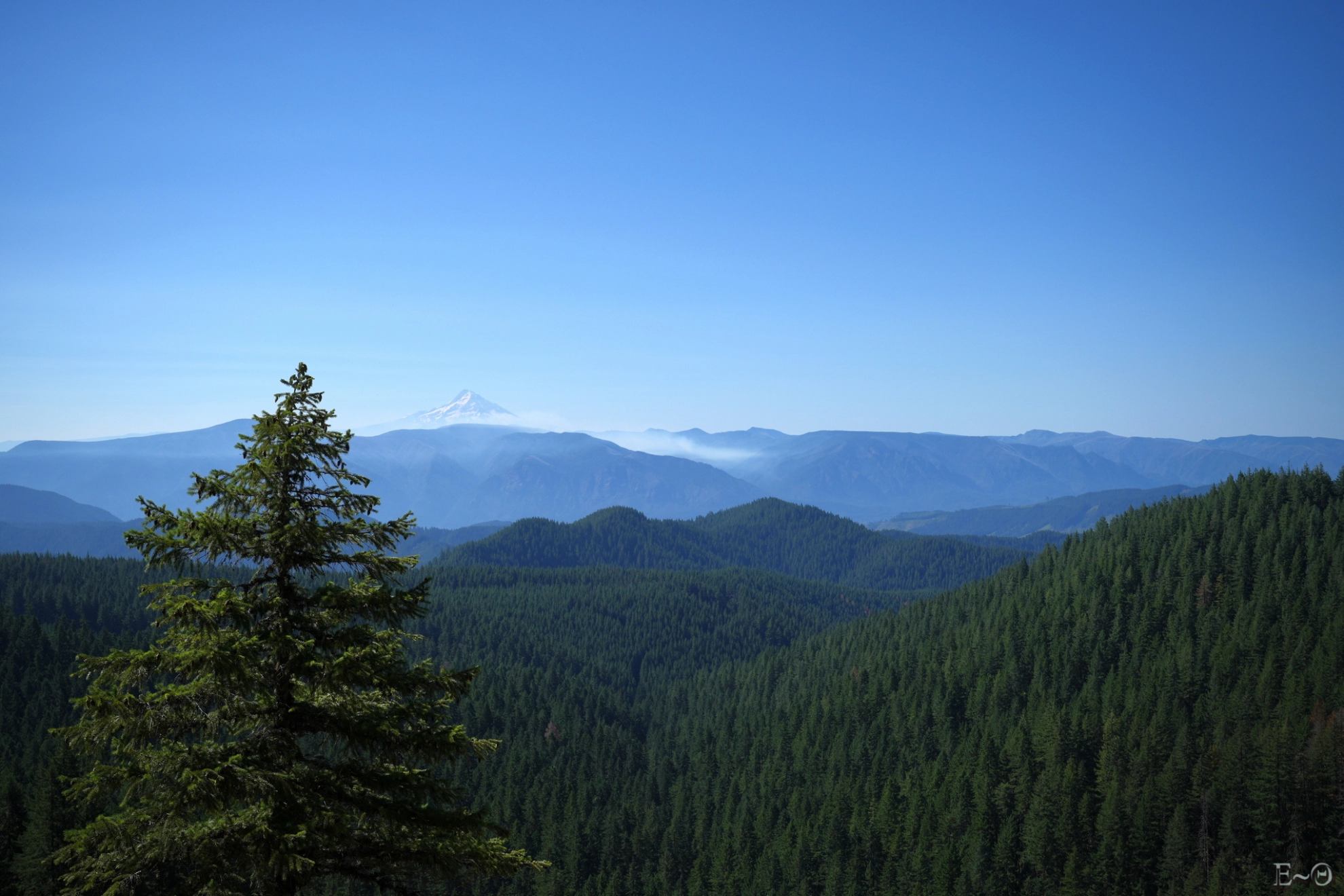 Les paysages sont tels qu’imaginés. Les forêts de Pinchot National Forest sont immenses, indemnes d’incendie et plus aérées. C’est bien plus agréable qu’en Oregon. Nous avons la chance de bénéficier de trouées dans le couvert végétal pour embrasser la face nord du Mt Hood qui semble s’éloigner au sud. Les fumées, nuages maléfiques, du Whisky Creek Fire sont parfaitement visibles dans la vallée ou passe le PCT. Nous devrions apercevoir le mont Adams sur notre droite, mais pour l’instant la canopée est trop haute et ne nous voyons pas les sommets environnants.