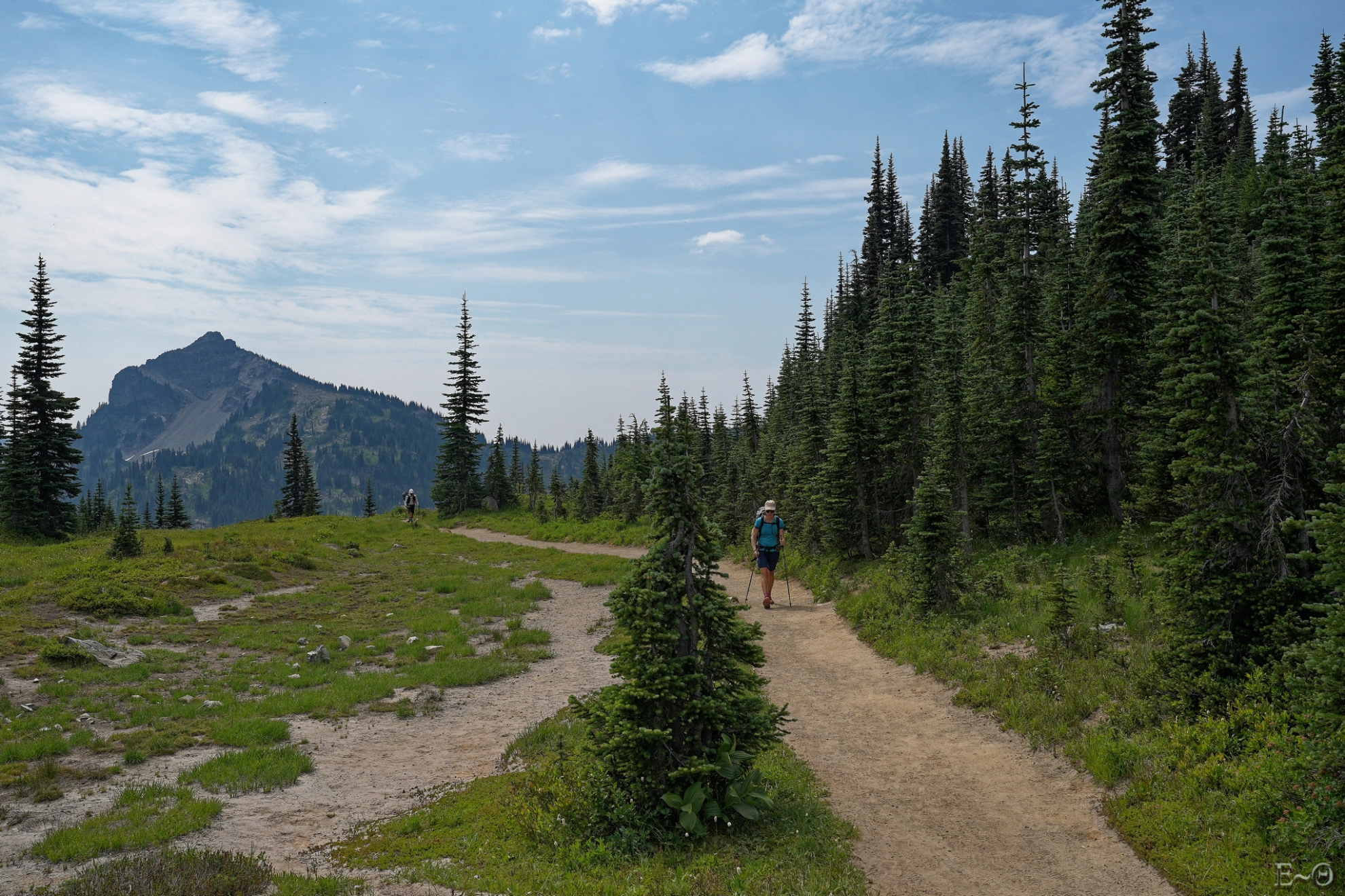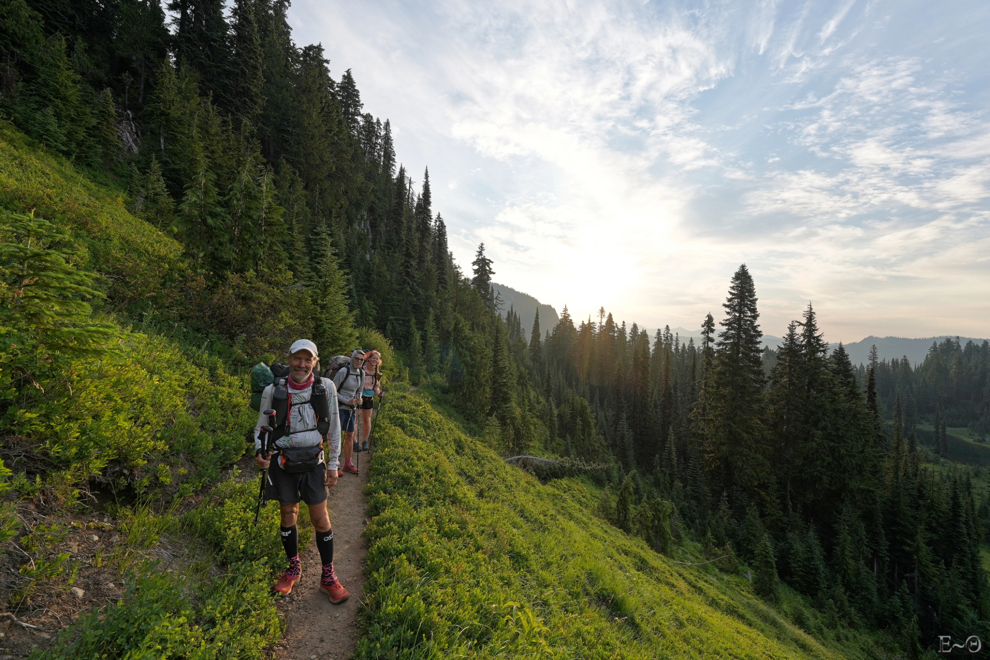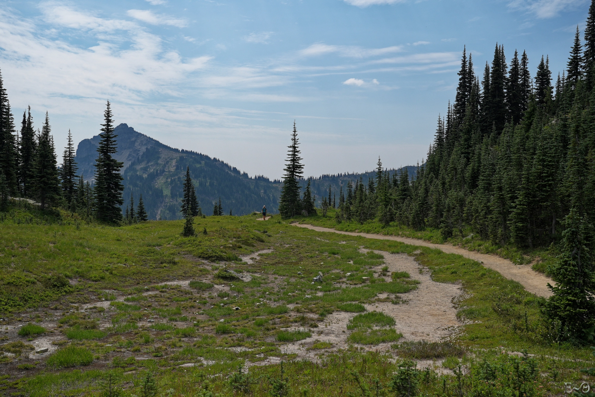 Nous sommes tôt à Chinook Pass. La team traverse le pont en bois qui surplombe la route Mather Memorial Parkway pour aller plus au Nord. De celui-ci la vue sur le Mont Rainier est extraordinaire. Le volcan visible à l’ouest est monstrueux. Des coulées noires se mélangent aux névés et glaciers. Il domine la région du haut de ses 4300 mètres. Le jour ou celui entrera en éruption on devine qu’il ne fera pas bon être à proximité.