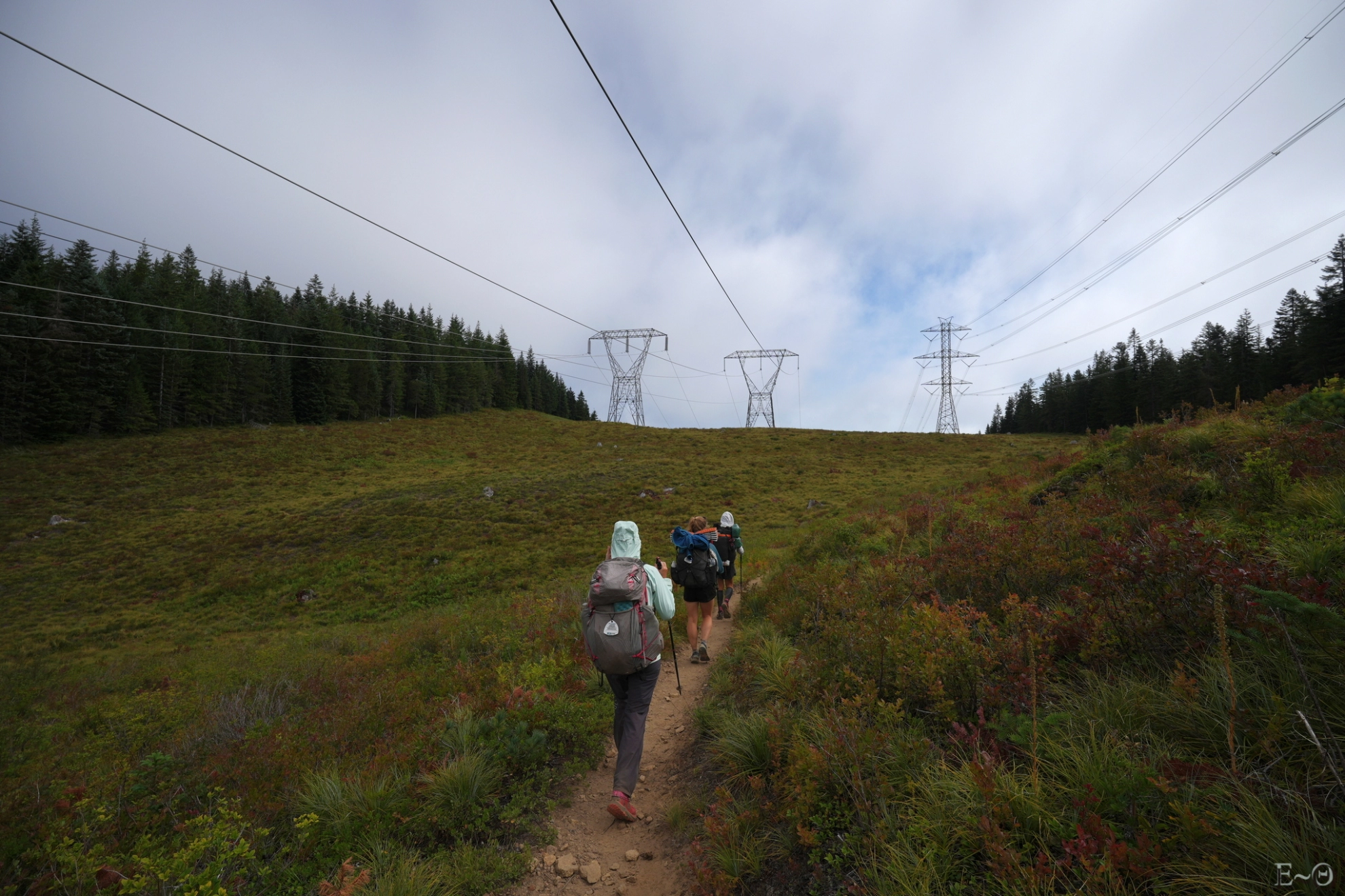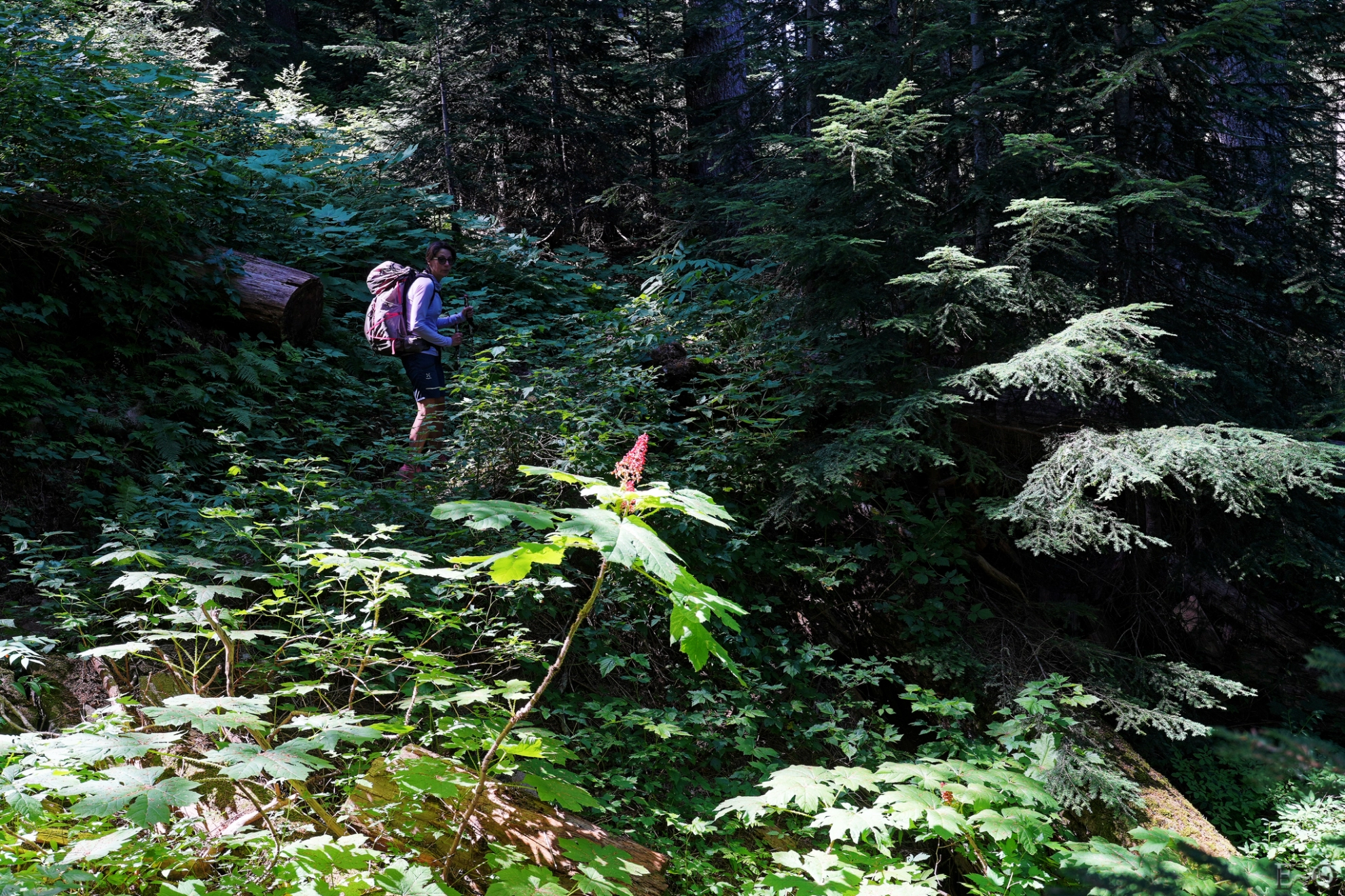 Nous finissons par rester sur le fin trait de terre officielle du sentier. Cela nous permet tout d’abord d’éviter de nous perdre, mais aussi de profiter de la flore en étant, bien immerger dedans. Les feuilles et branchages fouettent de temps en temps les vêtements. Nous ne sommes pas gênés, car il n’y a plus depuis bien longtemps d’épineux sur notre passage. Nous contournons Snowshoe par l’est et arrivons sur un système de crêtes, mal délimitées vers le col de Stampede. À partir de celui-ci, ce sera une succession ininterrompue de bosses et de collines.