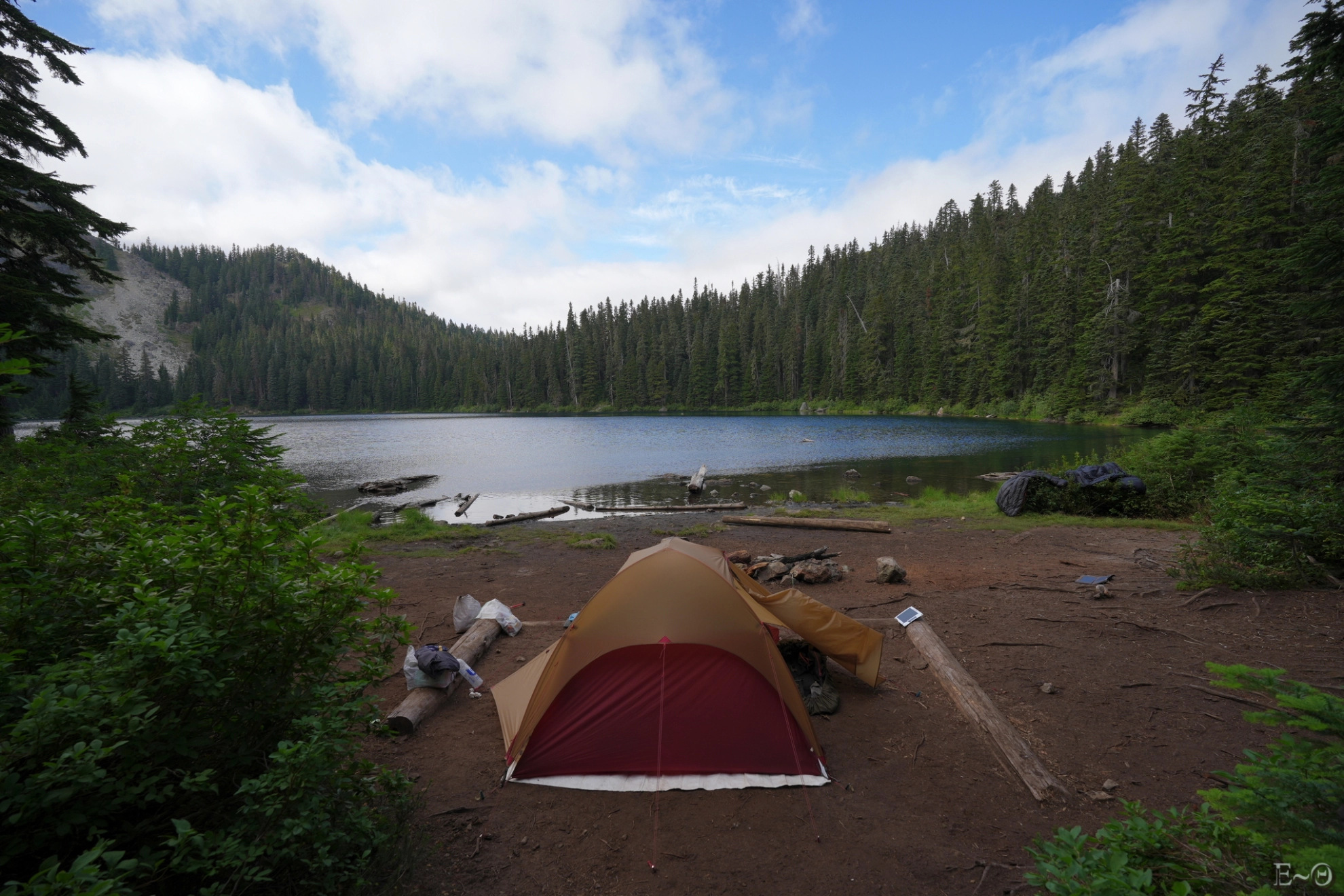Au lac, un groupe d’adolescents randonneurs américains sont disséminés dans tous les coins. Nous confirmons, la jeunesse n’est pas plus intelligente aux USA. Nous trouvons sur la berge sud, une série d’emplacements qui ont été aménagés par des scouts féminines. Le lieu est parfait. Nous avons presque la sensation d’être en vacances au bord d’un fjord norvégien.