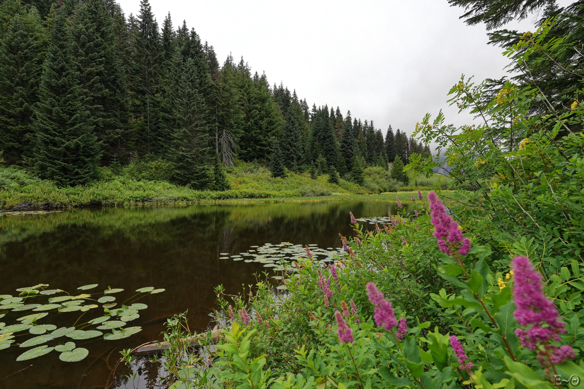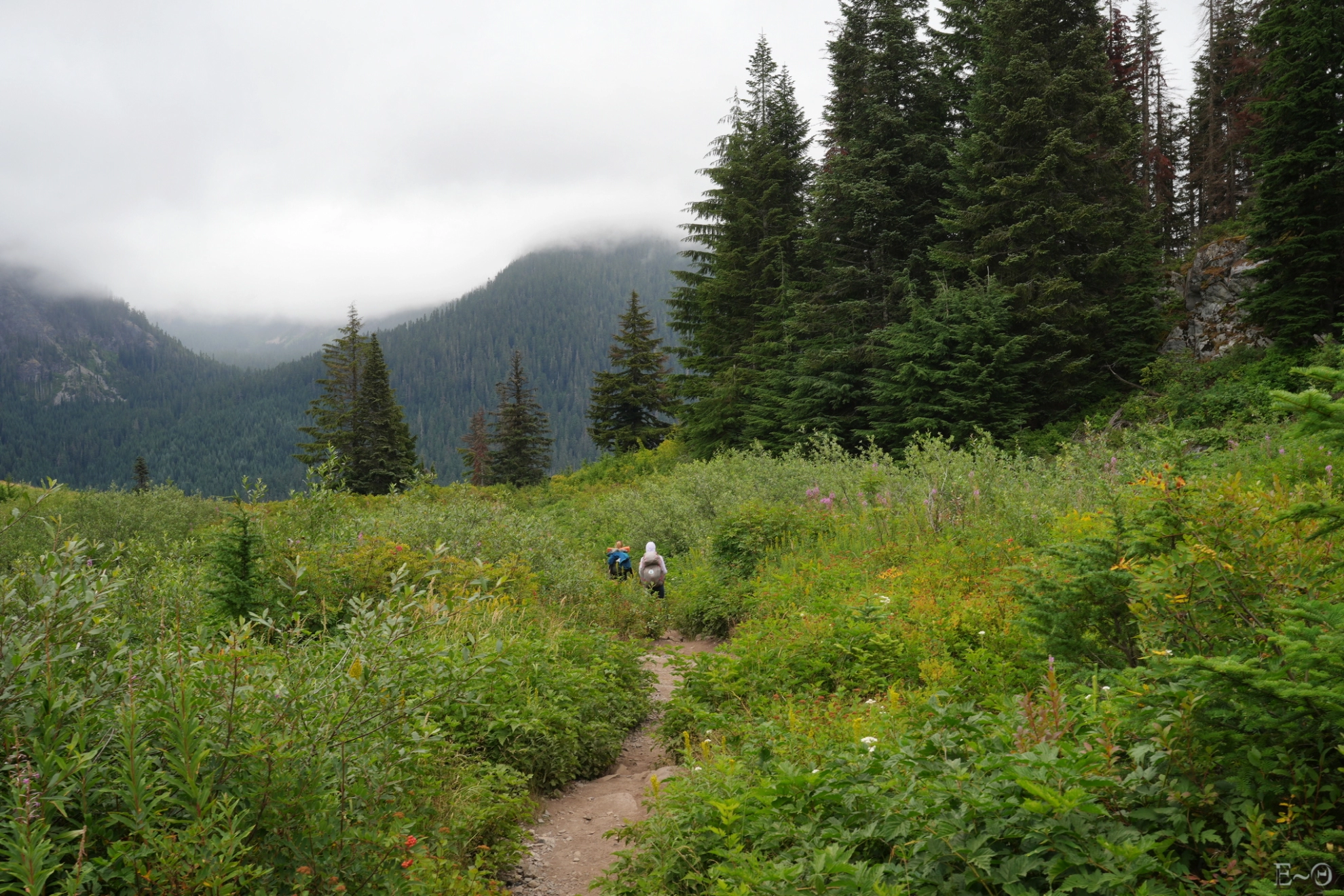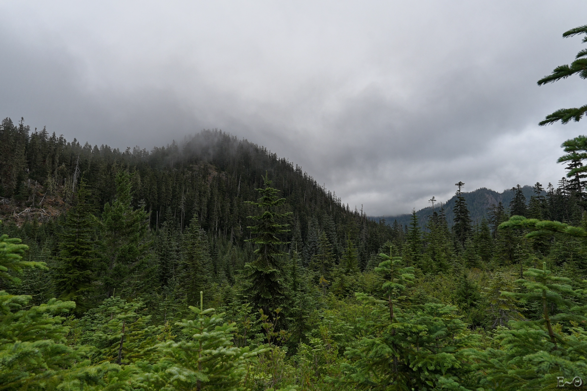 Malgré l’omniprésence des nuages et d’une petite bruine fine bien bretonne, avancer sur le chemin est encore agréable. Les sommets sont invisibles, le plafond brumeux est aux alentours de 1500 mètres. Pourtant, nous avons droit à tous les attendus du PCT en quelques kilomètres, des lacs, de la forêt, des fleurs, des montées, des descentes et un Trail Magic, avec sodas et fruits frais. Nous sommes maintenant habitués au gigantisme des lieux et nous ne faisons plus attention aux géants qui nous entoure.