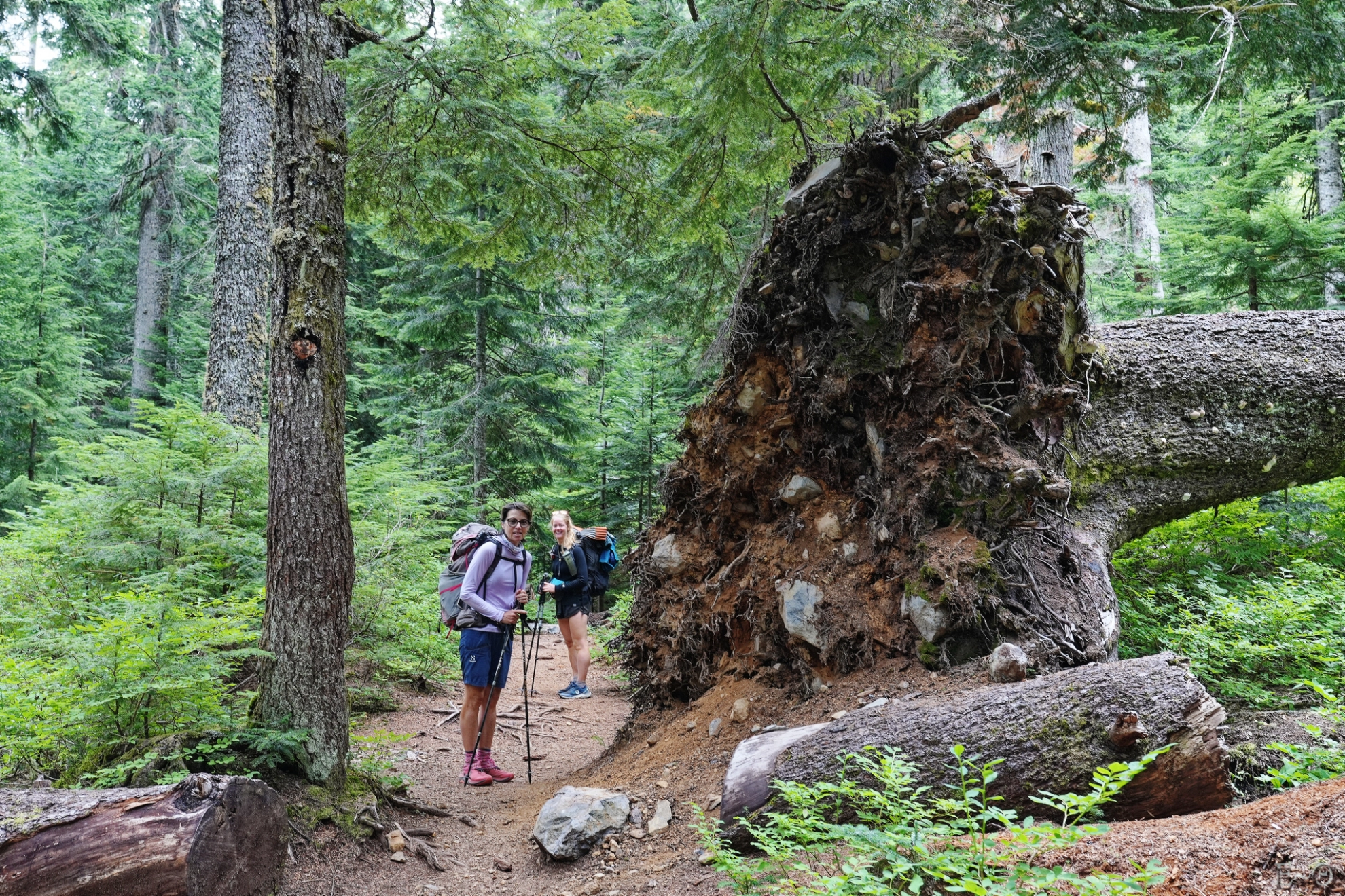 Sauf que, soudain, au détour d’un virage, une énorme soucoupe de racine de plus de cinq mètres de diamètre de terre nous rappelle que rien n’est à l’identique de l’Europe. Les deux Hélène prennent la pose pour faire échelle. Après avoir longé par l’est Silver Peak, puis passé Windy Pass où nous trouvons une boîte pleine de sodas, avec un mot à l’attention des randonneurs, nous plongeons avec impatience dans la végétation, le long d’Ollalie Creek. Ça y est nous arrivons aux deux derniers lacs, Lodge et Beaver Lake. Plus que deux kilomètres et nous serons au terme de notre étape.