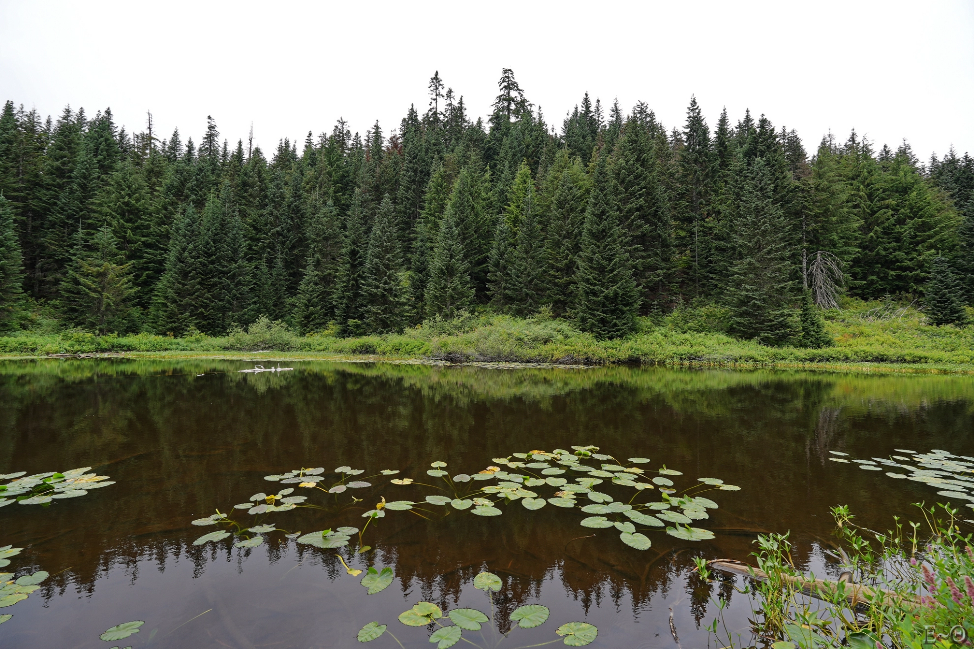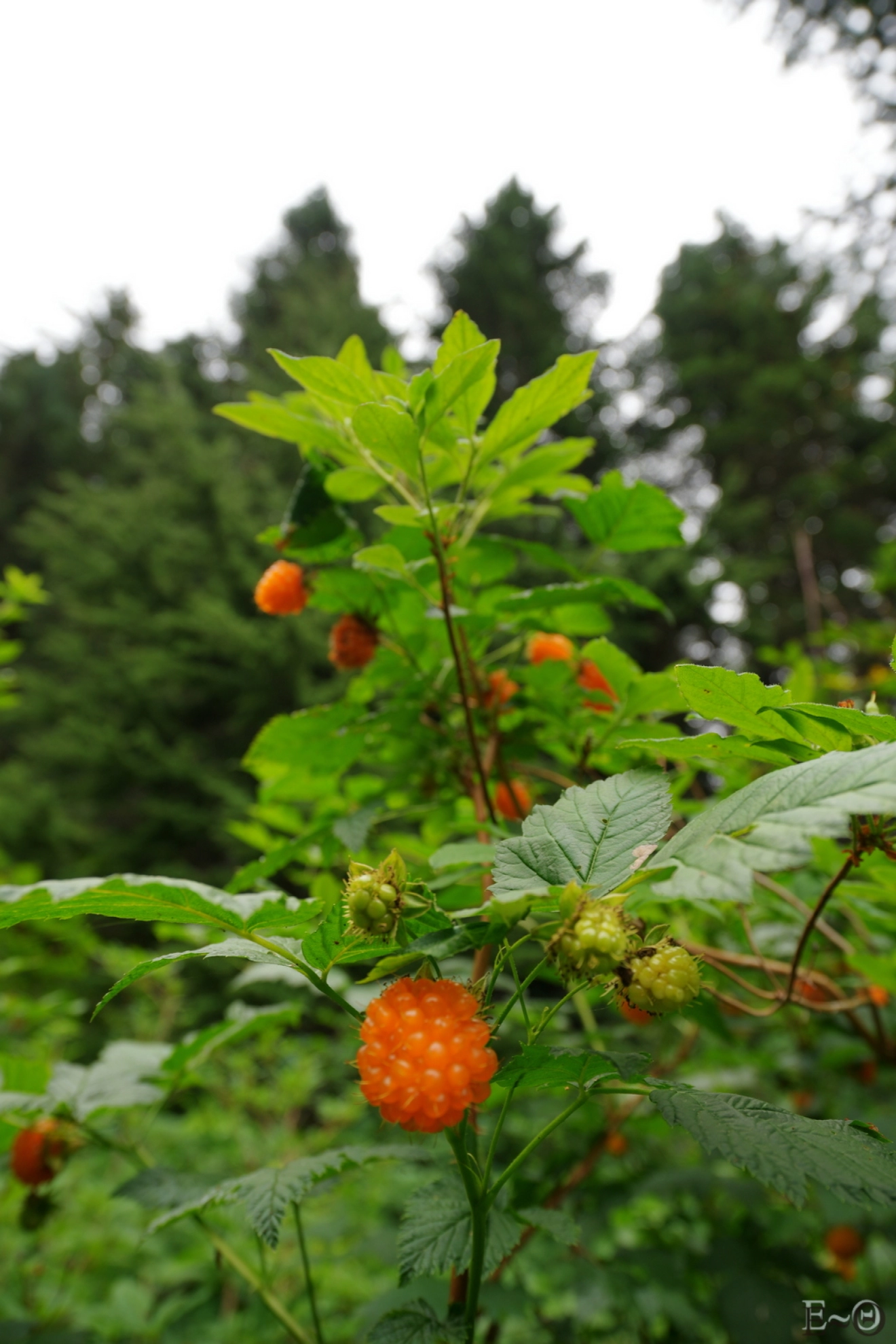 Nous faisons encore de nombreuses pauses, car nous avons sur le bord du trail toute la gamme des baies locales, myrtilles, airelles, mûres (salmonberry ou Rubus spectabilis), framboises jaunes (thimbleberry ou Rubus parviflorus). Bien évidemment nous mangeons plus que de raisonnables. Honnêtement, nous aurions tort de ne pas profiter du banquet et des opportunités culinaires et gastronomiques qui s’offrent à nous.
