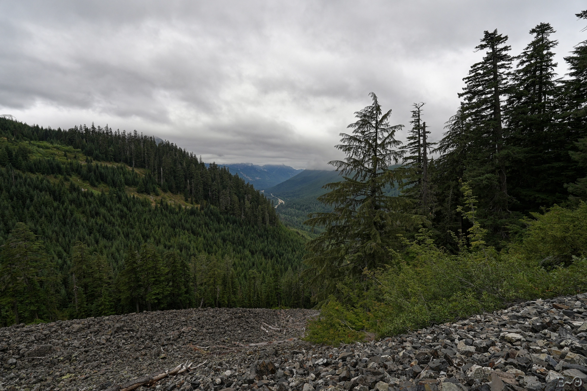 Pour nous, le lieu est insipide, inodore, et malheureusement sans intérêt, quelques rares chalets isolés, une autoroute, une épicerie, une station essence, un motel et c’est tout. Il est même franchement bruyant, ce que nous n’avions plus l’habitude de subir. Une gigantesque et démesurée highway de 4*2 voies déchirent les flancs des montagnes et un flot de véhicules passent indifférent à la beauté du site.