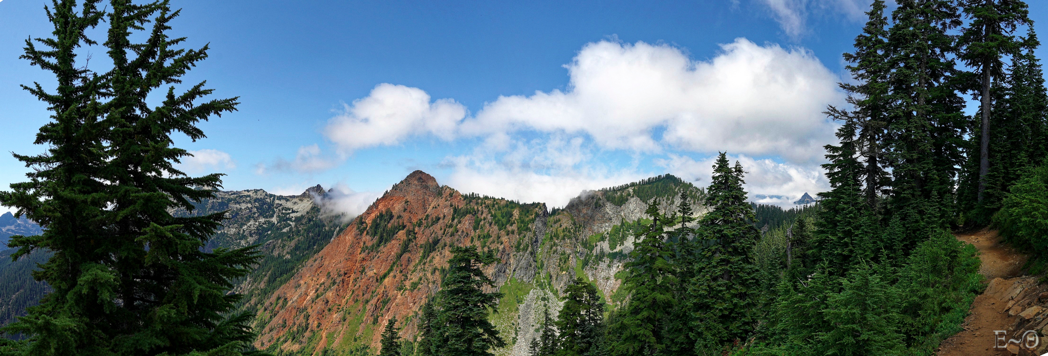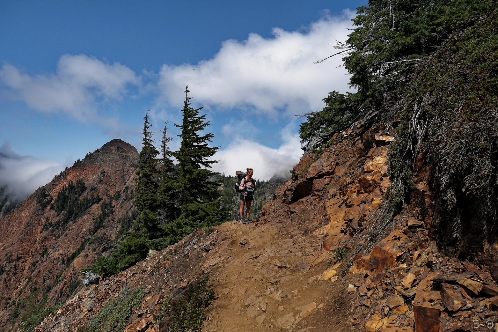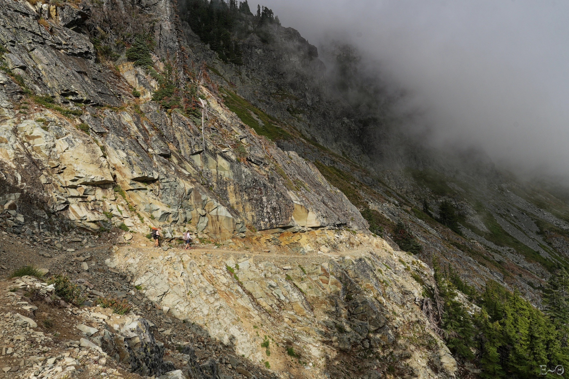 Au passage de Kendall Catwalk, col taillé dans la crête, qui va de Kendall Peak à Red mountain nous basculons soudainement au-dessus de Wenatchee National Forest. Le lieu est hallucinant, au lointain des nuages composent une folle farandole de formes. Au loin dans la vallée, d’immenses pentes sont rayées de falaises titanesques, de couleurs grises, noires ou rouge vif.