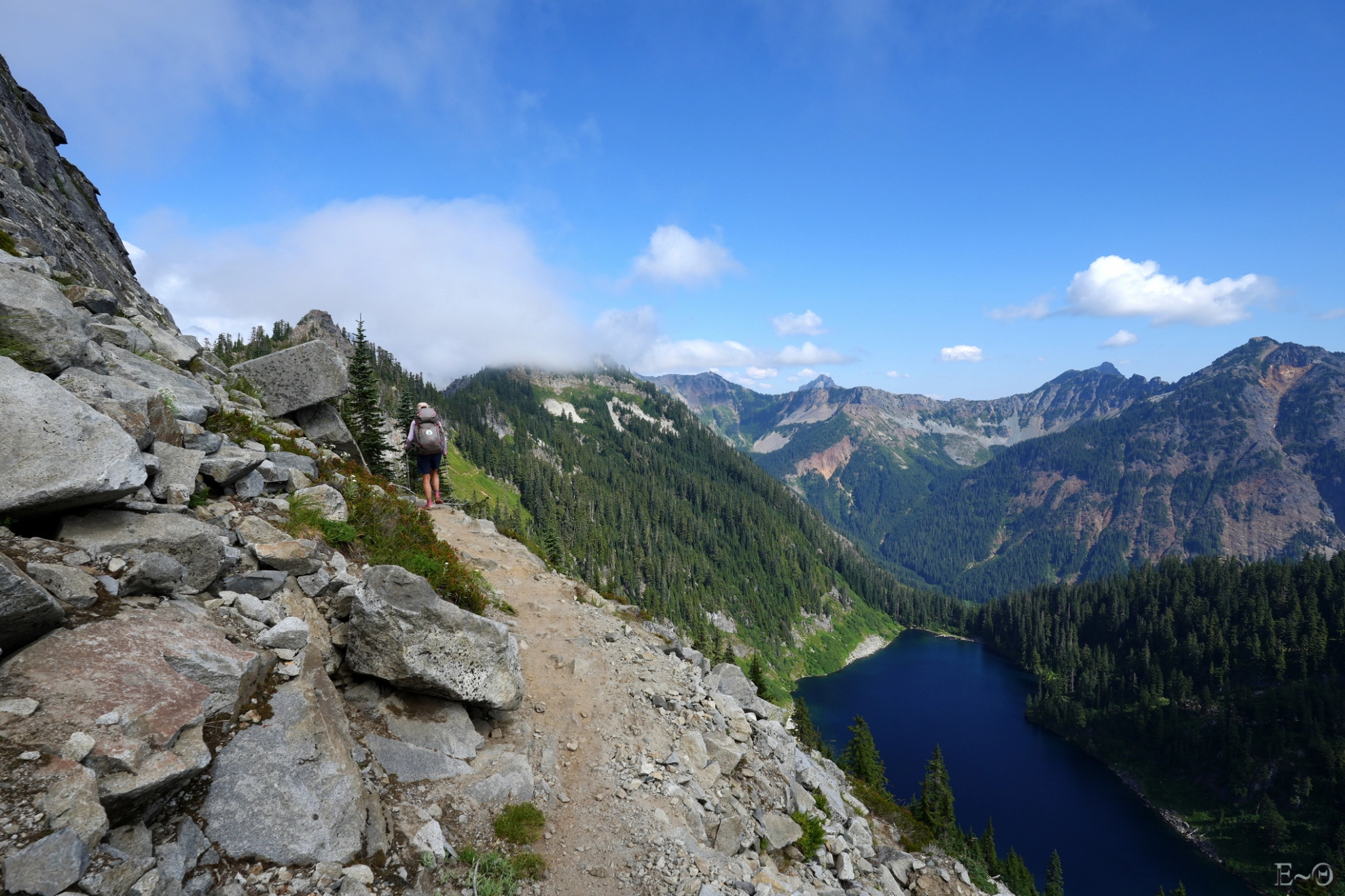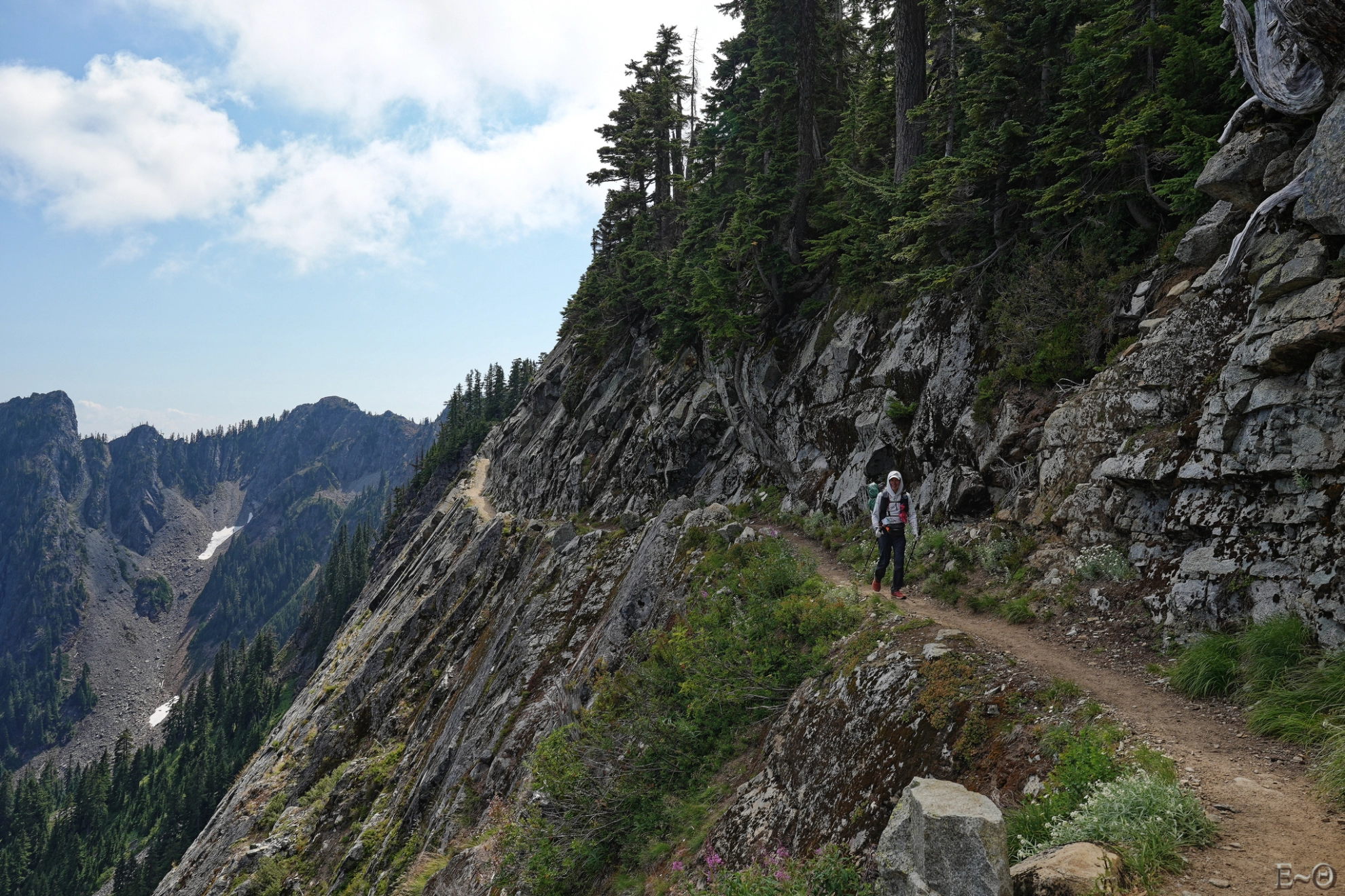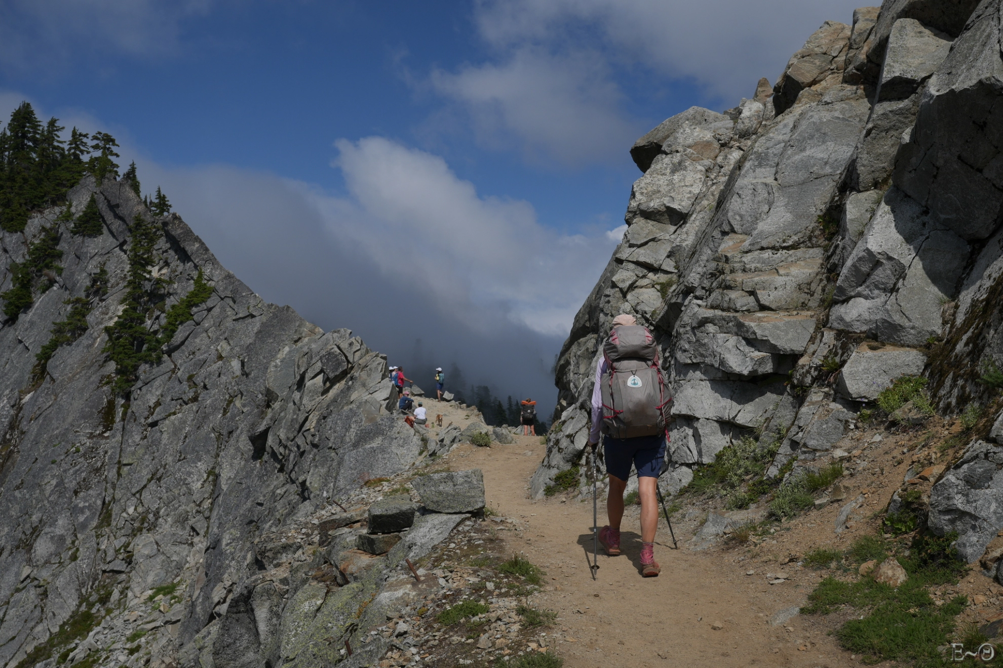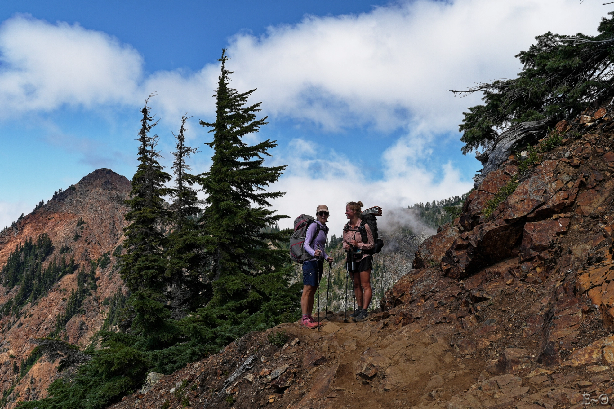 Au passage de Kendall Catwalk, col taillé dans la crête, qui va de Kendall Peak à Red mountain nous basculons soudainement au-dessus de Wenatchee National Forest. Le lieu est hallucinant, au lointain des nuages composent une folle farandole de formes. Au loin dans la vallée, d’immenses pentes sont rayées de falaises titanesques, de couleurs grises, noires ou rouge vif.