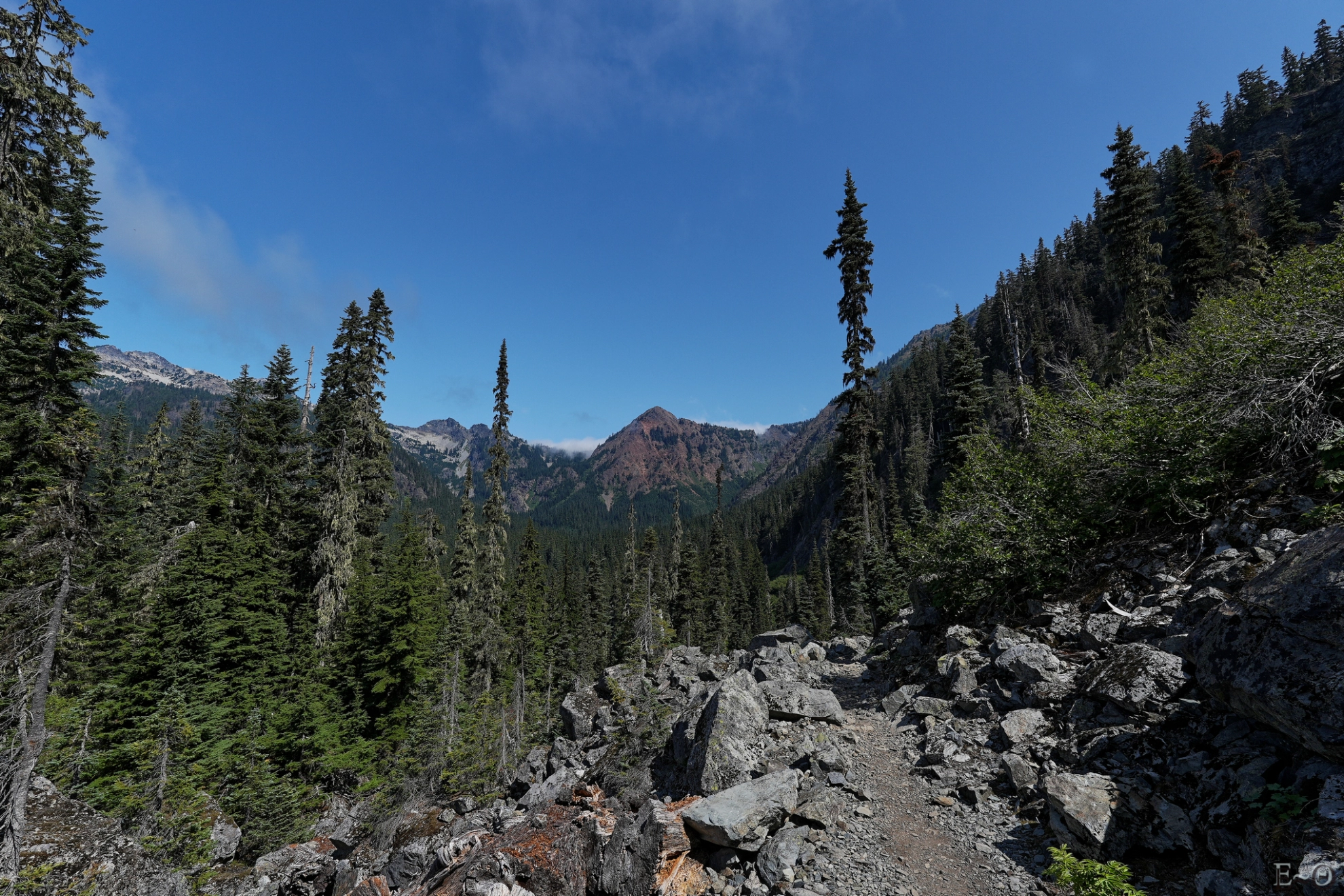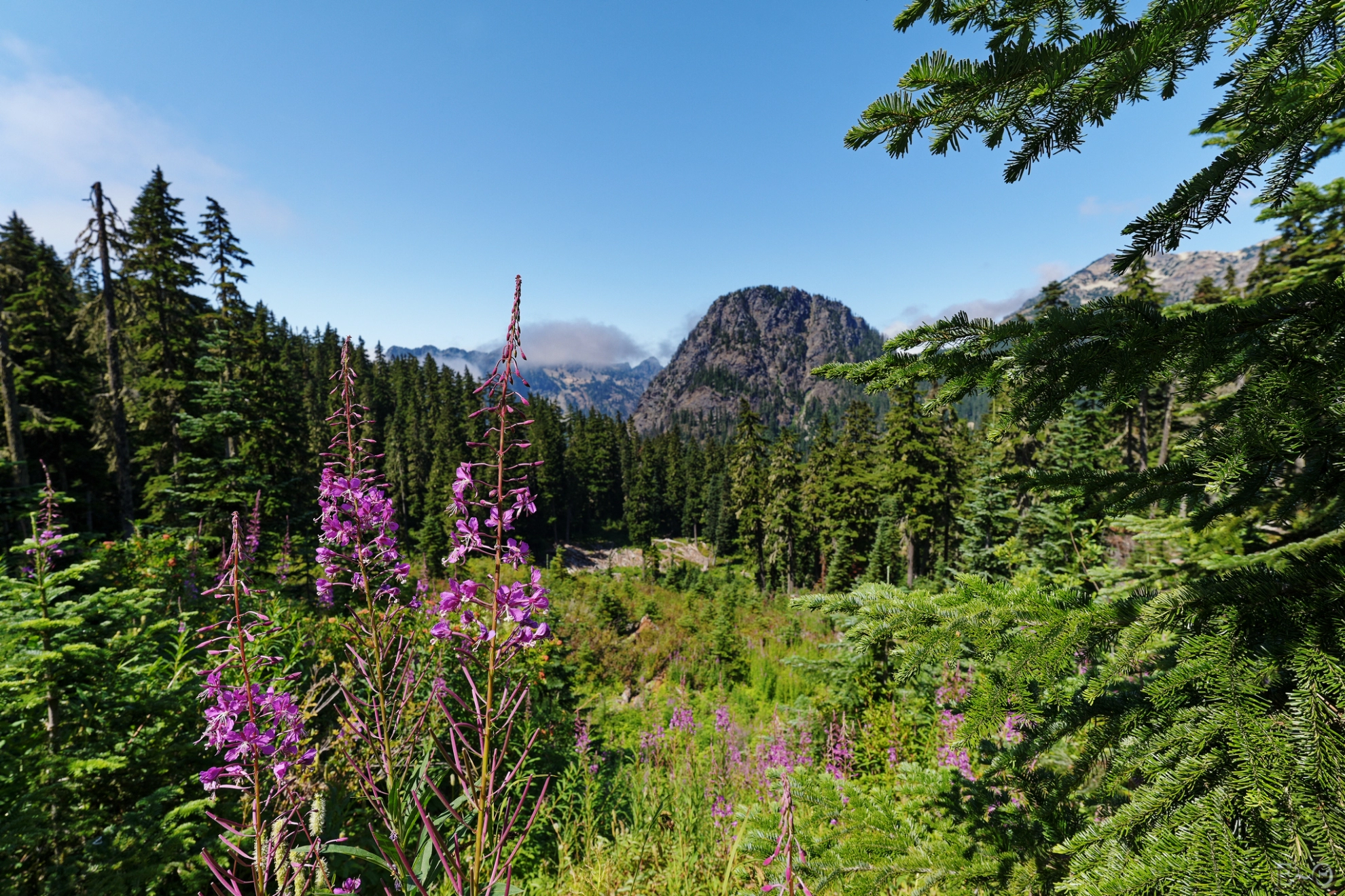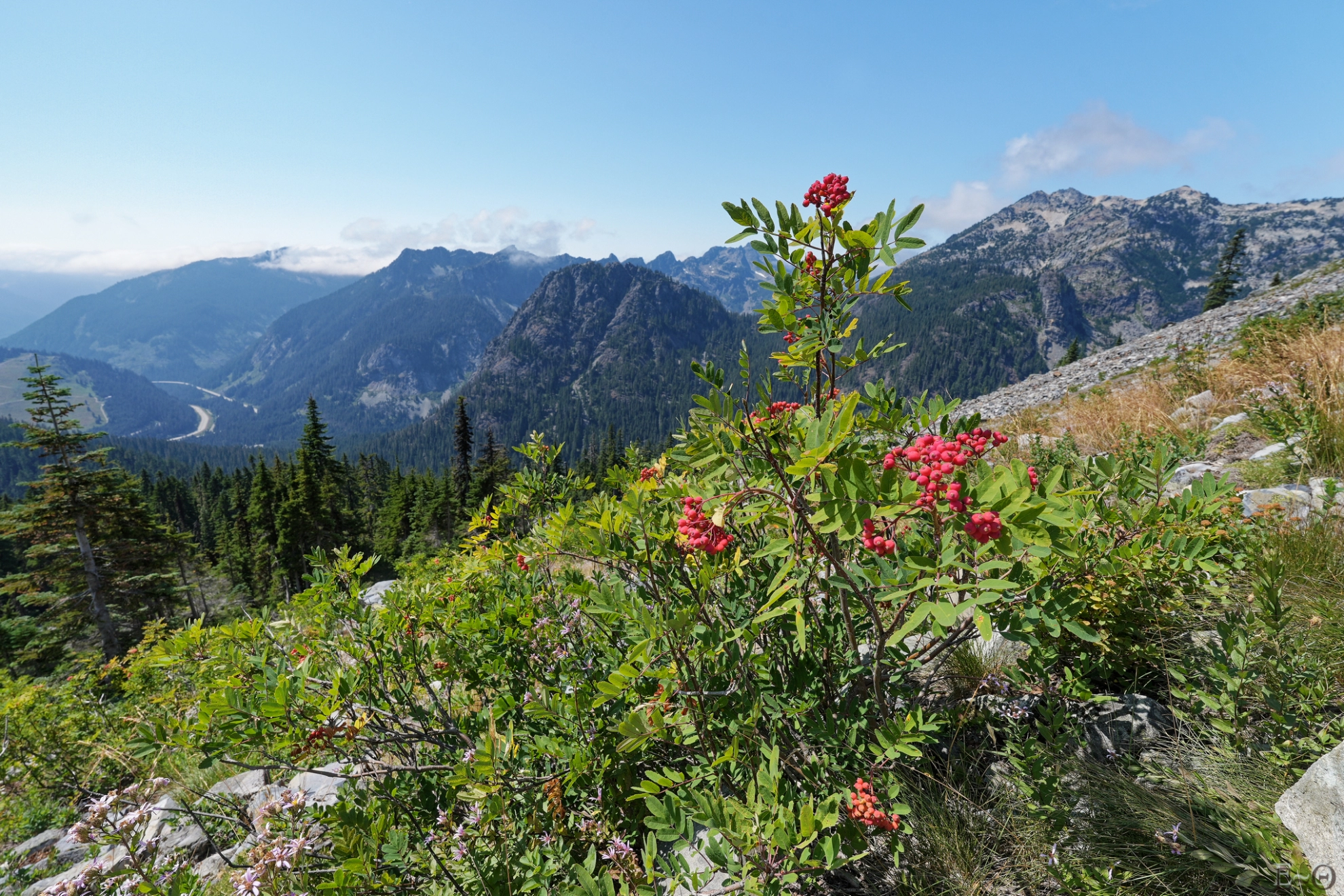 C’est une des plus belles étapes du PCT. Les montagnes sont peu hautes en altitude, par contre elles sont de caractères bien trempés. C’est féerique et grandiose. Nous continuons vers le nord sur un chemin de cabri, taillé dans une paroi interminable. Juste après Collar mountain et Ridge lake, nous passons dans les alpages sous Alaska Mountain. Les couleurs de la flore sont des plus folles qui soient.
