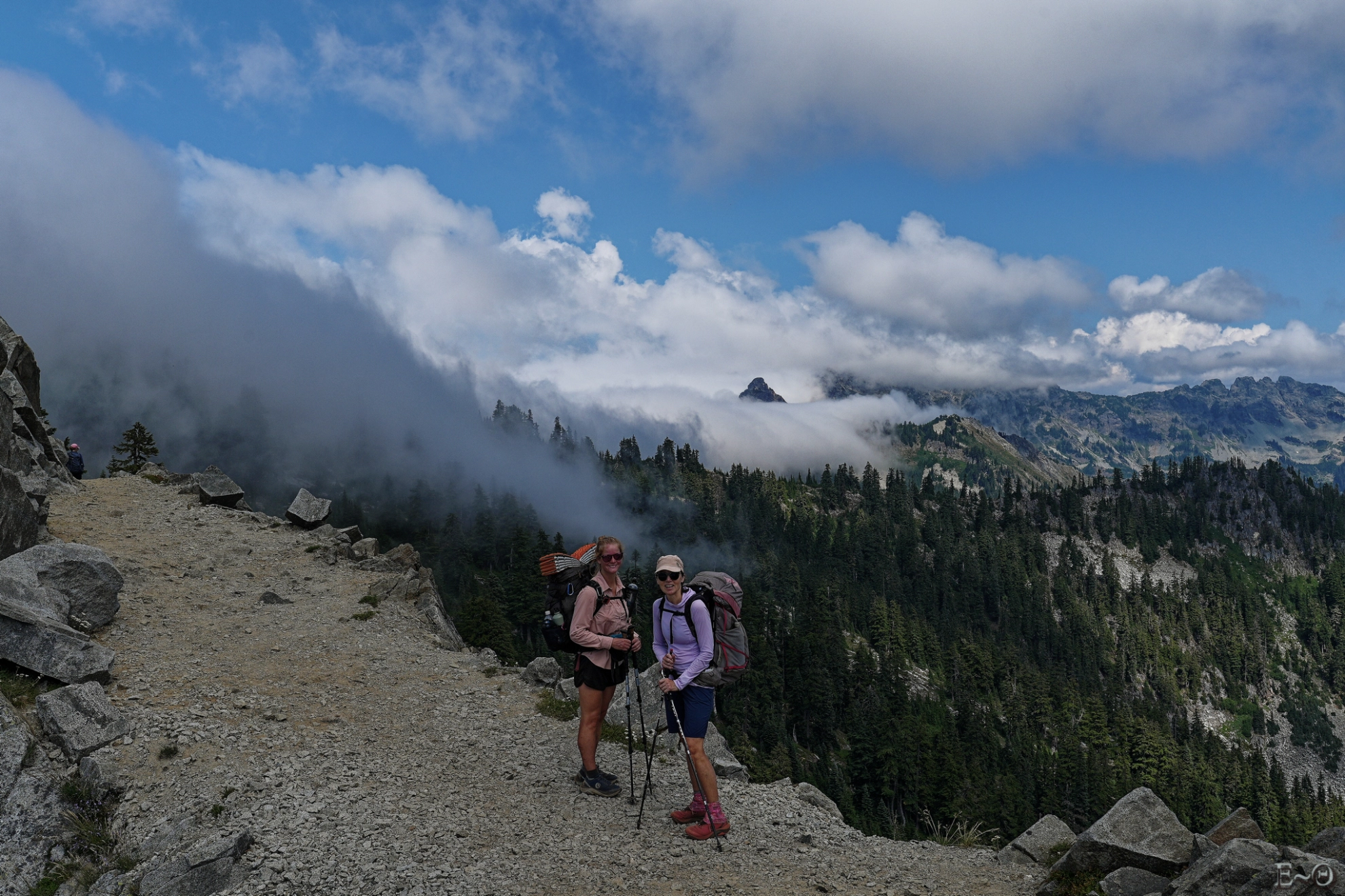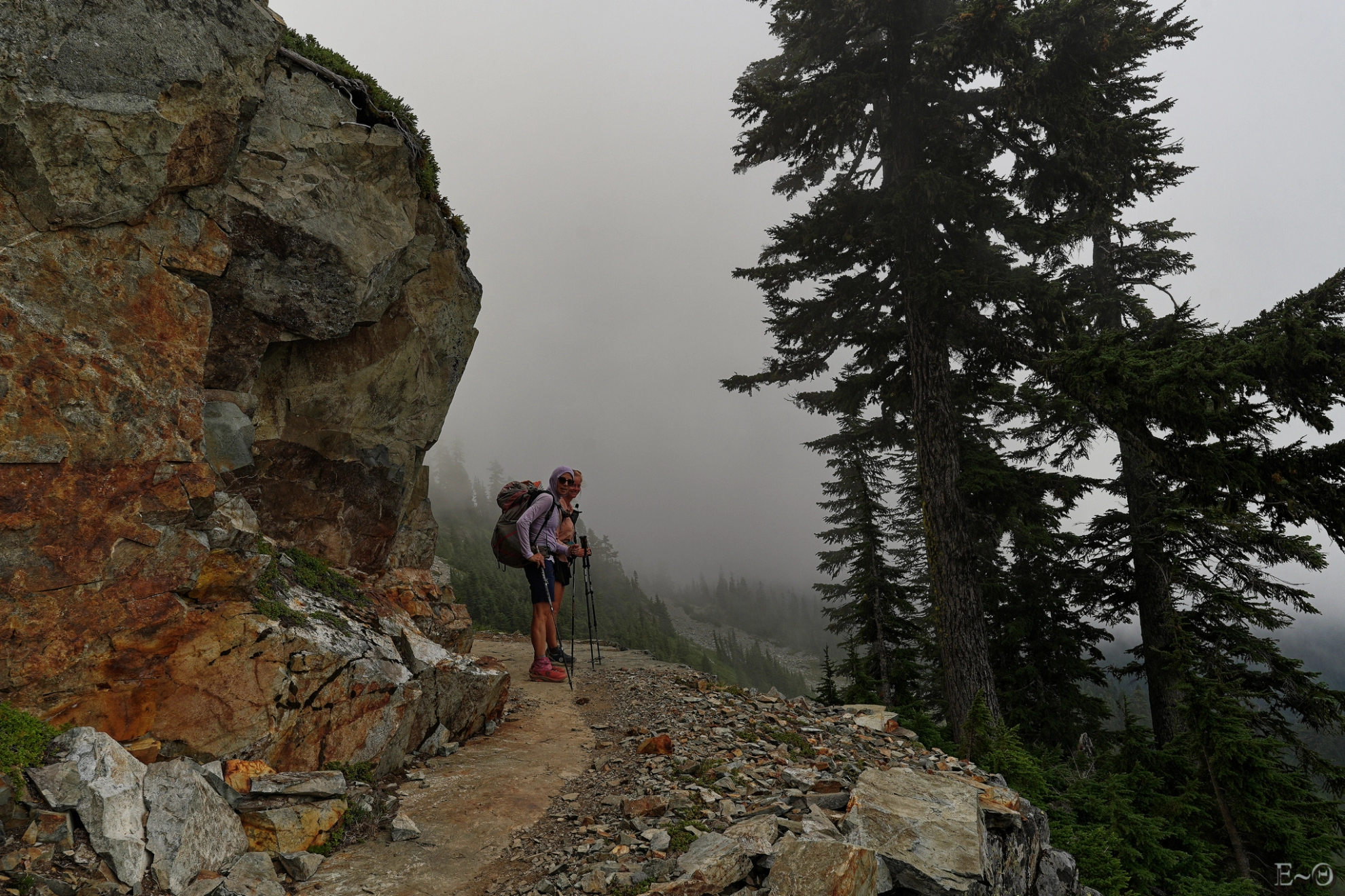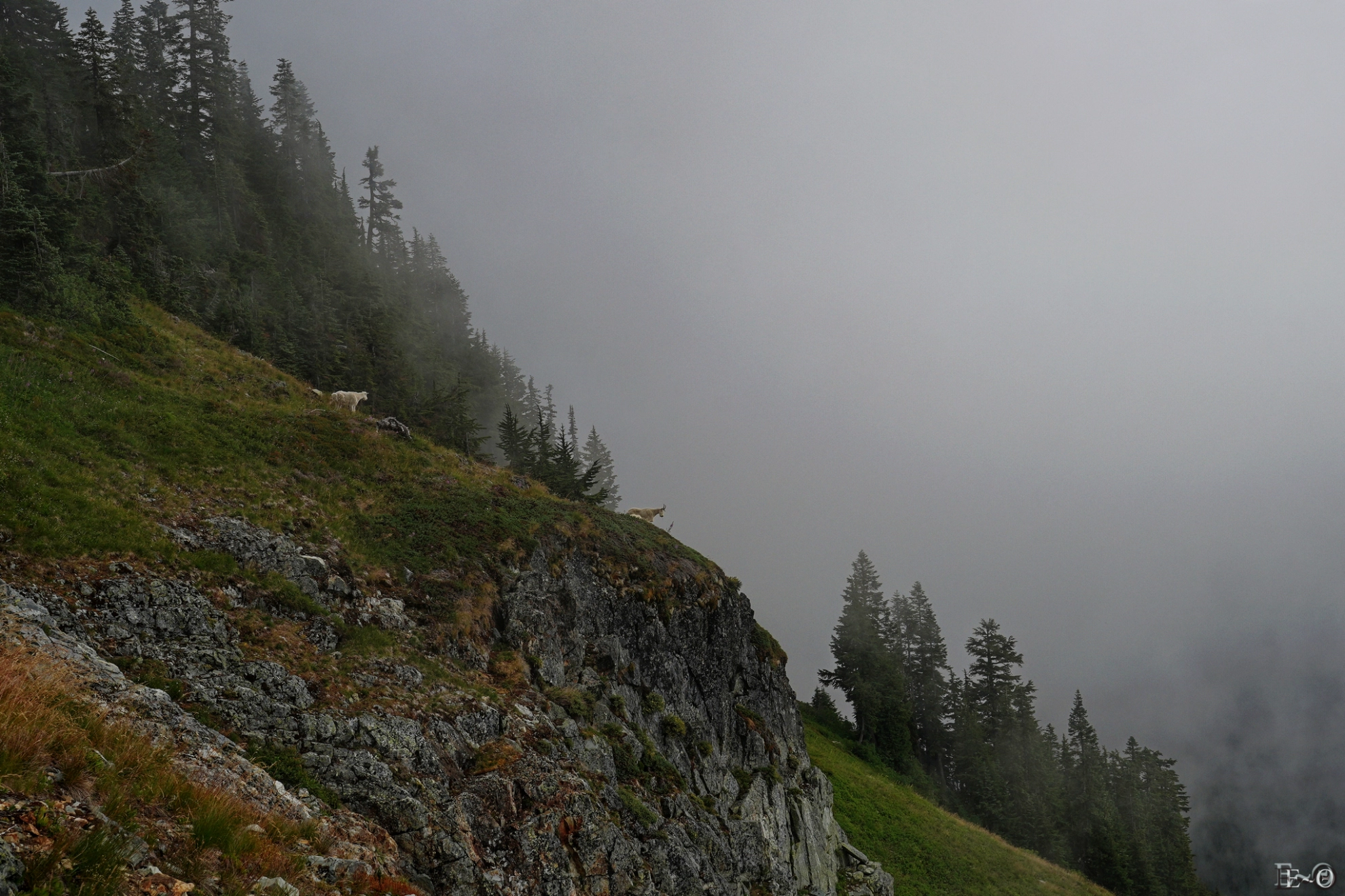 Nous avons aussi une réelle chance. Nous rencontrons de nombreux animaux : chipmunks, pikas, marmottes, et surtout la star des montagnes des North Cascades, la chèvre des montagnes. À une semaine de la fin, c’est inespéré de voir cet animal symbolique et en voie de disparition. En descente, après Huckelberry Moutain, sous Chikamin Peak, sur un promontoire surplombant le vide, en plein brouillard, une harde de Mountains Goats pose. Des juvéniles sont réfugiés auprès des mères et ne bougent pas à notre passage. C’est un vrai moment extraordinaire et exceptionnel.
