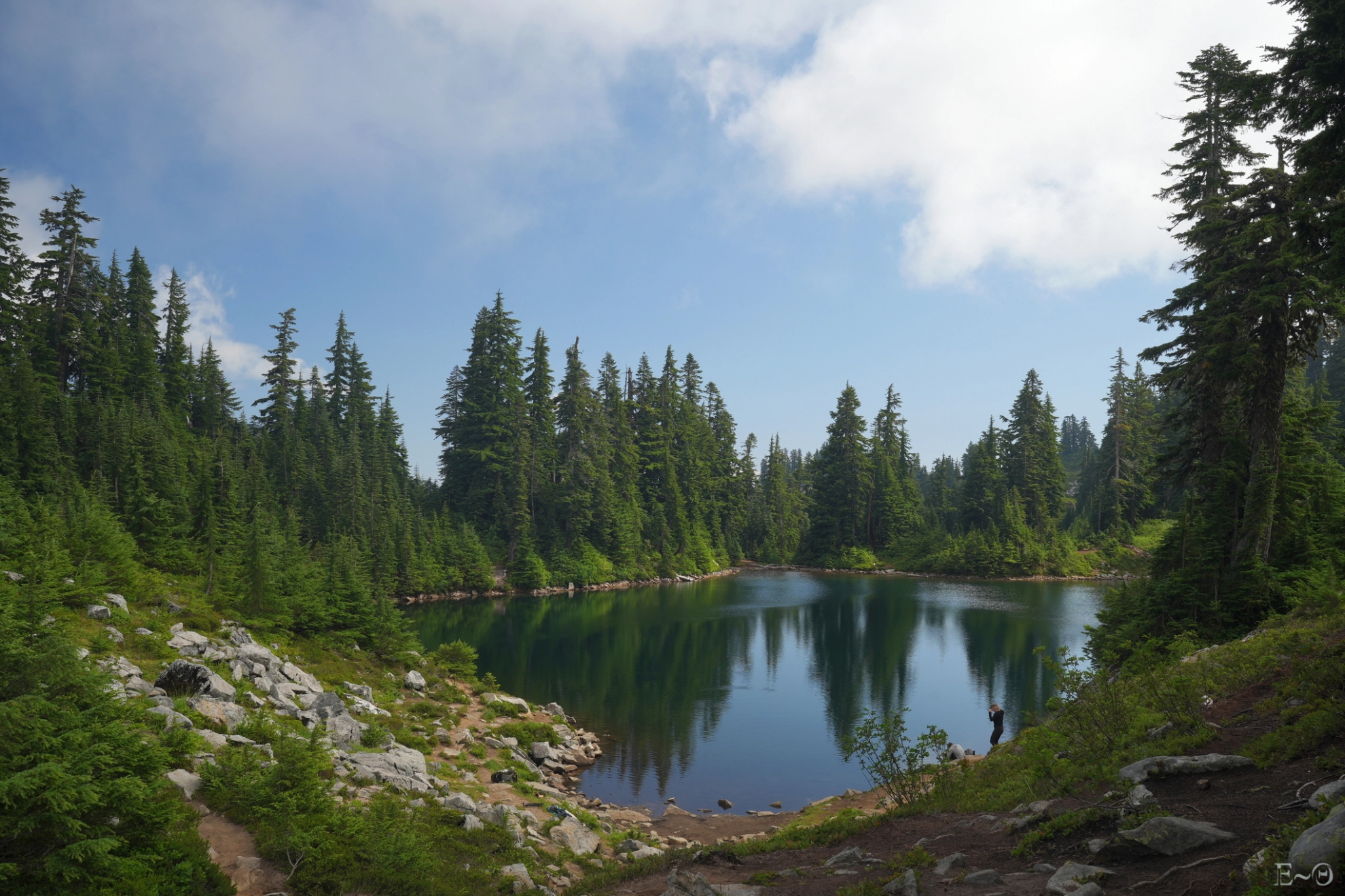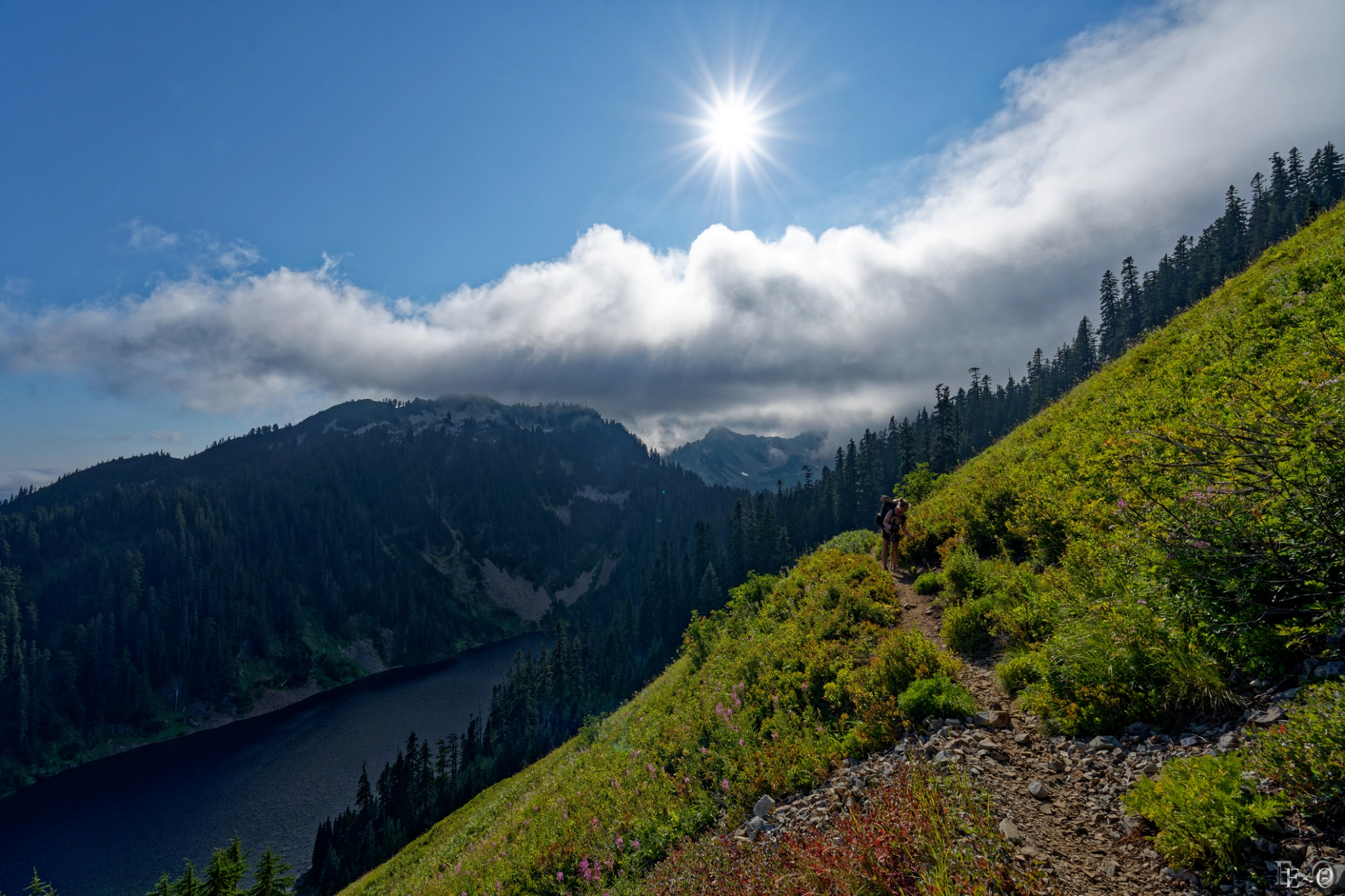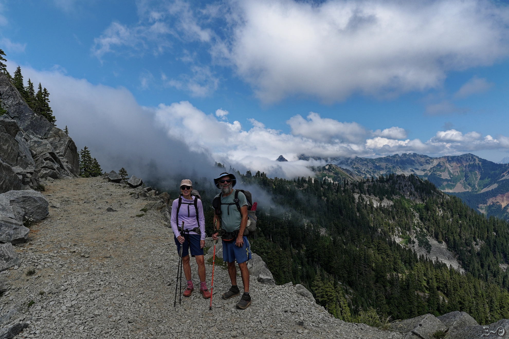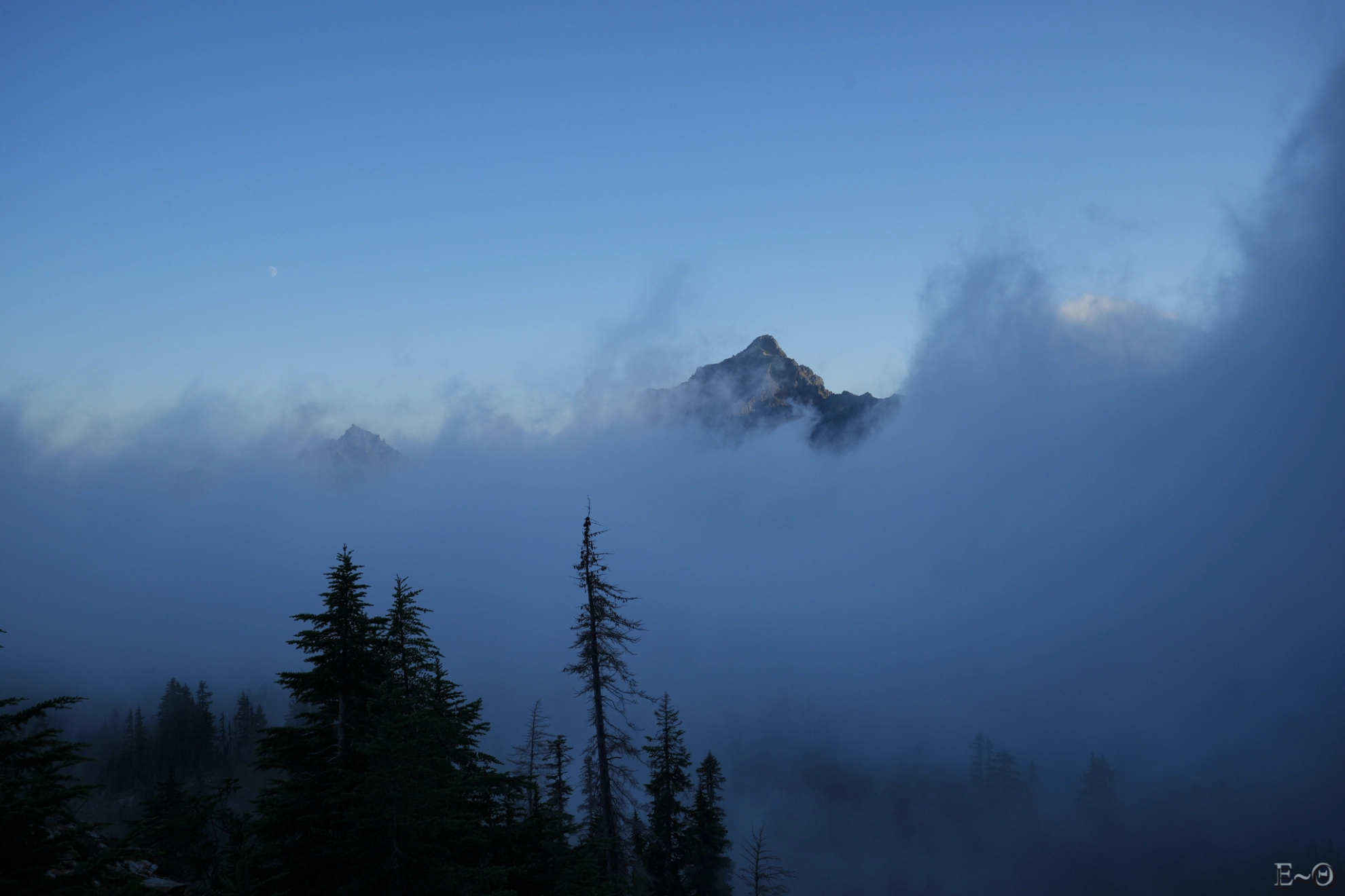 Nous avons aussi une réelle chance. Nous rencontrons de nombreux animaux : chipmunks, pikas, marmottes, et surtout la star des montagnes des North Cascades, la chèvre des montagnes. À une semaine de la fin, c’est inespéré de voir cet animal symbolique et en voie de disparition. En descente, après Huckelberry Moutain, sous Chikamin Peak, sur un promontoire surplombant le vide, en plein brouillard, une harde de Mountains Goats pose. Des juvéniles sont réfugiés auprès des mères et ne bougent pas à notre passage. C’est un vrai moment extraordinaire et exceptionnel.