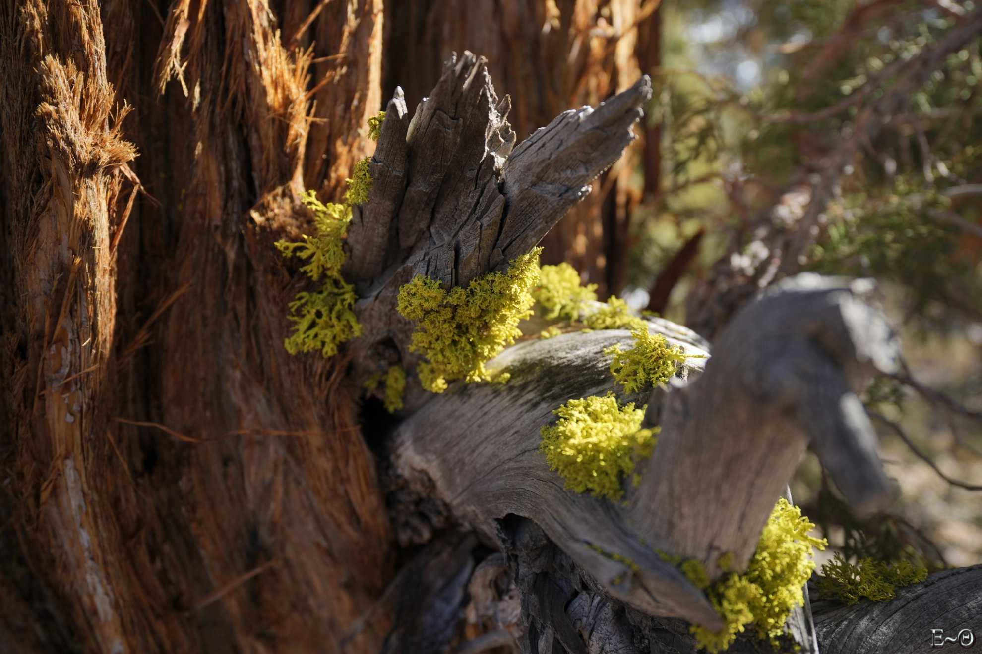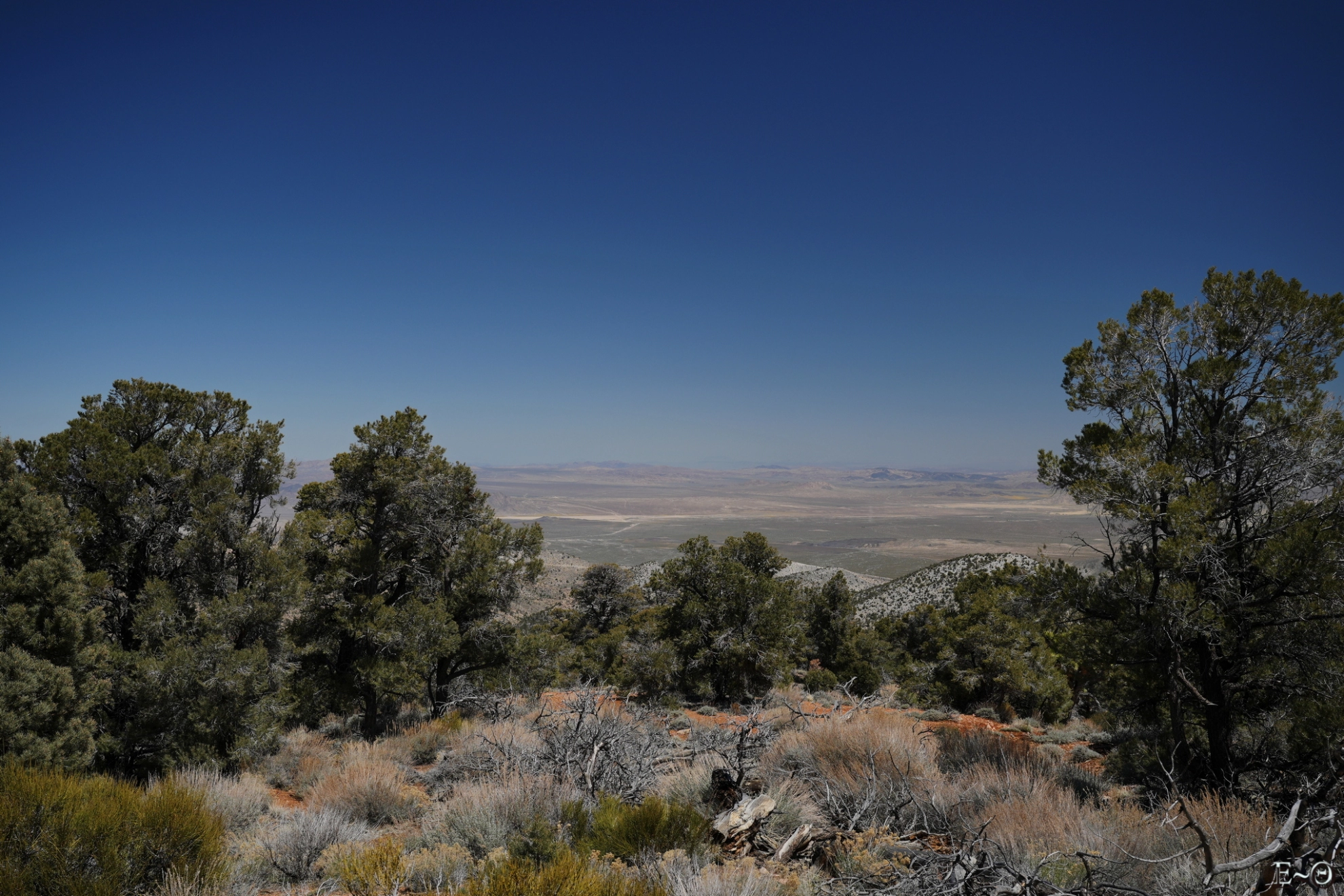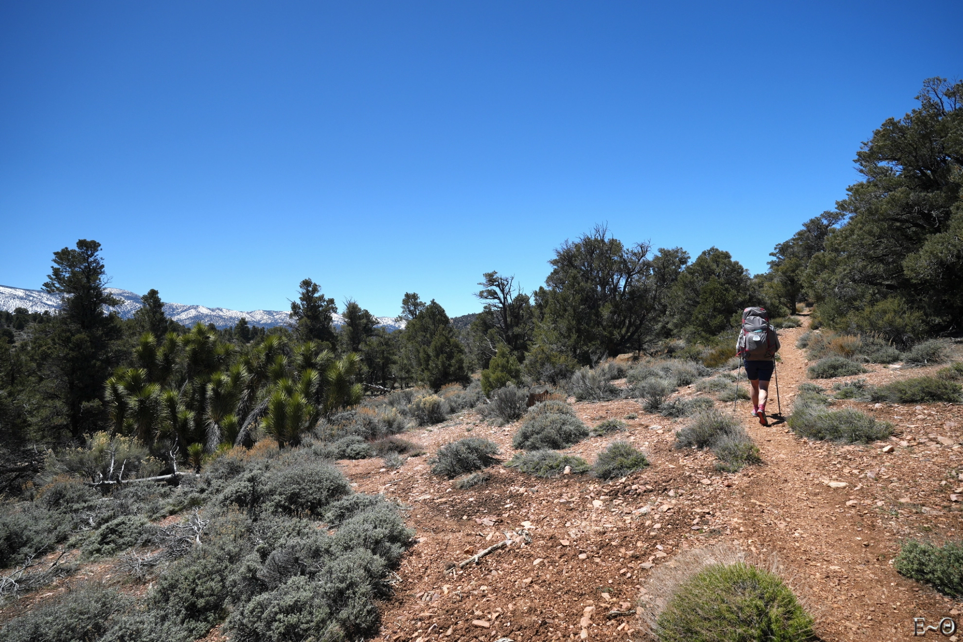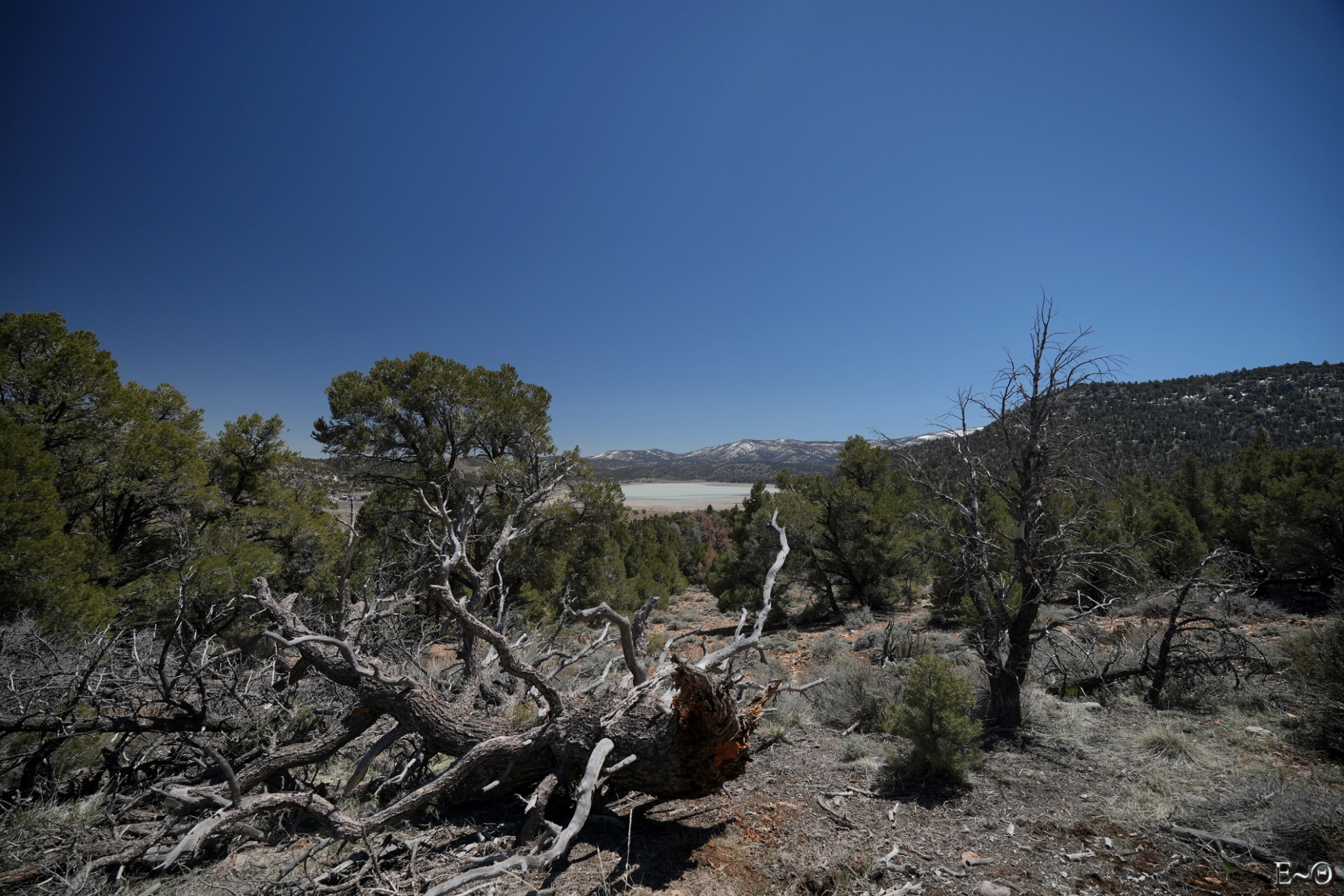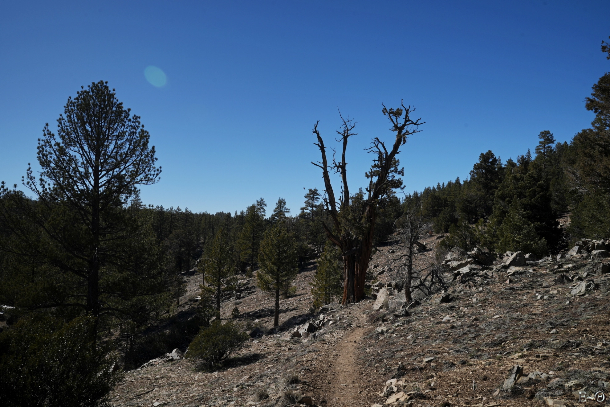 Nous sommes à pied d’œuvre vers 12 h 00. Le sentier monte en pente douce, et surplombe le lac Baldwin d’une couleur bleu turquoise sur notre gauche. Ephémère, il est réapparu en 2023. Il n’avait pas été vu depuis vingt ans. Le désert du Mojave sur notre droite est de nouveau présent. Il est de plus en plus impressionnant. Tout en nuance de rouge, d’ocre, de jaune, ça et là des taches vertes laissent deviner que le printemps démarre pour plusieurs semaines. Au bout d’une heure, nous croisons une zone intégralement brûlée. Les arbres sont morts depuis longtemps et leurs troncs blanchâtres, délavés créent une ambiance fantomatique. La forêt ne repoussera plus ici. C’est le désert qui est maintenant roi.