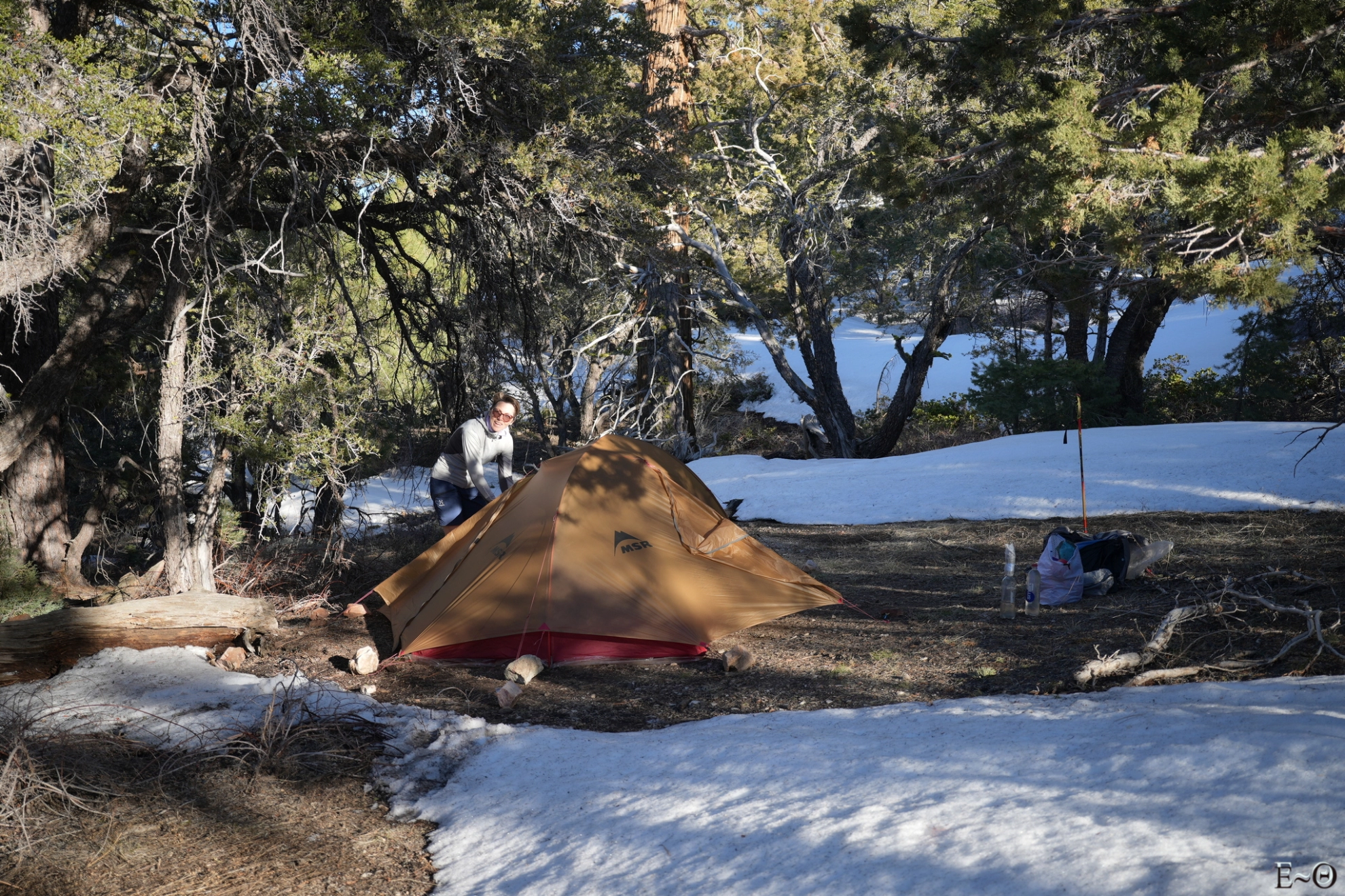 Dans l’après-midi nous retrouvons les forêts de la veille et aussi la neige. Certes éparse, elle est toutefois suffisante pour nous ralentir le long des flancs de Gold Mountain. Après avoir laissé Tanglewood Group Campground sur notre droite, nous entamons la montée des pentes de Bertha Peak, vers un col où nous devrions trouver des places ou dormir.