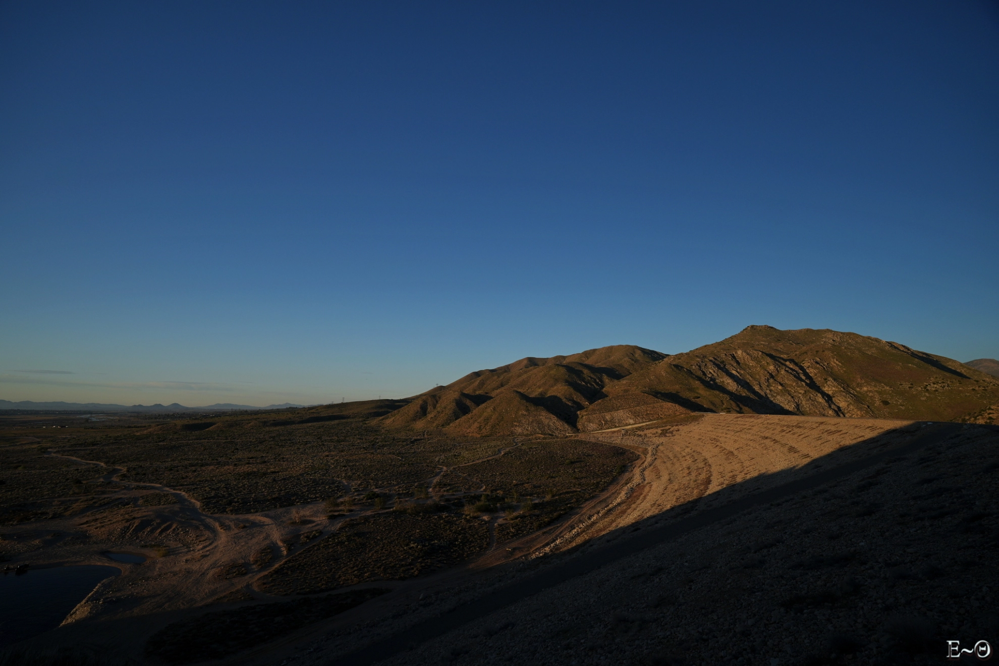 Un long coucher de soleil nous accompagne pendant plus d’une heure. Nous arrivons enfin à destination vers 19 h et passons les 32 kilomètres (premier 20 miles symboliques). Le régent du bar Joshua Inn vient nous chercher en voiture après un rapide appel téléphonique, au niveau d’un barrage qui protège la plaine de l’Apple Valley Highlands. Nous imaginons bien un débordement de la rivière Mojave et Deep qui se rejoigne ici. Les habitations sont toutes à niveau de l’eau. Ce serait catastrophique.
