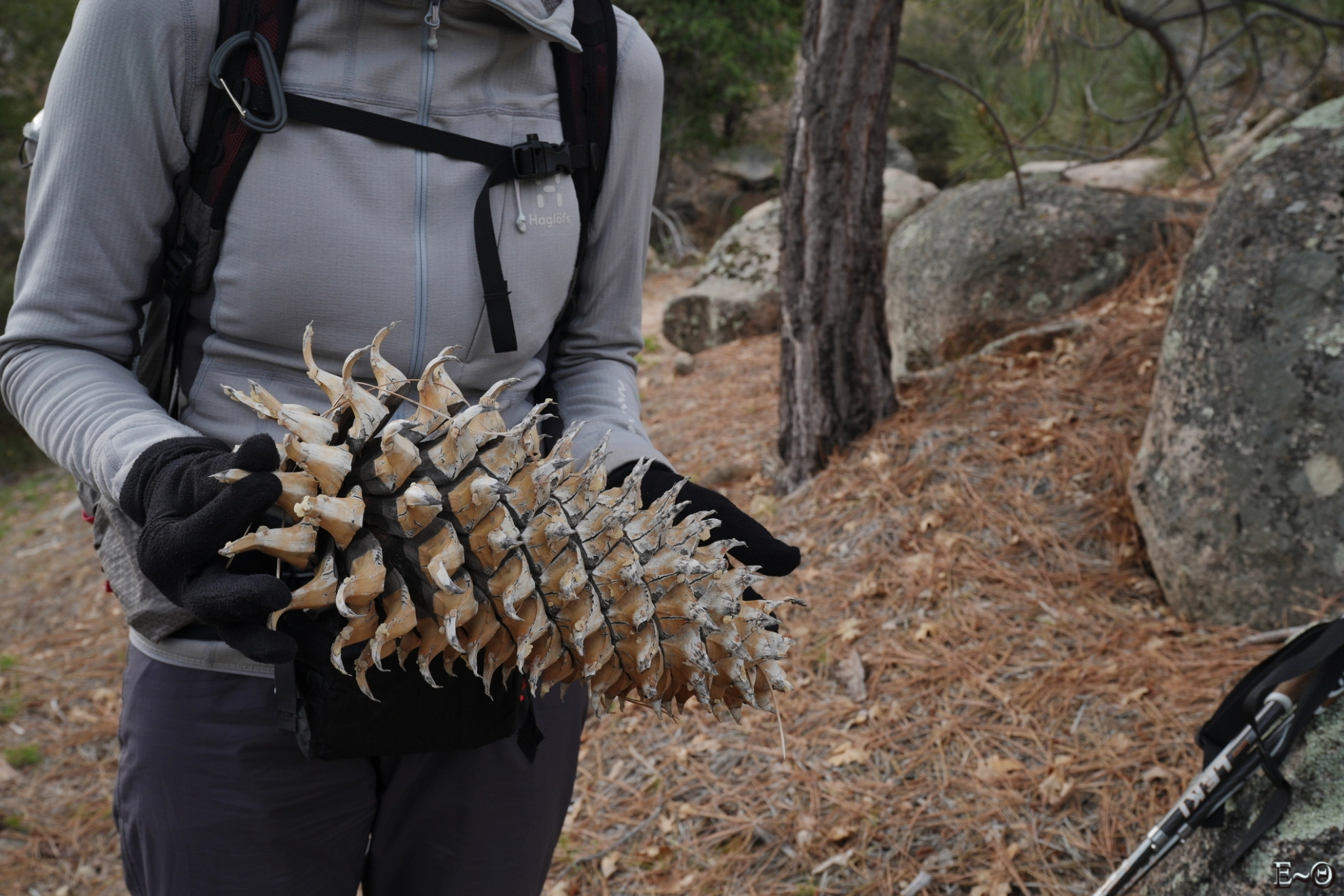 Nous démarrons au matin en rive droite de la rivière Holcomb. La journée sera sur la même thématique, celui de la randonnée en canyon. L’ambiance est agréable, ombragée sous des pins, le long de pentes herbeuses sans cactus. Les pommes de pin au sol sont incroyables. Elles font plus de 50 cm et, pour certaines, pèsent entre un et deux kilos. Elles sont coupantes comme des rasoirs et leurs extrémités pointues et recourbées, semblables à des griffes imposent une certaine attention lorsqu’on les manipule. Il ne faudrait pas que l’une d’entre elles vienne à nous tomber sur la tête.