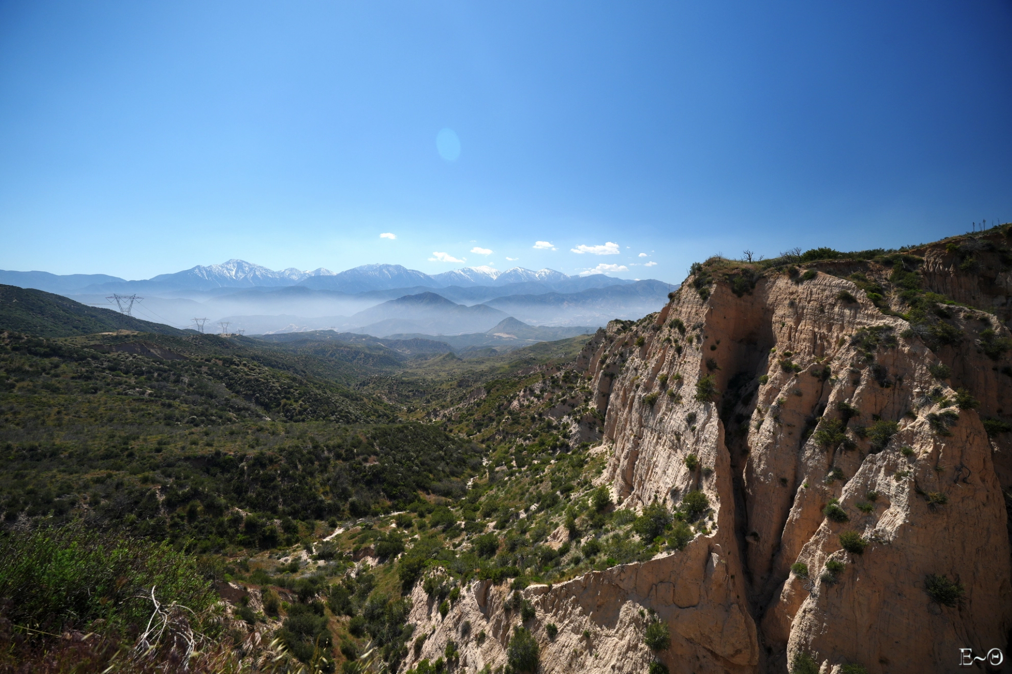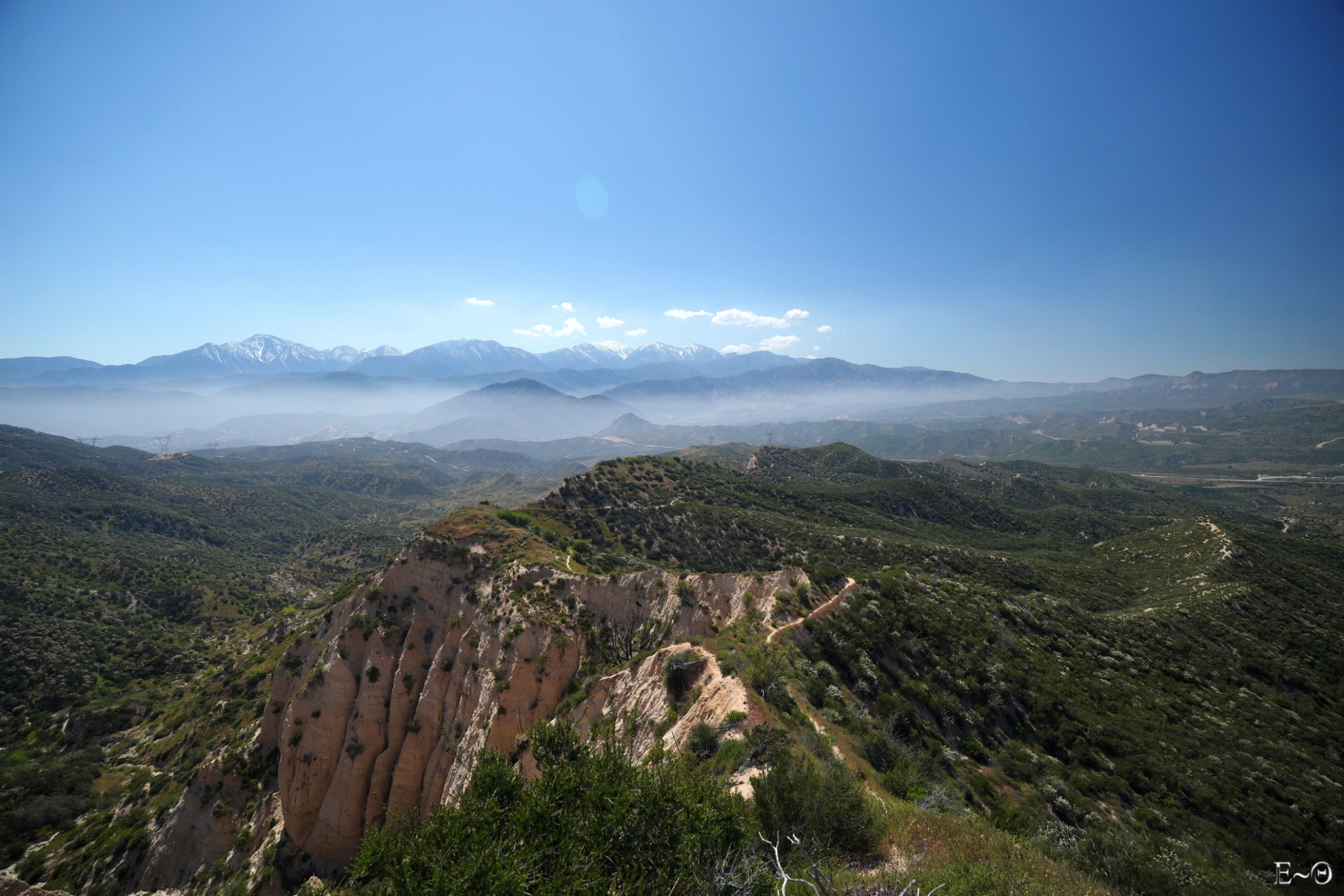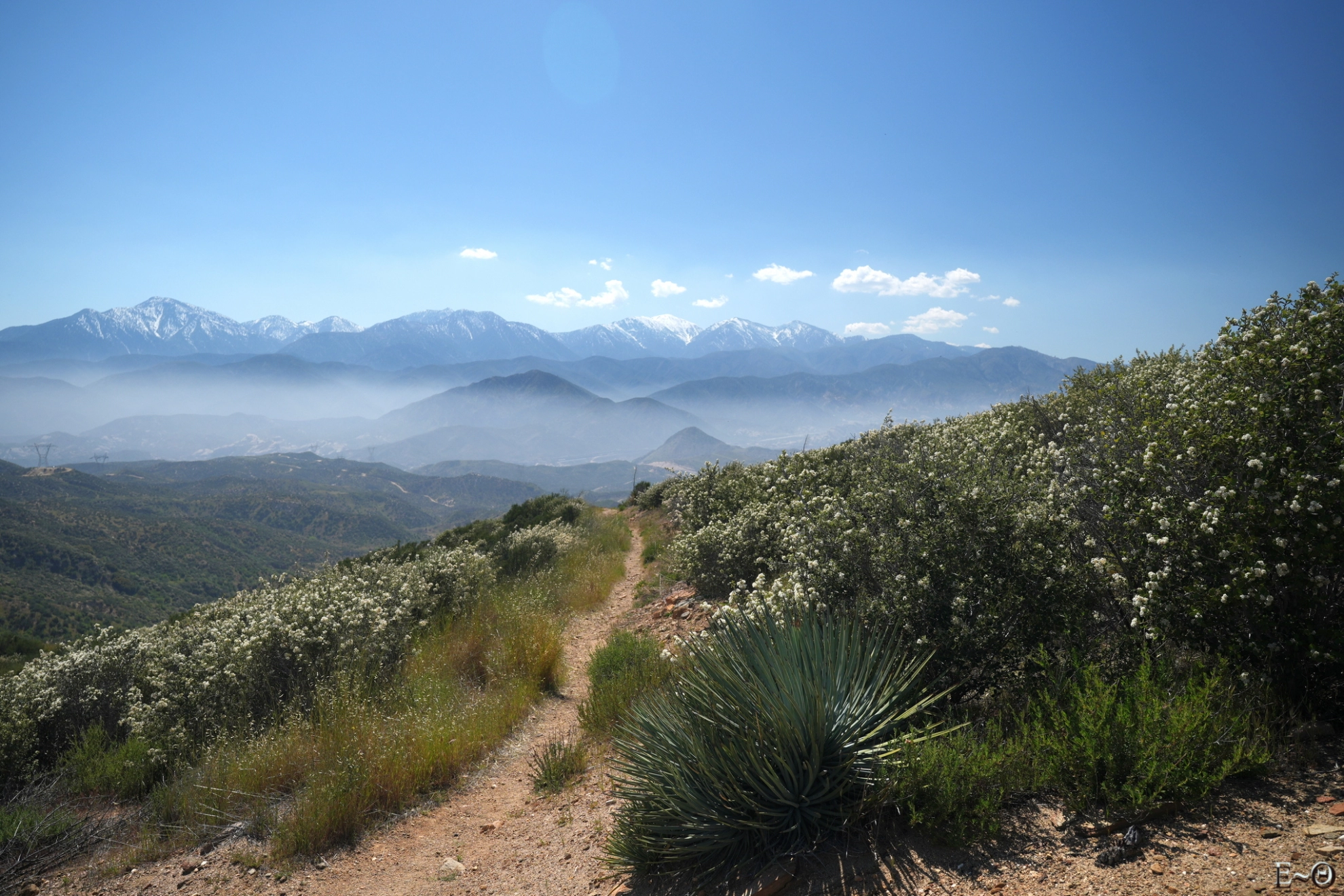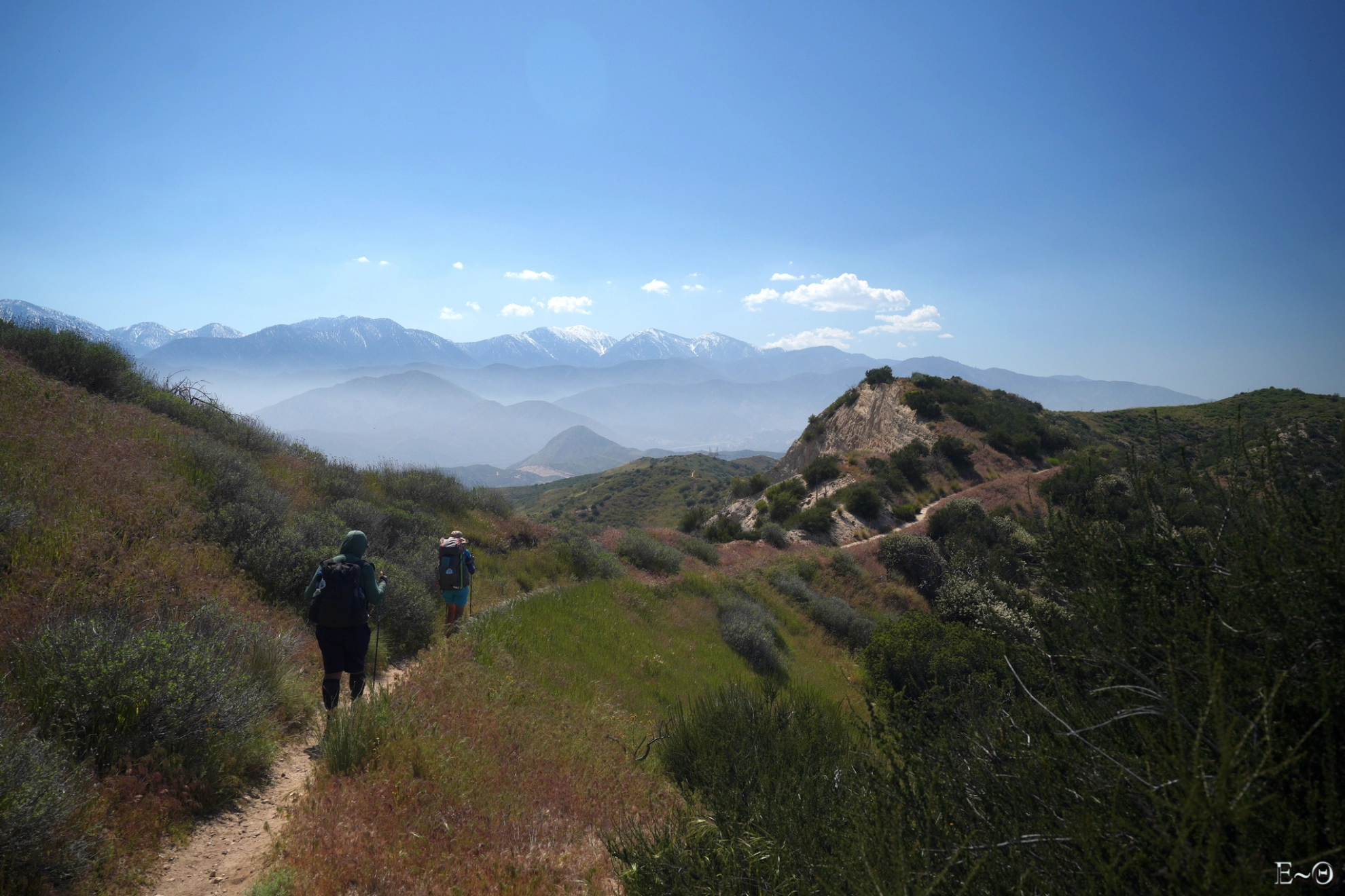 Aujourd’hui, nous devrions arriver à Cajon Jonction. Le PCT croise un Mc Donalds au milieu d’une zone désertique. C’est un lieu classique de pause. Nous partons vers 8 h 30 et retrouvons rapidement le chemin. Nous évoluons toujours parmi les mêmes collines semi-arides le long de Cleghorn mountain, puis de Little Horsethief canyon. La faune est peu présente, sauf des grillons, qui font leurs apparitions sonores. On se croirait vraiment dans le sud de la France. Après une dernière ascension, et quelques serpents quotidiens, nous franchissons un col sans nom qui surplombe une falaise ocre, tas de sable gigantesque avec vue sur le mont Baden Powell, notre prochaine étape, dans trois jours. Le panorama est spectaculaire. Les sommets sont dans une brume qui crée des dégradés de teintes qu’il est difficile de décrire, mélange de blancs, de verts, aux reflets moirés, changeant au gré des vents et des montées et descentes du PCT.