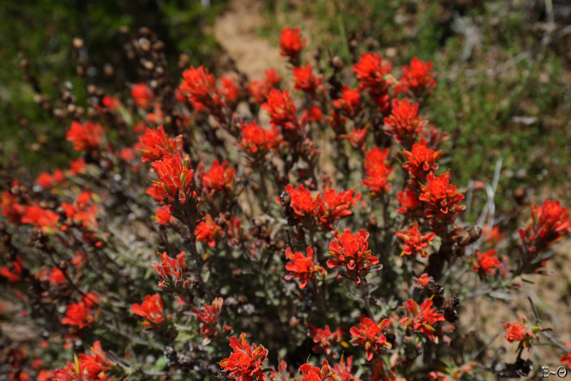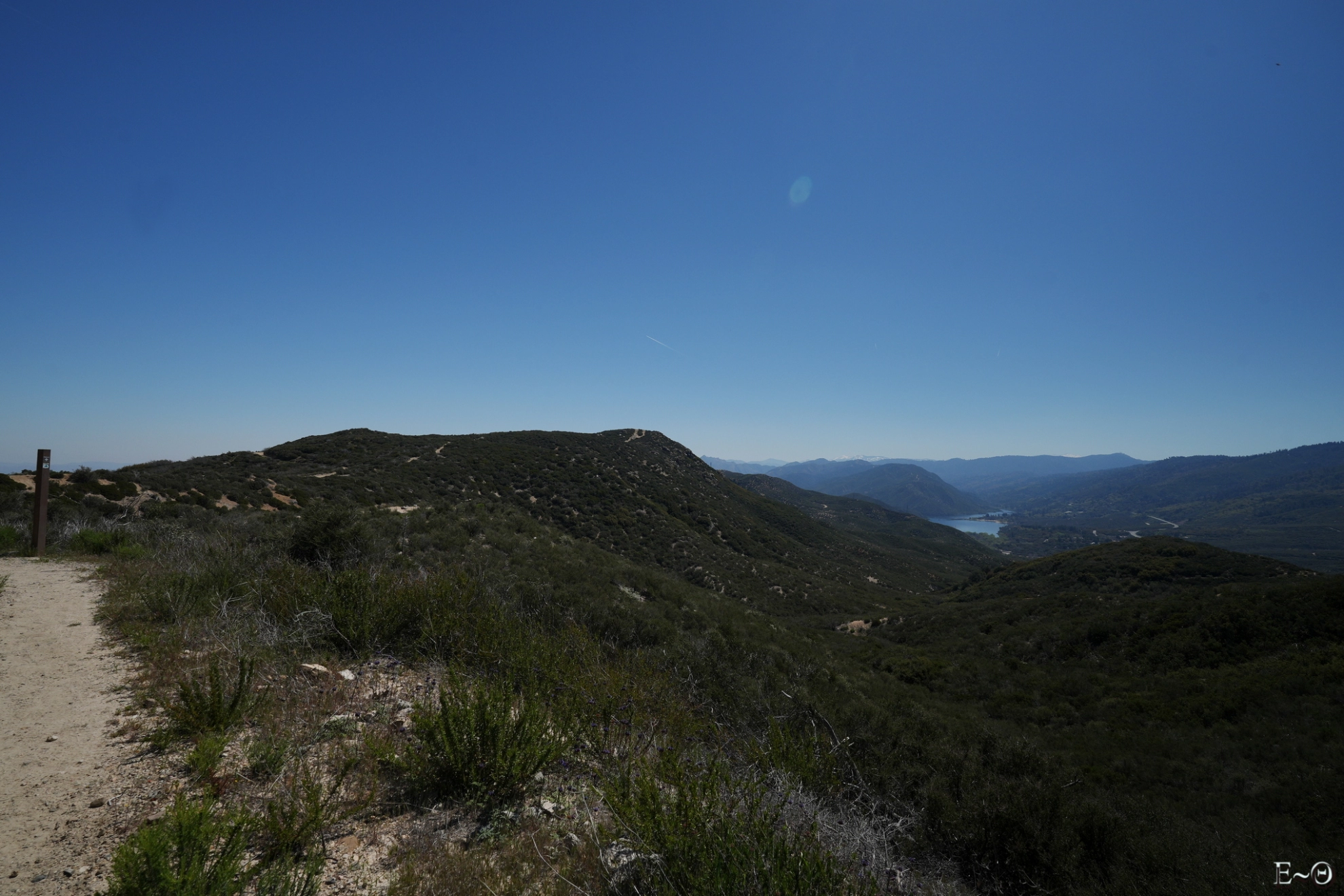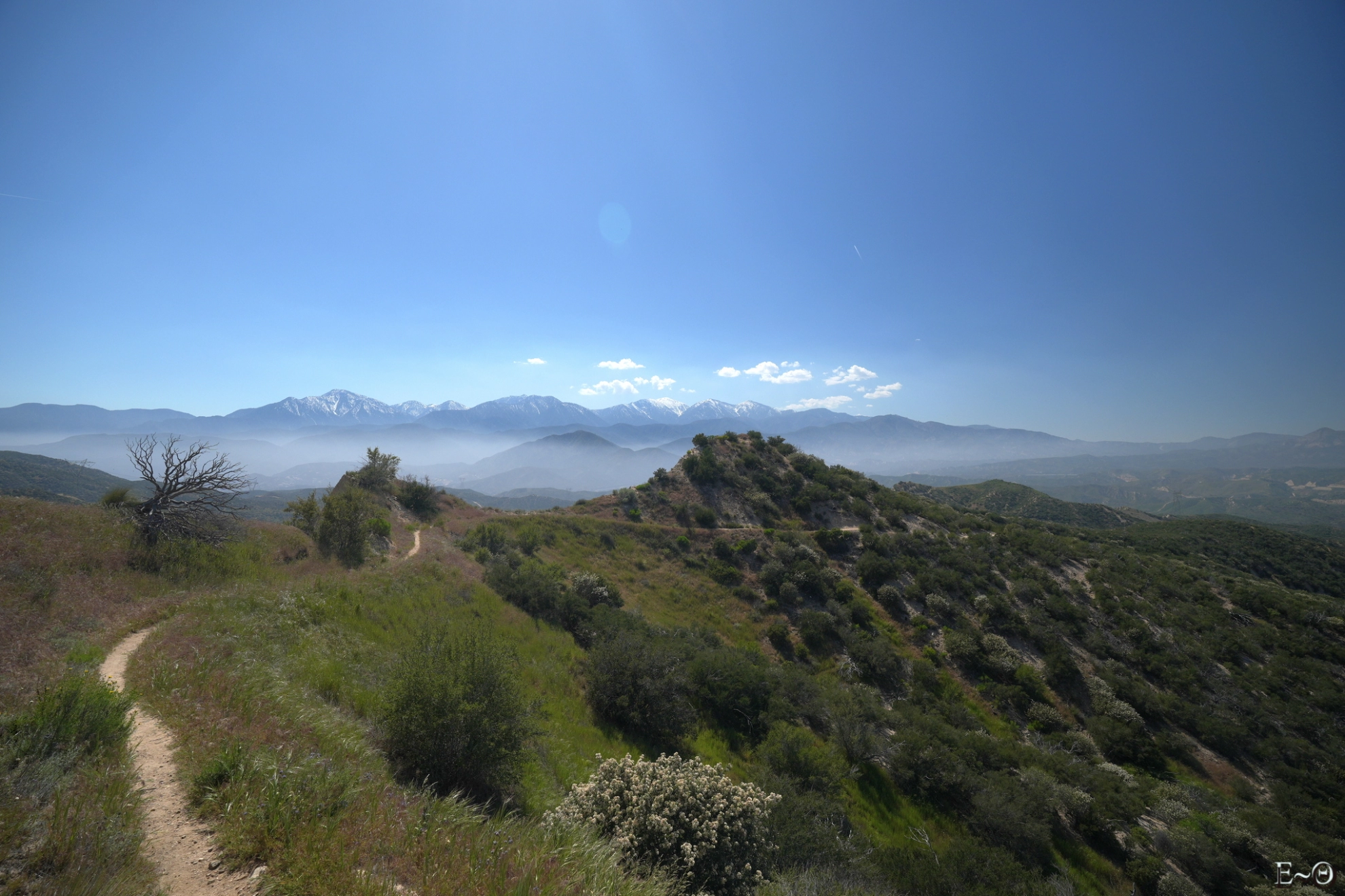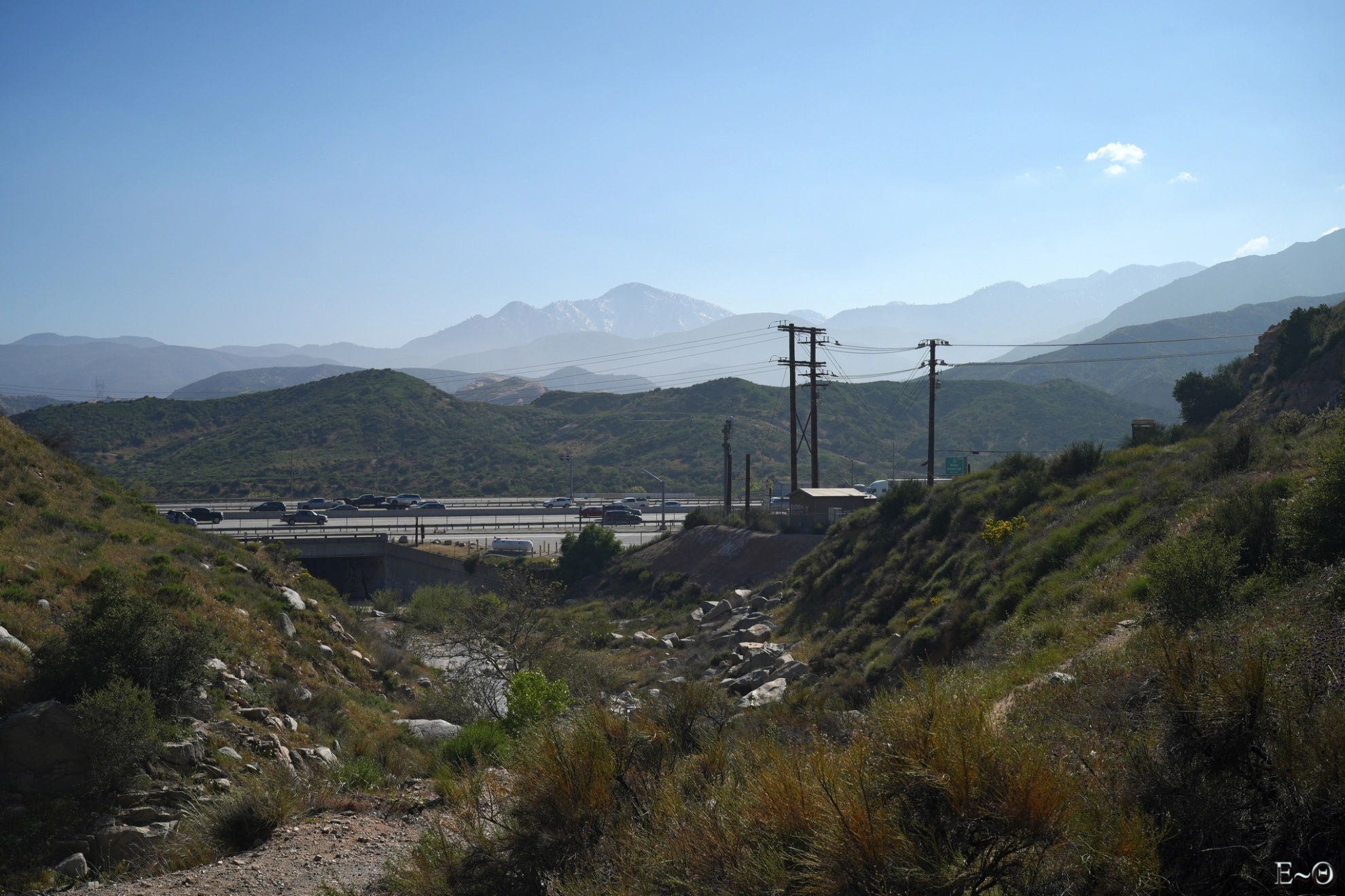 Aujourd’hui, nous devrions arriver à Cajon Jonction. Le PCT croise un Mc Donalds au milieu d’une zone désertique. C’est un lieu classique de pause. Nous partons vers 8 h 30 et retrouvons rapidement le chemin. Nous évoluons toujours parmi les mêmes collines semi-arides le long de Cleghorn mountain, puis de Little Horsethief canyon. La faune est peu présente, sauf des grillons, qui font leurs apparitions sonores. On se croirait vraiment dans le sud de la France. Après une dernière ascension, et quelques serpents quotidiens, nous franchissons un col sans nom qui surplombe une falaise ocre, tas de sable gigantesque avec vue sur le mont Baden Powell, notre prochaine étape, dans trois jours. Le panorama est spectaculaire. Les sommets sont dans une brume qui crée des dégradés de teintes qu’il est difficile de décrire, mélange de blancs, de verts, aux reflets moirés, changeant au gré des vents et des montées et descentes du PCT.