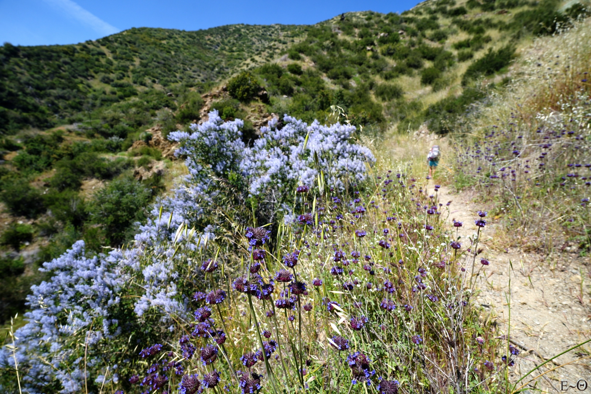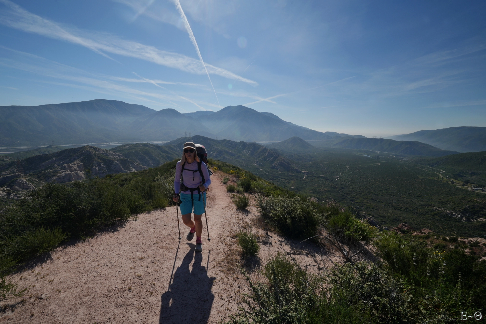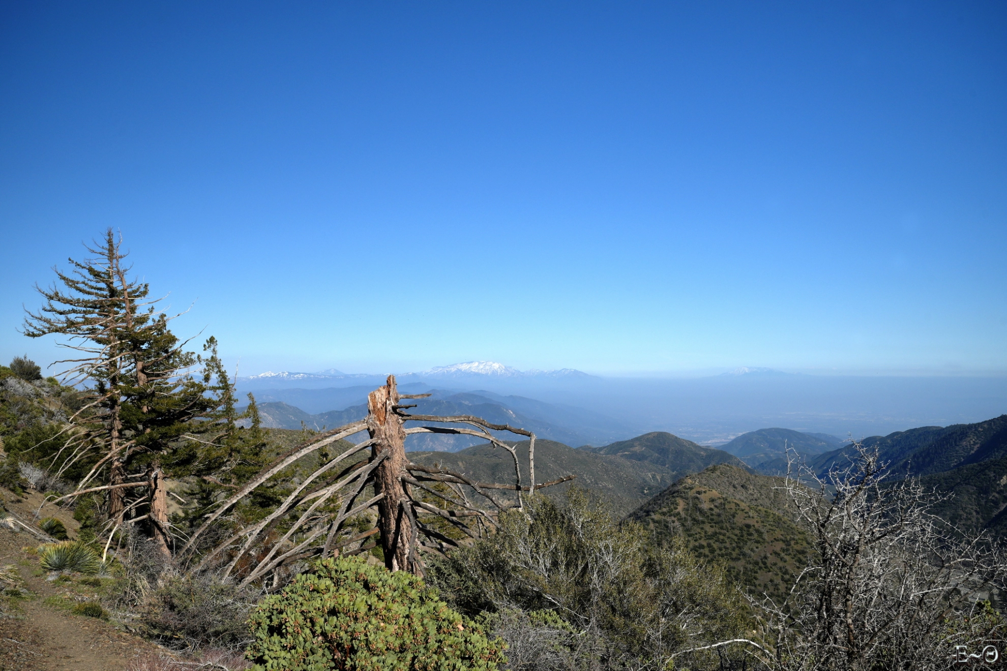 Nous poursuivons la montée le long de Upper Lyttle Creek Ridge, avec une vue en cinémascope sur notre gauche des monts San Gabriel. Ils sont tous enneigés et leurs pentes abruptes plongent dans des vallées et canyons aux couleurs magnifiques. Le ciel est uniformément bleu et nous cuisons lentement sous les rayons verticaux du soleil. Pas de coup de chaleur, mais il faut rester vigilant. S’hydrater et la clé du voyage en ces terres arides.
