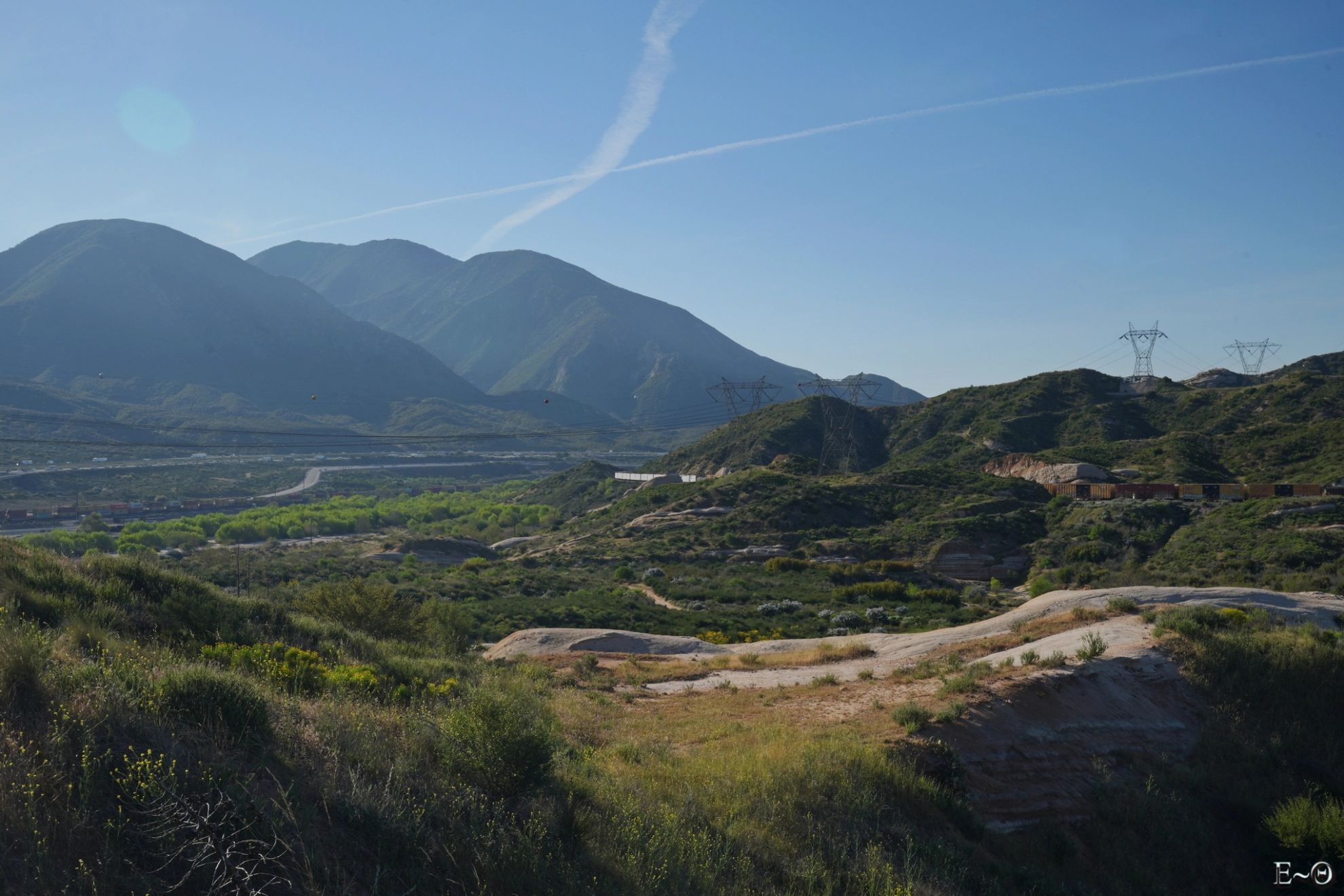 Nous sommes déposés devant le Mc Donald’s de la veille au niveau de Cajon Jonction. Après une rapide descente sur la route, nous retrouvons le PCT. Il s’engouffre sous les voies de communication autoroutières et ferrées, en empruntant différents tunnels en un labyrinthe chaotique. L’endroit est moche, la rivière Crowder Canyon essaie de se faufiler sous les piliers de ponts, entre béton et zones sableuses. Des tags de toutes formes et couleurs ajoutent une touche décalée au lieu. Le chemin est mal tracé, heureusement les marques du PCT nous permettent de nous extraire en une trentaine de minutes. Dire que certains randonneurs dorment ici, pour profiter du restaurant. Entre le bruit omniprésent et l’ambiance de fin du monde, c’est un coup à arrêter son thru Hike.