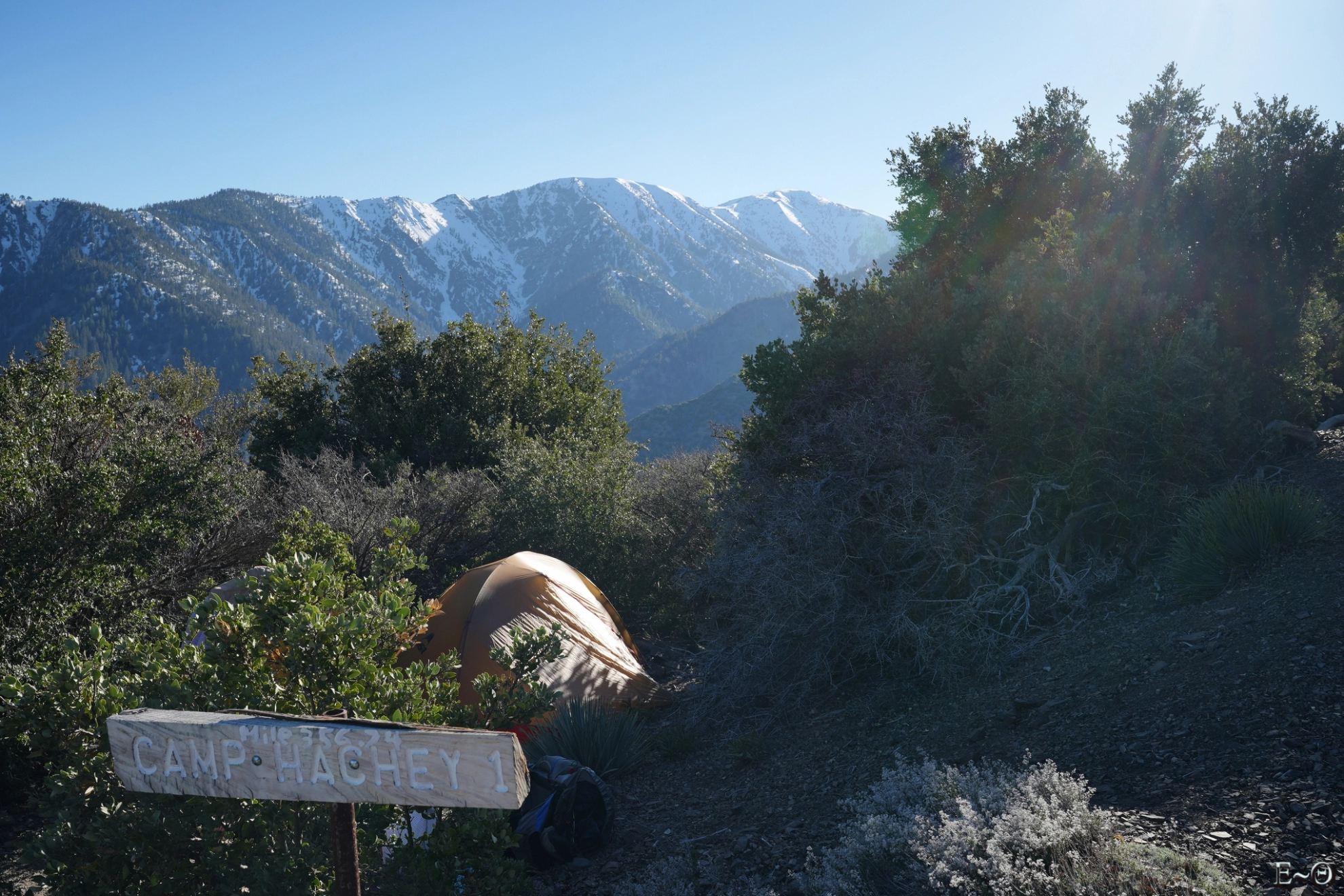 Nous arrivons à notre lieu de couchage vers 18 h 00. Le Camp Hachey 1 est petit, avec deux uniques emplacements. Cela tombe bien, nous sommes seuls. Le campsite est un des plus beaux depuis le départ. Cocon enchâssé entre des chênes verts, nous dominons de plus de 400 mètres le canyon de North Fork Little Creek, juste en face le mont San Antonio, 3068 mètres, nous surplombe de toute sa blancheur. L’emplacement est cinq étoiles et nous mesurons la chance d’être en ce lieu unique.