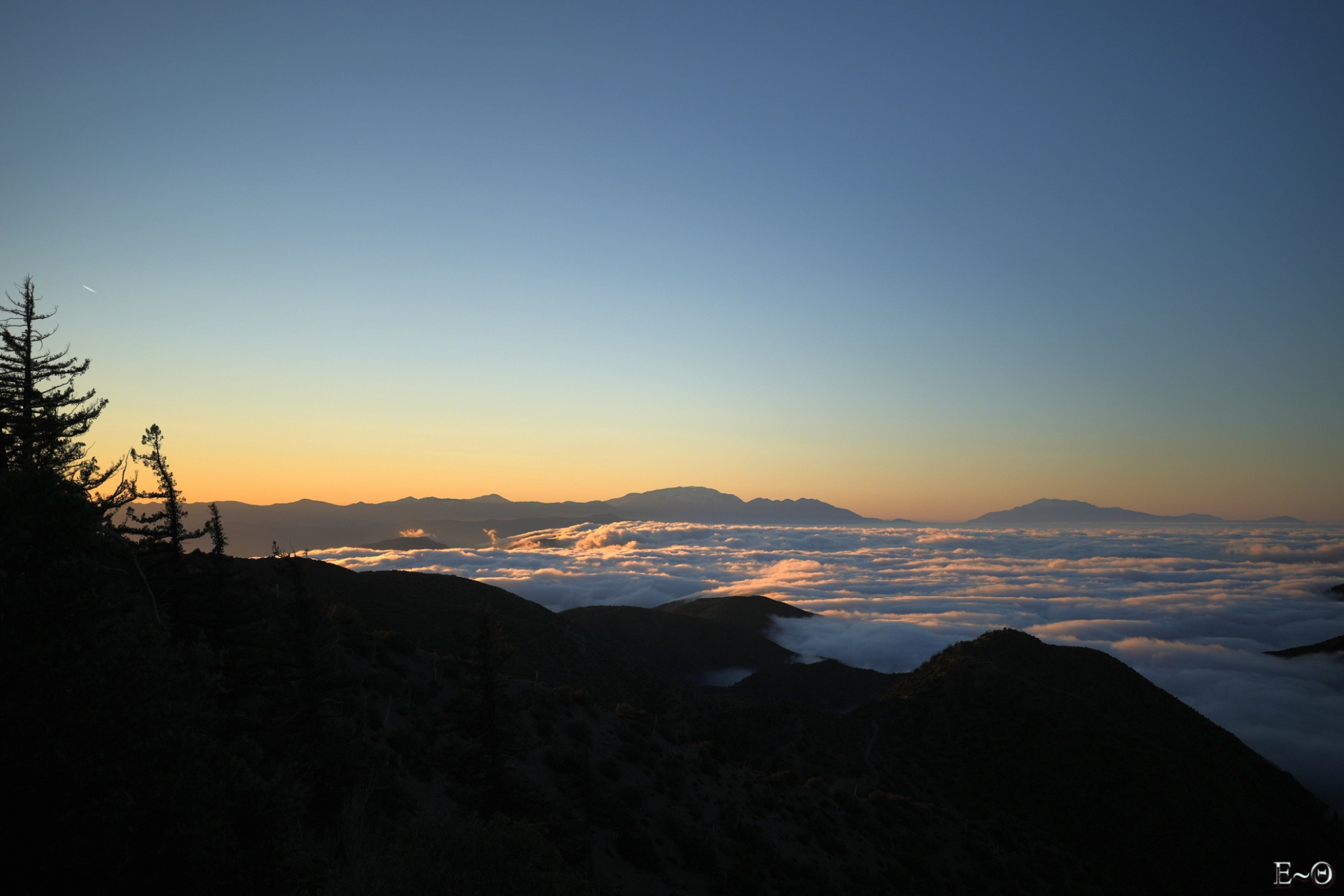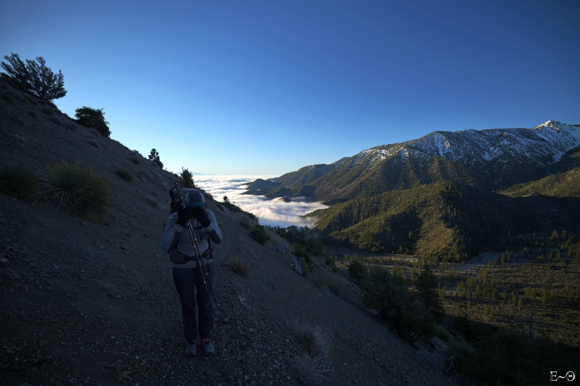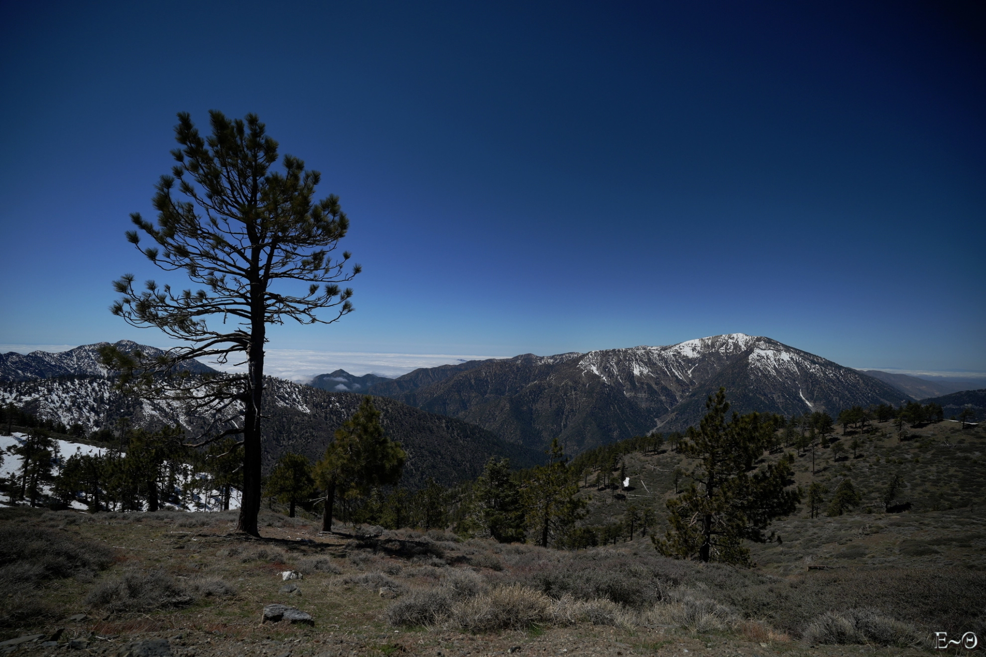Les rayons à l’aube éclairent la vallée et le canyon de North Fork little Creek. La face est du mont San Antonio s’illumine en un gigantesque phare isolé. Les neiges du sommet changent de teintes au fur et à mesure que le soleil sort de sa torpeur. Au loin, vers le sud, le massif des monts San Bernardino émerge d’une mer de nuage, qui s’étend à perte de vue sur les plaines de la Californie. Une palette de couleurs, d’un rouge sang carmin jusqu’au bleu noir de la nuit qui s’éloigne, explose en un kaléidoscope cyclopéen et font de ce moment un instant rare pour les yeux.