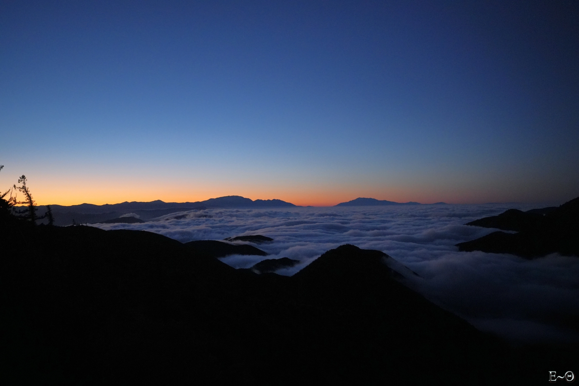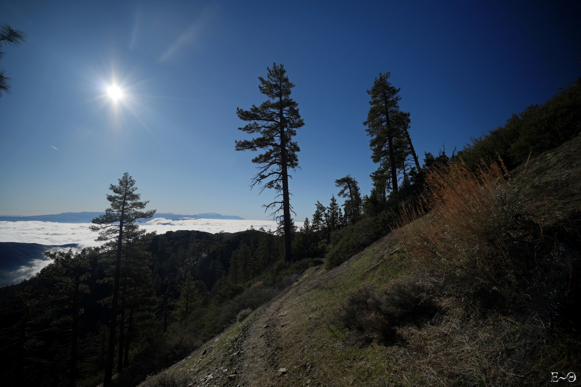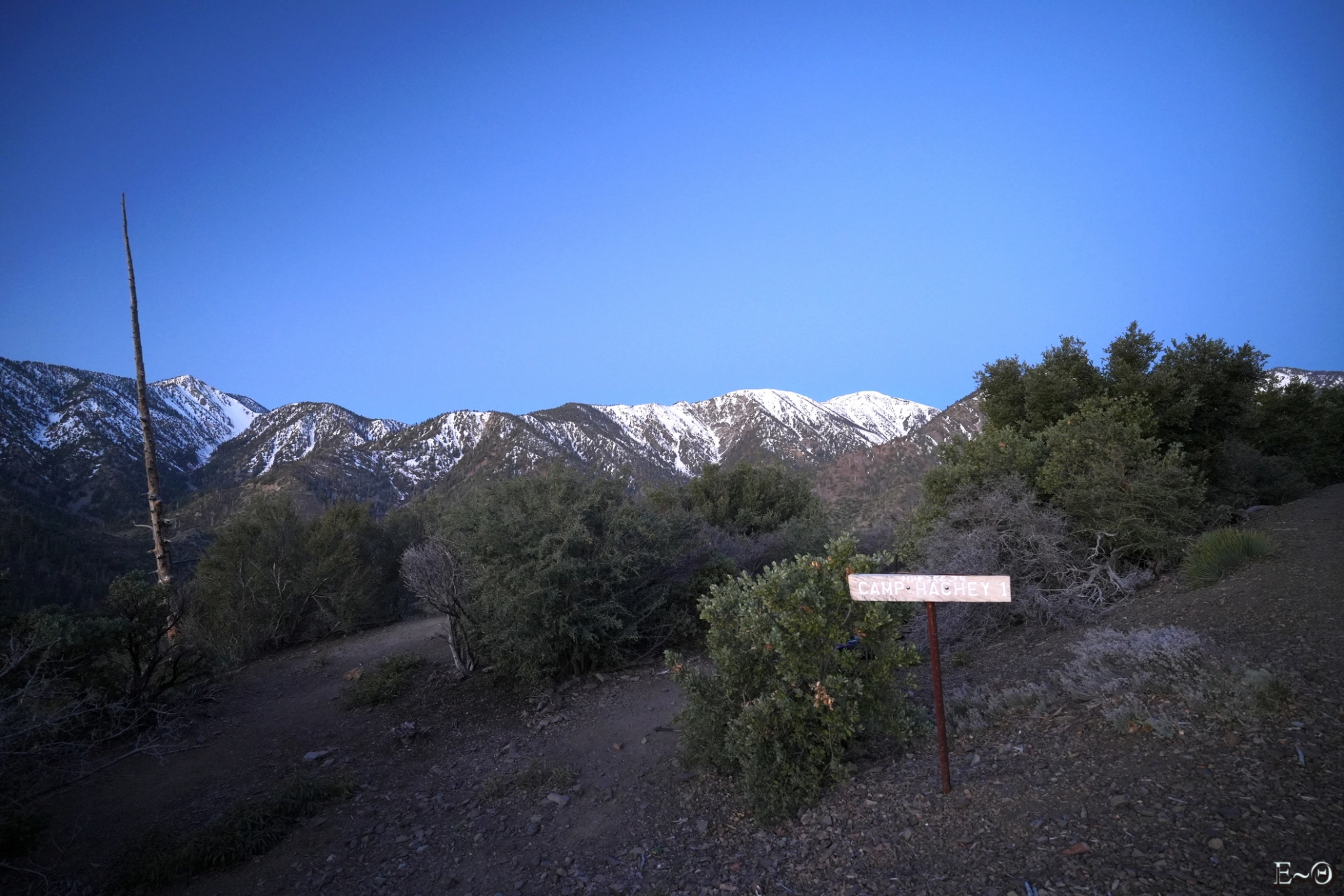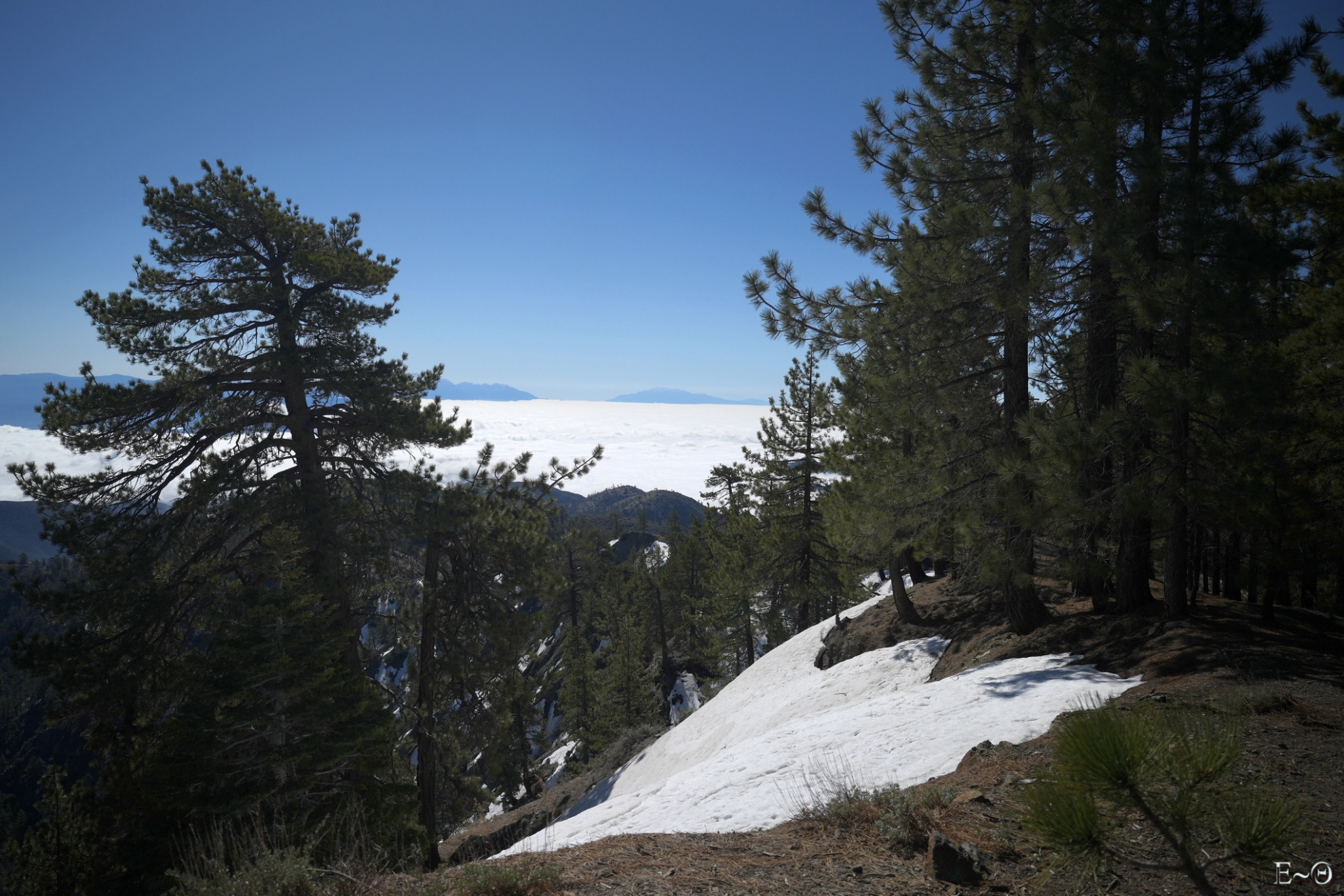 Les rayons à l’aube éclairent la vallée et le canyon de North Fork little Creek. La face est du mont San Antonio s’illumine en un gigantesque phare isolé. Les neiges du sommet changent de teintes au fur et à mesure que le soleil sort de sa torpeur. Au loin, vers le sud, le massif des monts San Bernardino émerge d’une mer de nuage, qui s’étend à perte de vue sur les plaines de la Californie. Une palette de couleurs, d’un rouge sang carmin jusqu’au bleu noir de la nuit qui s’éloigne, explose en un kaléidoscope cyclopéen et font de ce moment un instant rare pour les yeux.