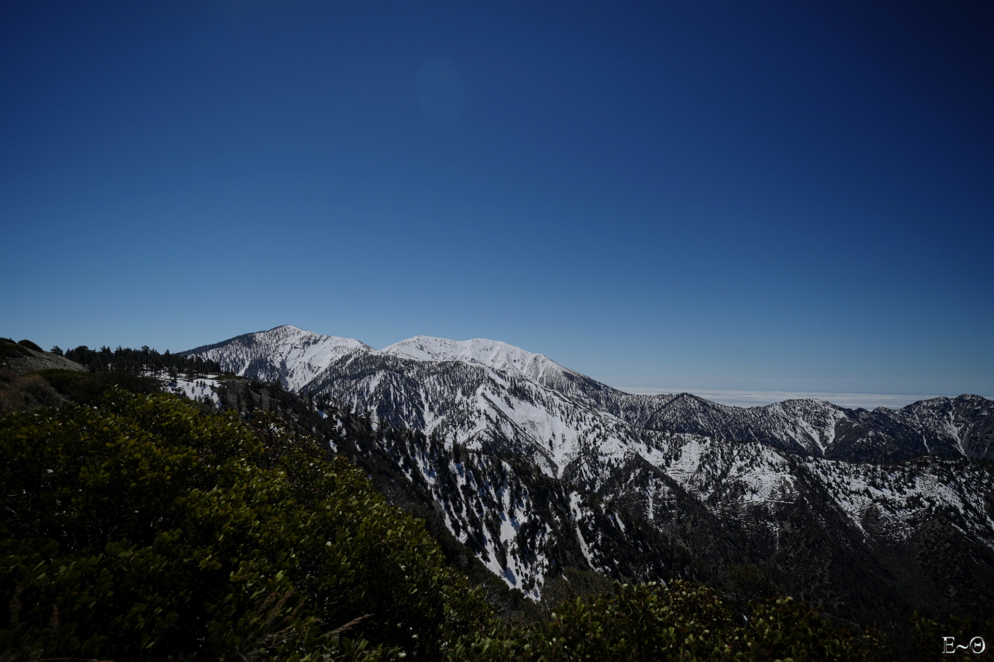 L’étape n’est pas passionnante. Le PCT est encombré par des monticules de neiges dans les pentes Est. L’importante inclinaison à plus de 60° de certaines sections va nous faire préférer le chemin forestier en flanc ouest. Nous ne sommes pas perdants, au lieu d’une vue sur la vallée où se trouve Wrightwood, nous avons un panorama sur un nombre impressionnant de sommets enneigés, Etiwanda peak, Timber Mountain, Telegraph Peak, Mount Harwood, San Antonio et enfin le Baden Powell.