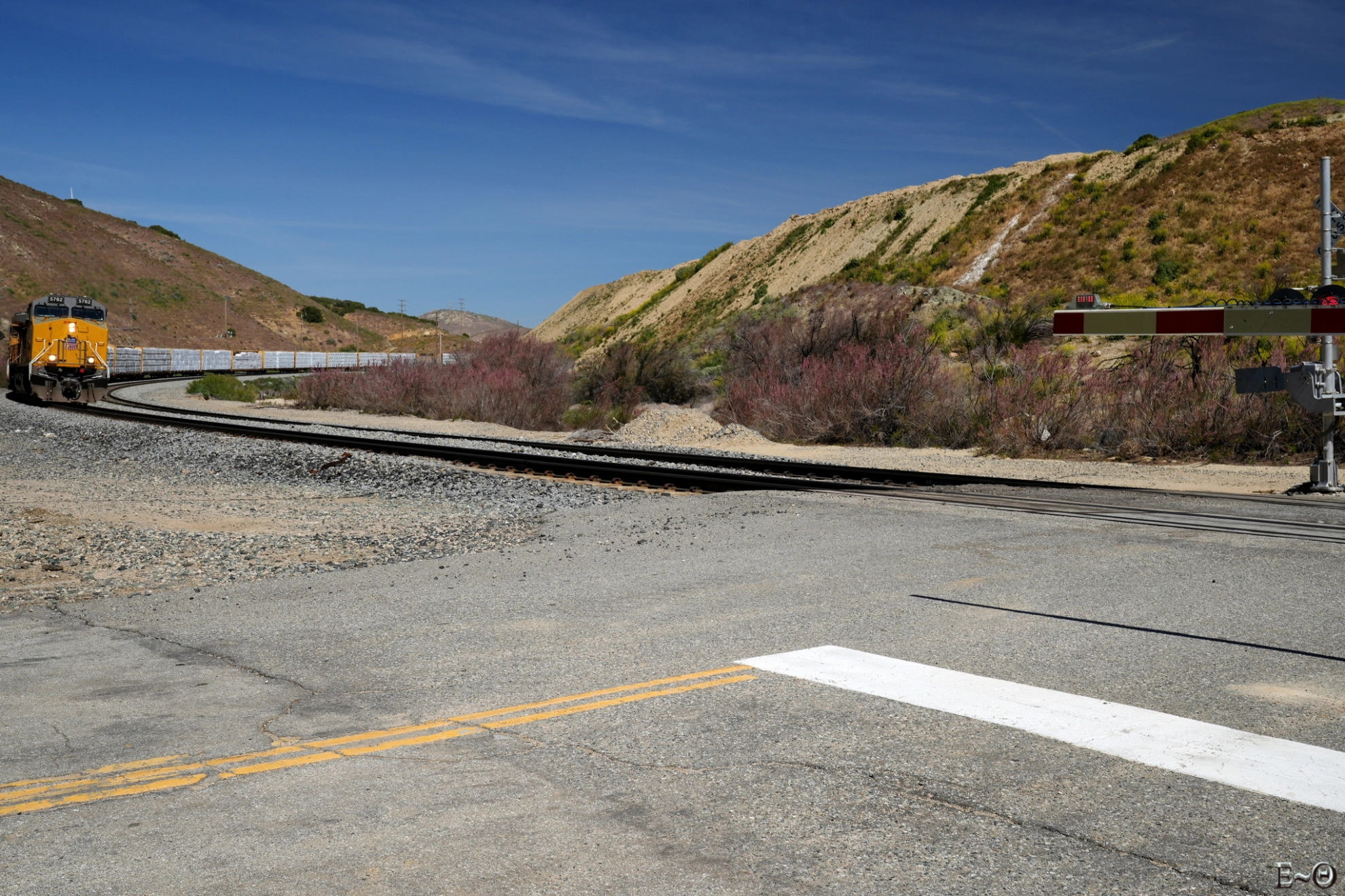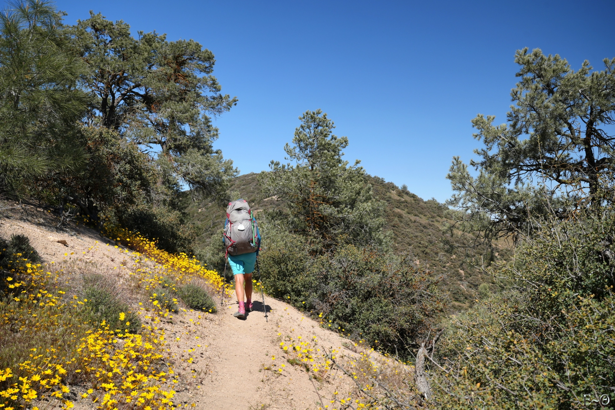 Nous arrivons au col de Tehachepi après une descente rapide dans Cameron Canyon, dans une forêt de Joshua Tree. Nous quittons officiellement SoCal pour la Sierra. Nous patientons quelques minutes le temps de laisser passer un train de plus de deux kilomètres, puis franchissons l’autoroute CA 58 sur un pont. Le flot de véhicules est ininterrompu. Après avoir trouvé la water cache au croisement des routes et du PCT, et remplit nos gourdes, nous entamons une montée de plus de 5 kilomètres et 500 mètres sur une montagne sans nom. Nous longeons le canyon de Waterfall que nous devrions franchir dans dix kilomètres. Après celui-ci nous devons marcher encore deux heures pour atteindre le campement que nous avons repéré. Il est situé en face est des collines qui entourent Cache Peak.