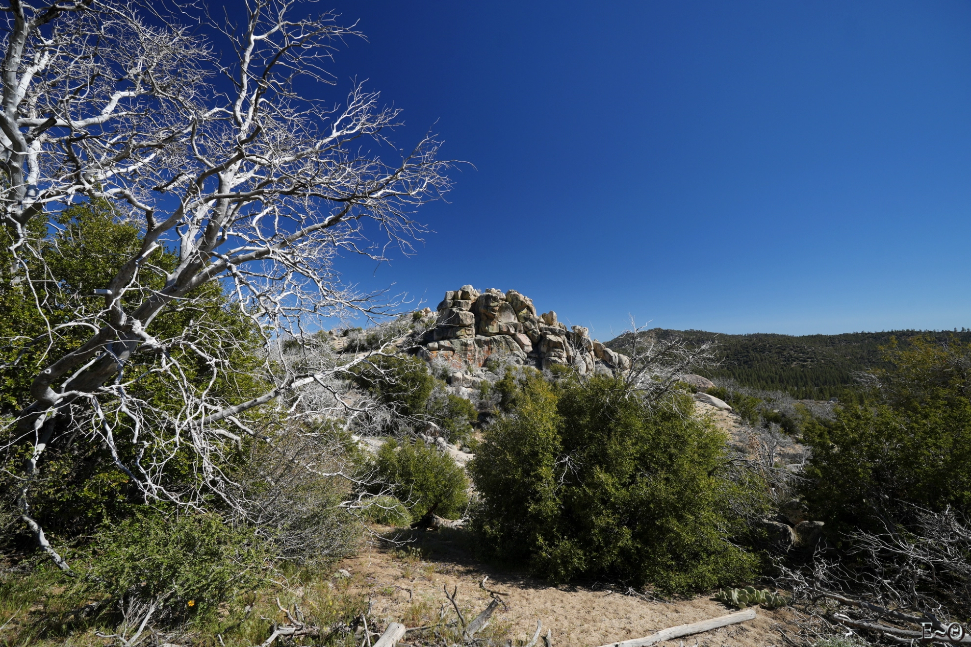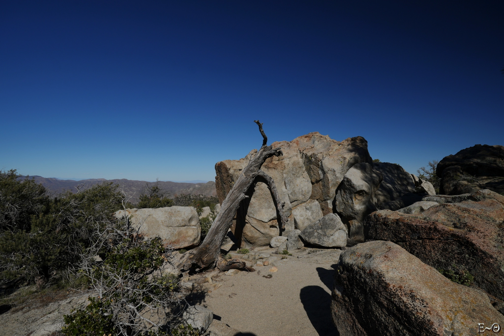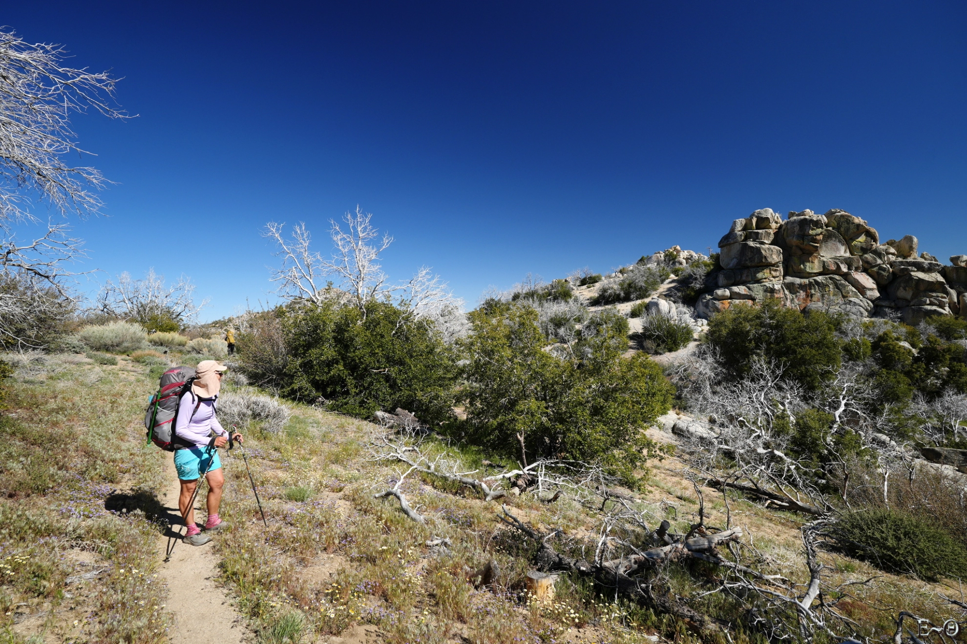 Je me charge de 6 litres et remontons. Nous rencontrons plusieurs autres randonneurs qui font de même. Au croisement du chemin et du PCT, Hélène est devenue préposée à la surveillance des sacs à dos que les hikers ont laissés. Effectivement, faire la marche avec les sacs à l’aller et au retour est inutile. Nous avons fait à l’identique. Nous repartons, après qu’Hélène se soit réhydratée, pour onze kilomètres.