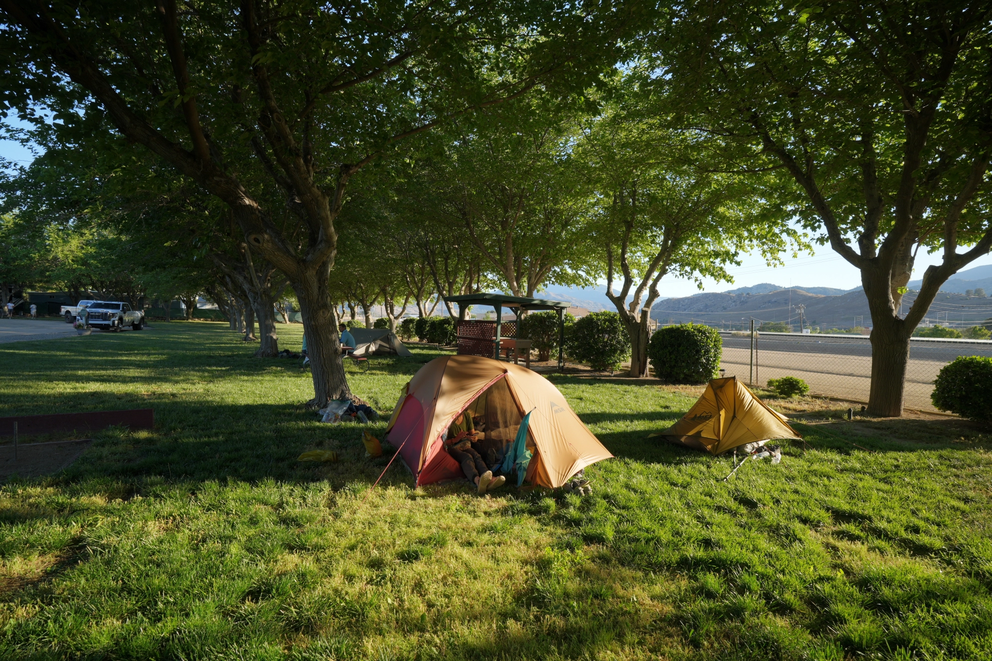 Le lieu est grand et bien conçu. Par contre, le gérant, un ancien militaire, accueille Janet froidement. On devine que les PCTistes sont une population qu’il tolère et que nous ne sommes pas plus bienvenues que cela. Peu importe, la pelouse est plate, verte, et à l’ombre. Un vrai golf. La douche est trois étoiles, même si nous devrons la prendre 3 fois pour être enfin propres. La lessive est faite rapidement, aidée par d’autres campeurs qui nous donnent de la poudre.