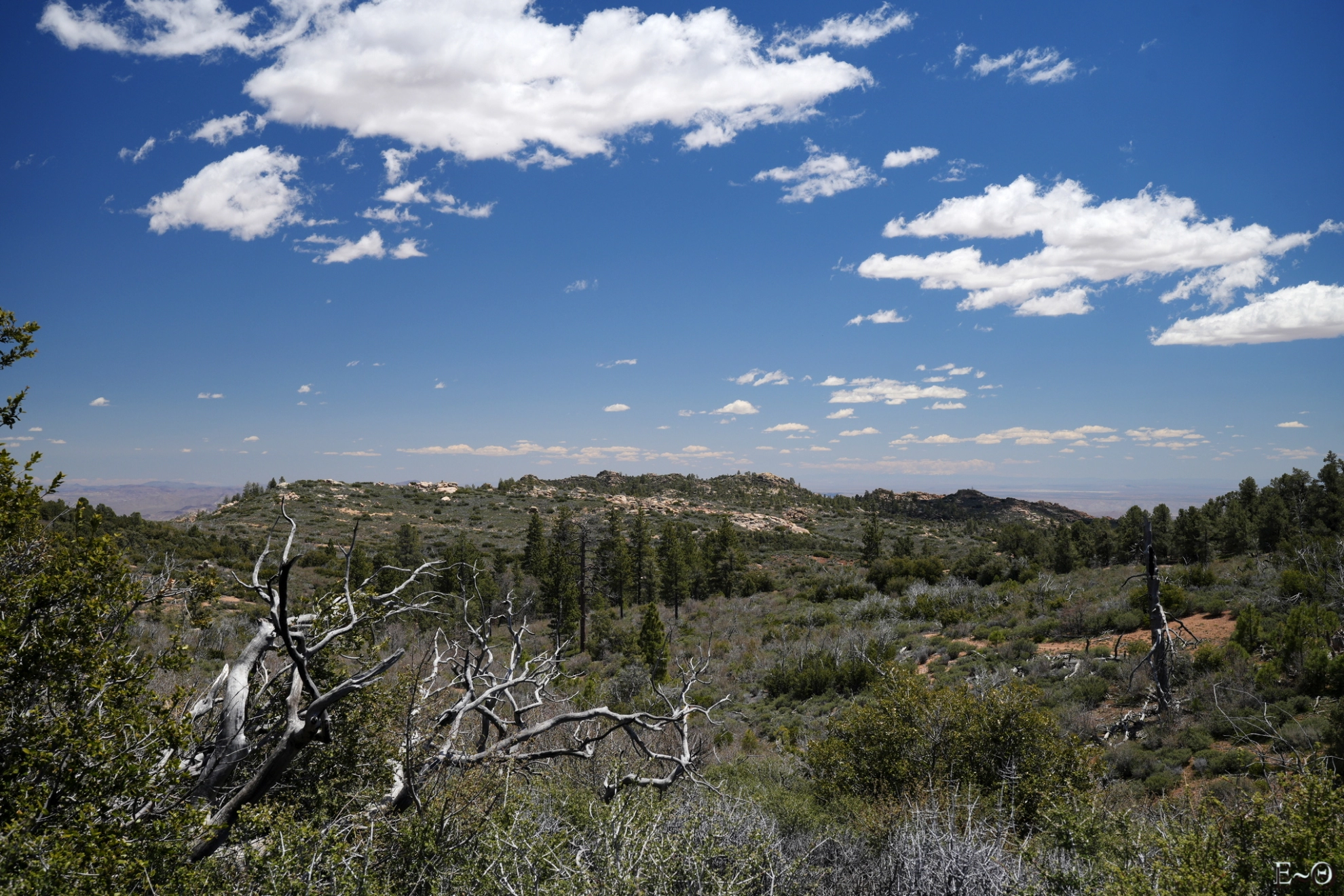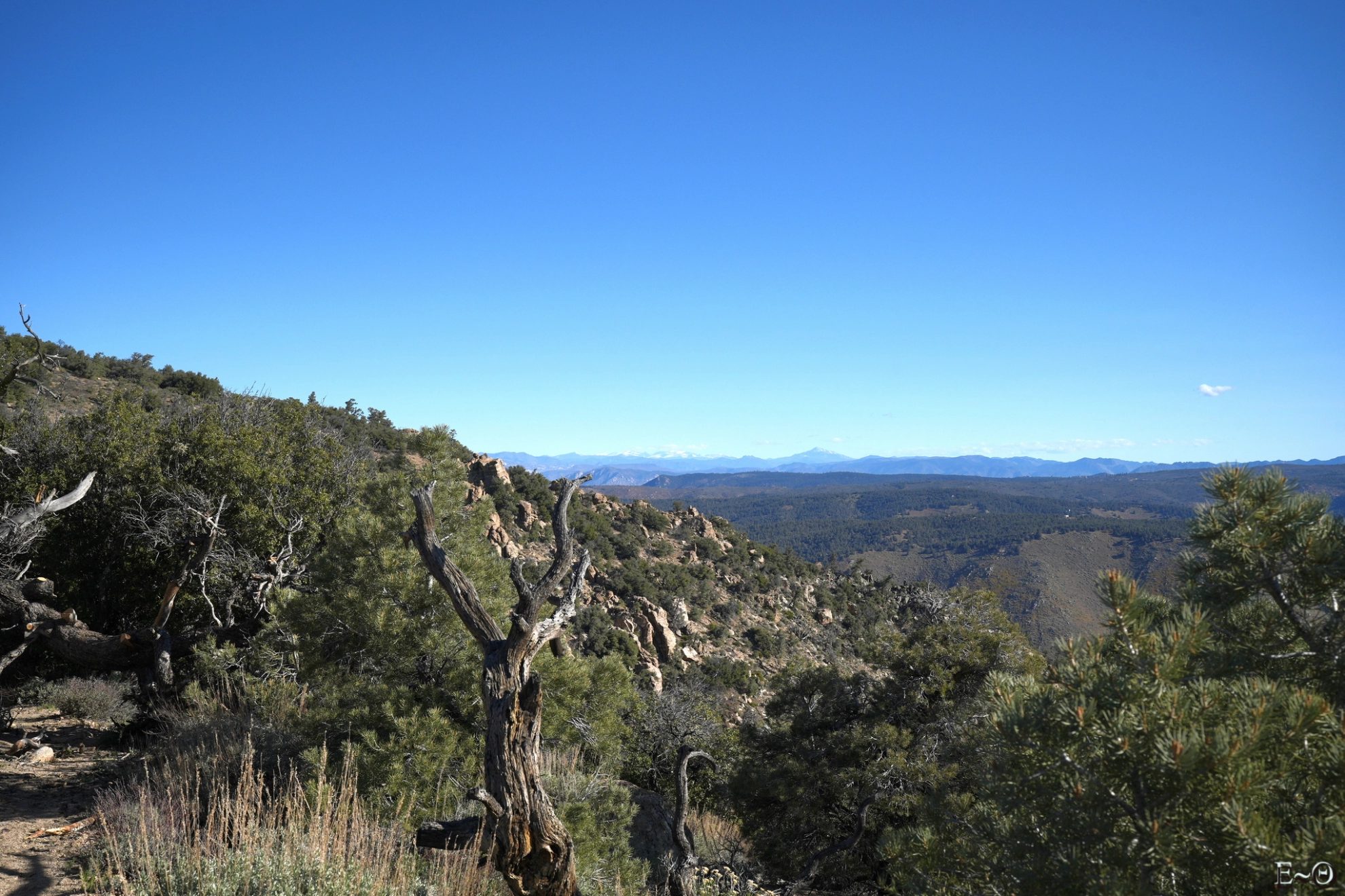 Nous continuons à évoluer dans un environnement de colline et les paysages changent peu. Au détour d’un col, nous avons soudainement une vue sur la Sierra et le mont Whitney. Les sommets sont à la fois proches et distants. L’endroit est vraiment extraordinaire. C’est le dernier moment ou nous voyons les montagnes enneigées au sud, marches lointaines, tout en devinant les prochaines aventures qui se dessinent au loin. C’est encore bien blanc et nous sommes maintenant sûrs que dans une semaine nous marcherons dans la neige.