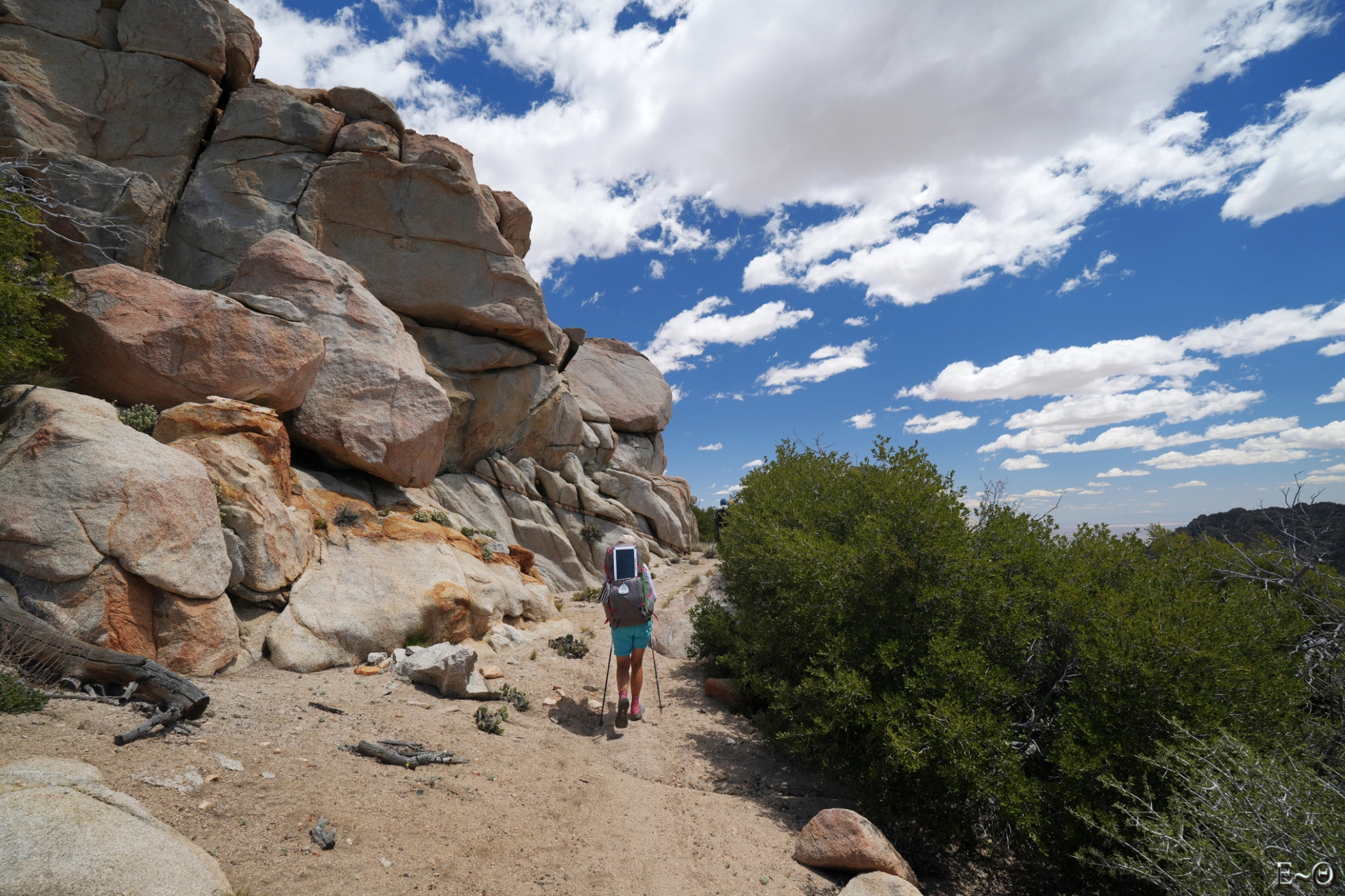 Après avoir évolué le reste de la journée sur une crête ouverte qui franchit plusieurs départs de canyons immenses, Sage, Boulder, Cow Heaven, Smith, nous arrivons au vingt cinquième kilomètres au départ de la descente de Walker Pass. C’est étonnant, on a l’impression que le chemin se jette littéralement dans de grandes pentes sans fonds. C’est presque le jumeau de la montée de ce matin, 500 mètres pour 7 kilomètres. L’environnement est austère, orienté plein ouest. L’avancée est une vraie épreuve. Il n’y’a plus d’air, un soleil de fin d’après-midi omniprésent, et plus du tout de possibilité de se ravitailler en eau. Ce sera par moment franchement pénible. Les couleurs, la persistance du bloom flower compensent et nous progressons du mieux que nous pouvons. Nous rattrapons Janet en cette fin de journée. Elle était partie plus tôt ce matin. Elle n’était pas sereine sur ses capacités physiques. Elle doutait d’arriver à marcher 20 miles en plein soleil. En pratique, elle est fatiguée ce soir, mais avance encore d’un bon pas. À 64 ans, c’est une vraie machine.