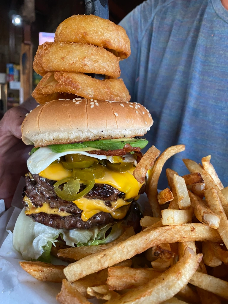 Nous sommes sur tous les fronts dès le matin. Nous déjeunons, puis dînons au restaurant Grumpy’s, où nous dévorons hamburgers géants de 25 cm de haut avec 3 viandes, avocats, puis milk shakes et pancakes d’un kilogramme. On arrive presque à finir nos assiettes, seul le pancake résiste. Il est vraiment effrayant et peu de randonneurs parviennent au bout de celui-ci. C’est un challenge bien connu que « the beast ». Les repas font au minimum entre 3000 et 5000 kcal. Hélène va d’ailleurs faire sensation en attaquant le burger Triple Crown Burger. C’est démesuré, colossal, un vrai scandale diététique. Celle-ci réussira à le terminer, à la grande surprise de la serveuse. Elle viendra dire à Hélène que c’est injuste, les randonneurs mangent de façon honteuse et malgré cela ils perdent du poids ! « It’s a shame, despite your incredible diet you’re losing weight! »